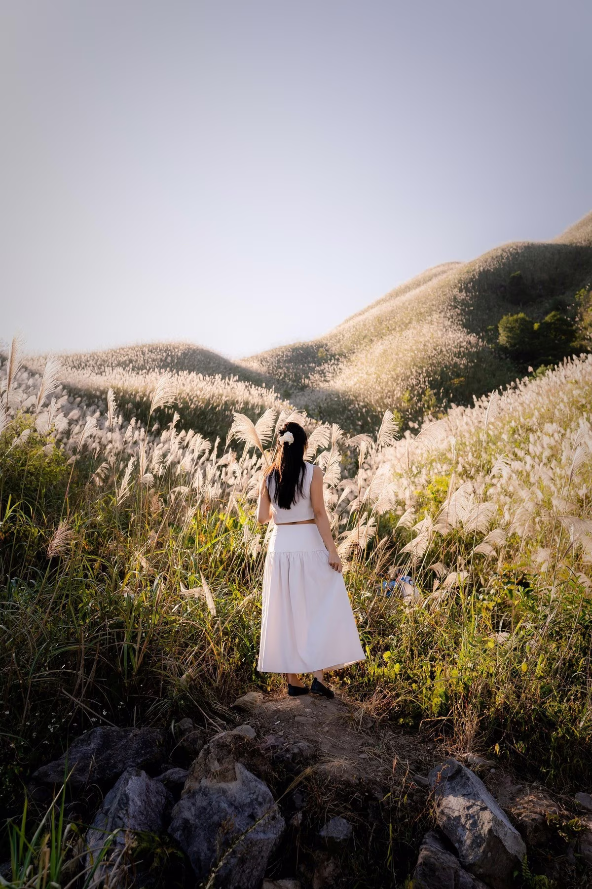 Immerse yourself in the enchanting beauty of Moc Chau's pink grass hill in the Northwest highlands. This stunning photo captures a muse in a pristine white dress, captivated by the romantic autumn scenery. Endless vibrant pink grass carpets create a captivating natural painting, inviting visitors to check-in and capture beautiful pink grass field photos. This is an ideal destination for those seeking peace and dreamy beauty, reminiscent of a fairytale setting. Explore Moc Chau this season for a unique travel experience and fully enjoy the irresistible charm of this land.