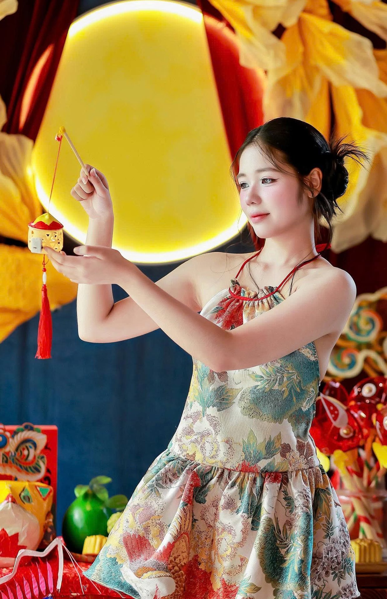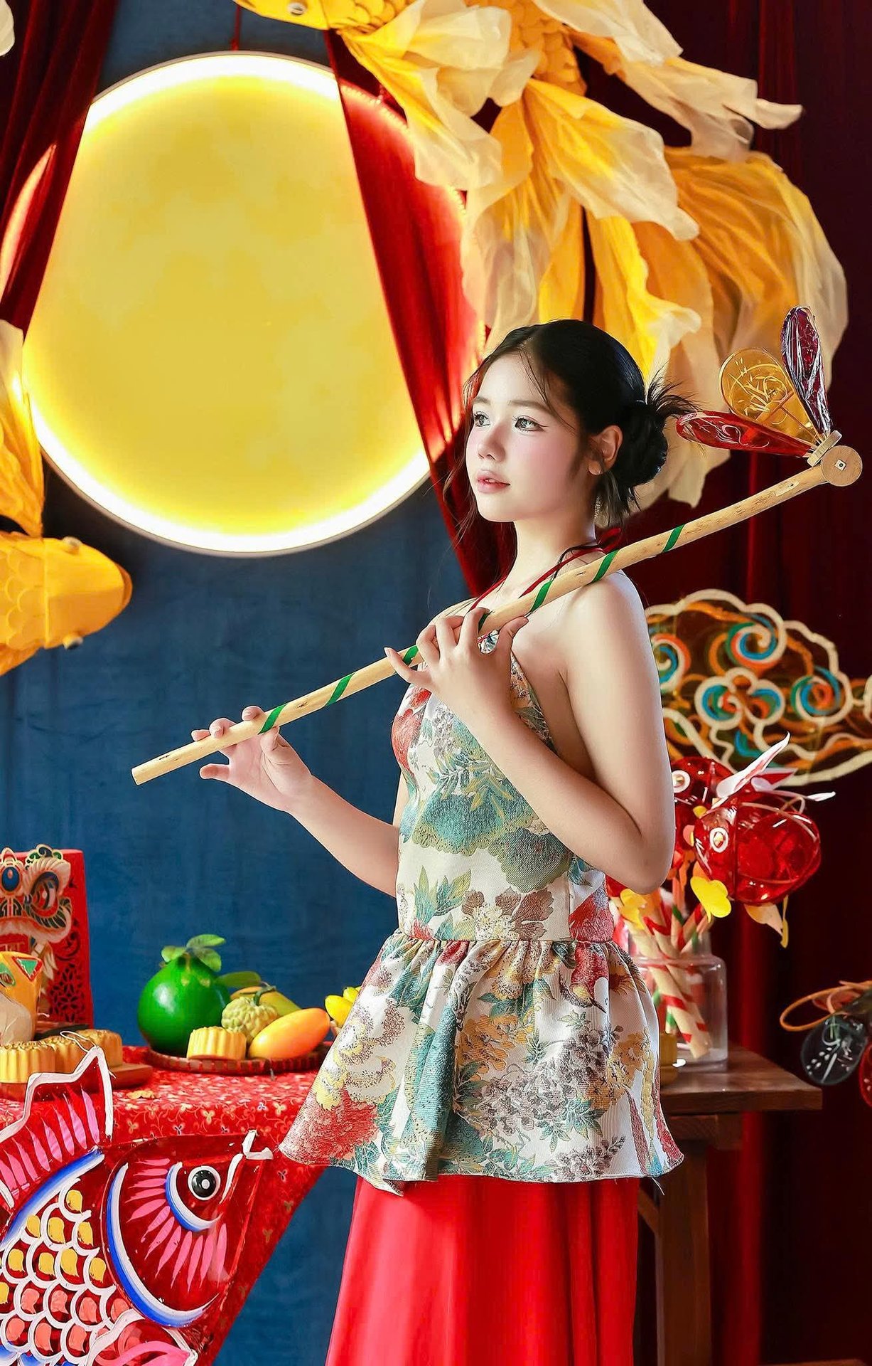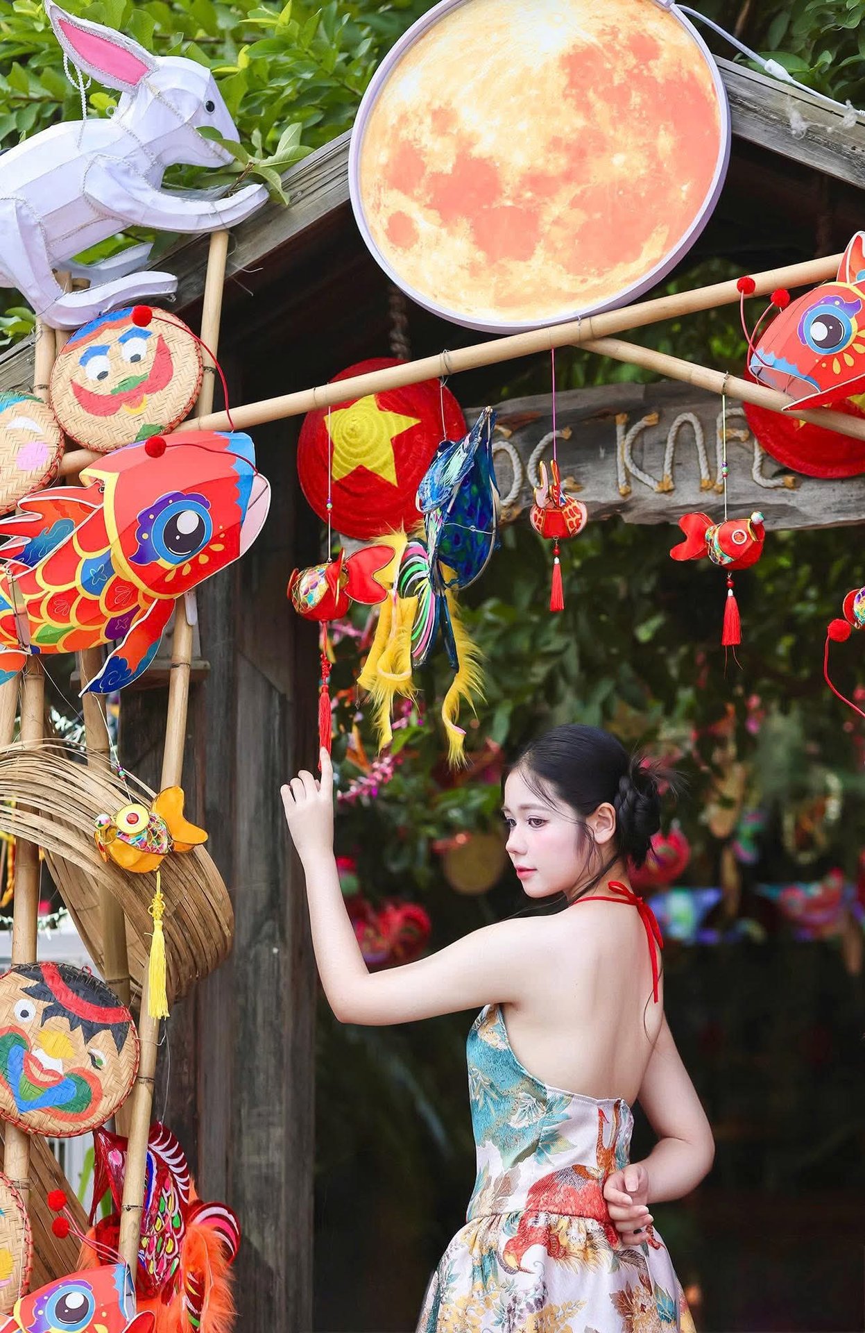This MTYH Vol.224 image captures the gentle beauty of a young woman amidst a vibrant golden late autumn field. The beautiful girl with long hair and a pristine white dress sits gracefully among the dry grasses creating a poetic and romantic scene. Golden sunlight bathes the entire setting highlighting her delicate features and elegant charm. This moment represents a harmonious blend of human beauty and nature offering a sense of peace and tranquility. She exudes a feminine and captivating allure perfectly blending into the romantic late autumn natural landscape.Traditional Vietnamese Mid-Autumn Festival: Girl amidst Vibrant Cultural Colors