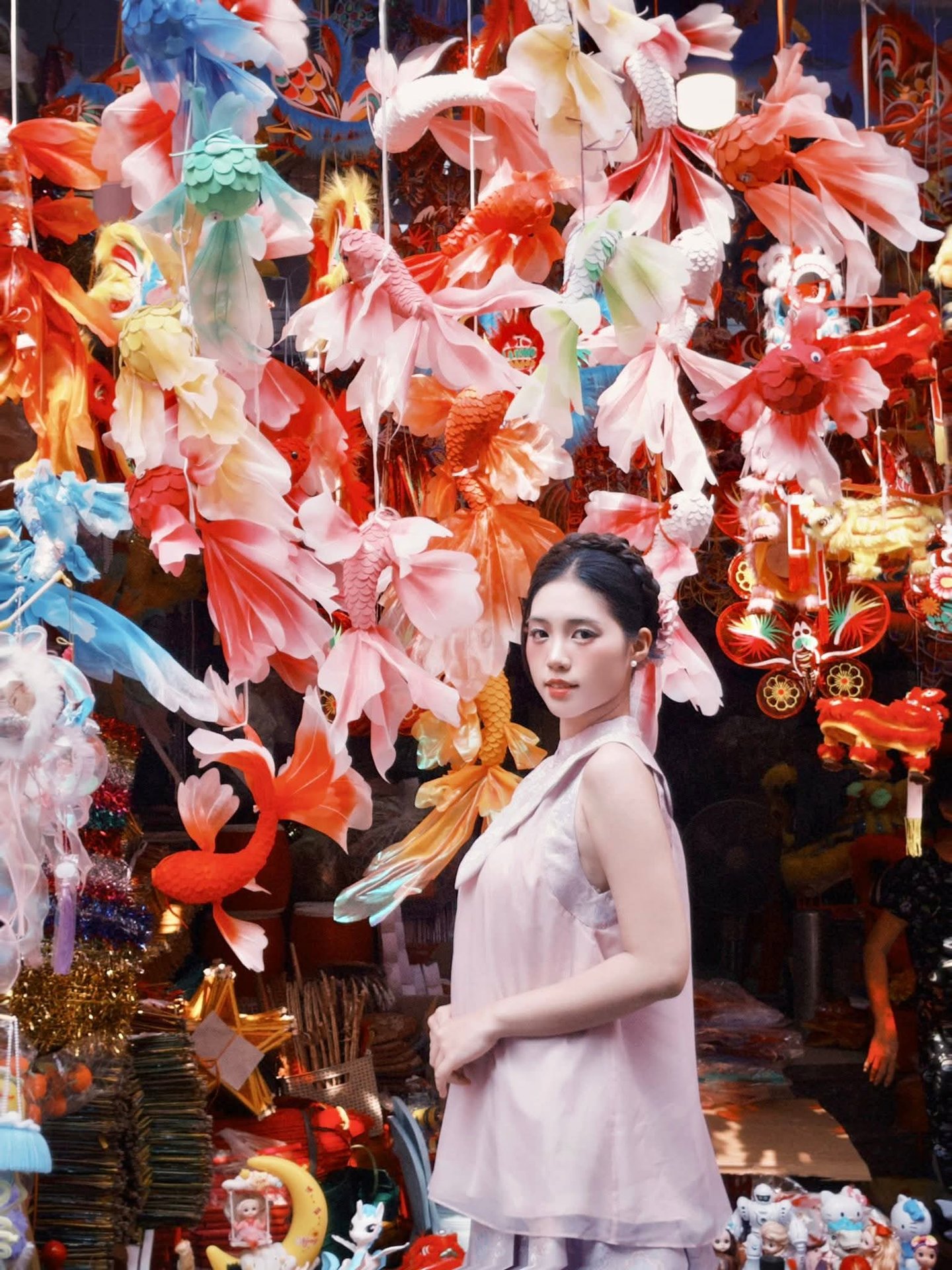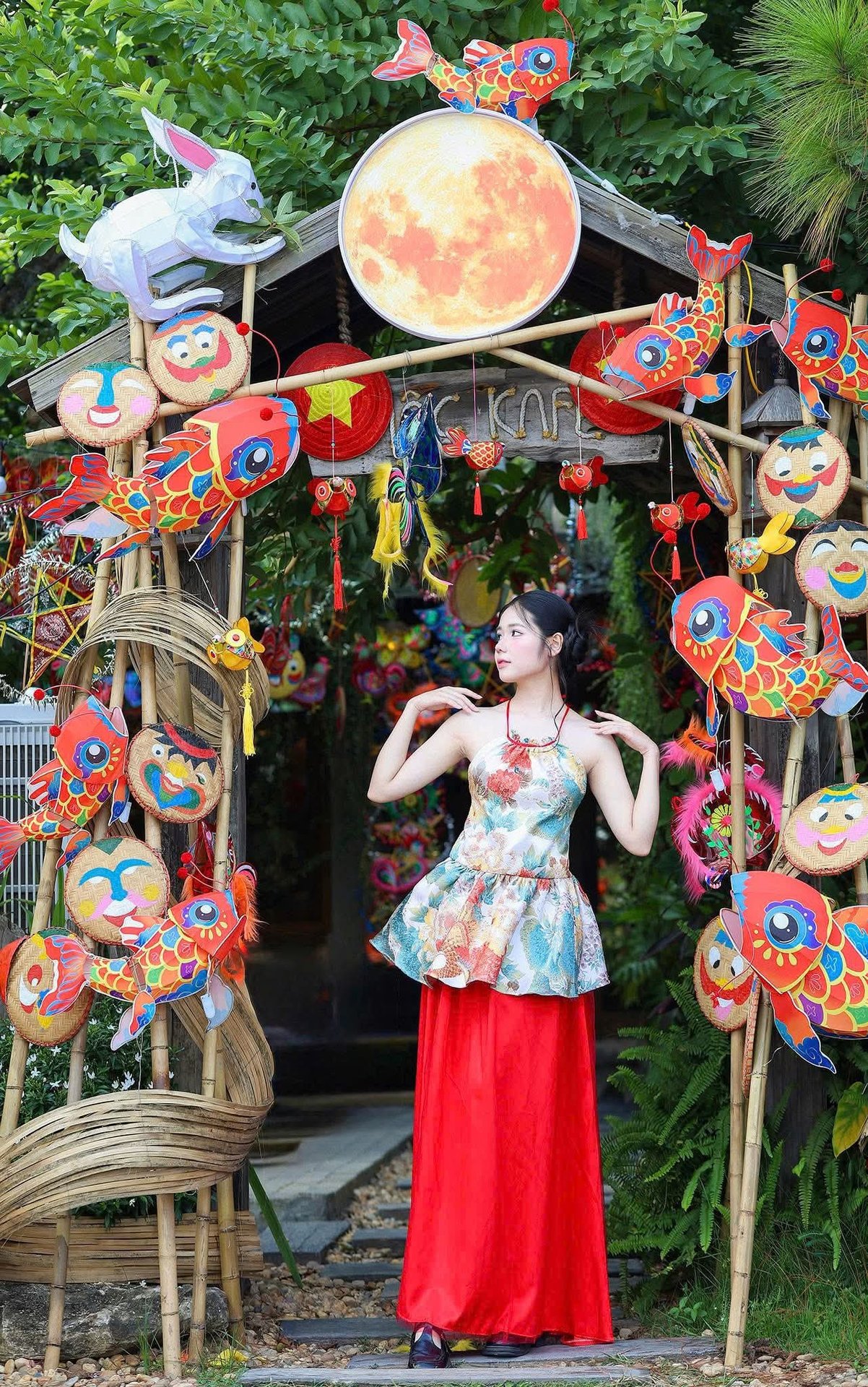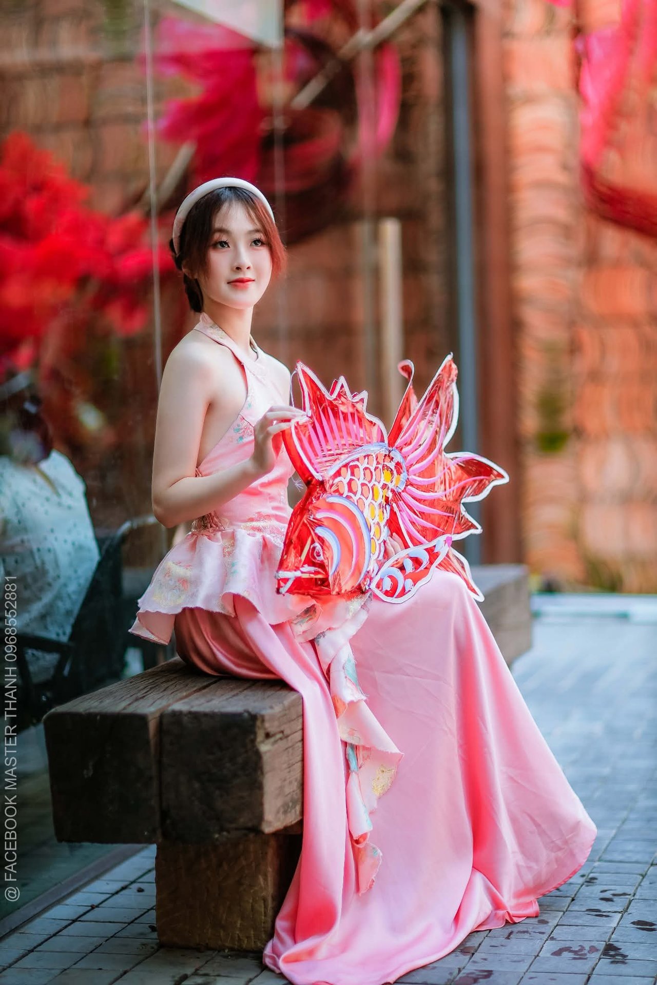 This exquisite photograph captures a young woman with elegant and gentle beauty standing amidst a vibrant array of carp lanterns. This is a familiar image associated with Vietnams traditional Mid-Autumn Festival. The shimmering light from these handcrafted lanterns creates a magical backdrop enhancing the girls graceful charm. She embodies the essence of national culture evoking a warm nostalgic feeling for traditional values. The image is not just a beautiful moment but also an invitation to explore the richness of Vietnamese culture where festivals like Mid-Autumn always carry a strong identity and community spirit. Her beauty harmonizes with the festive atmosphere spreading joy and pride in the traditional cultural heritage.