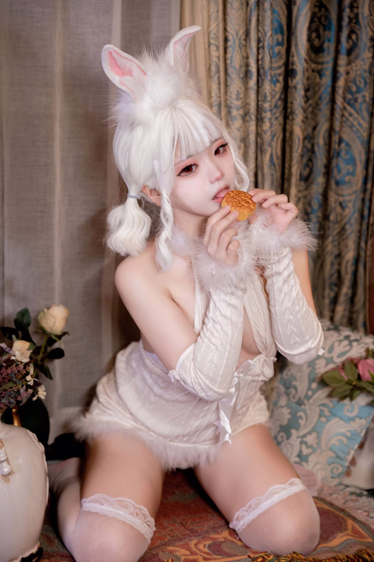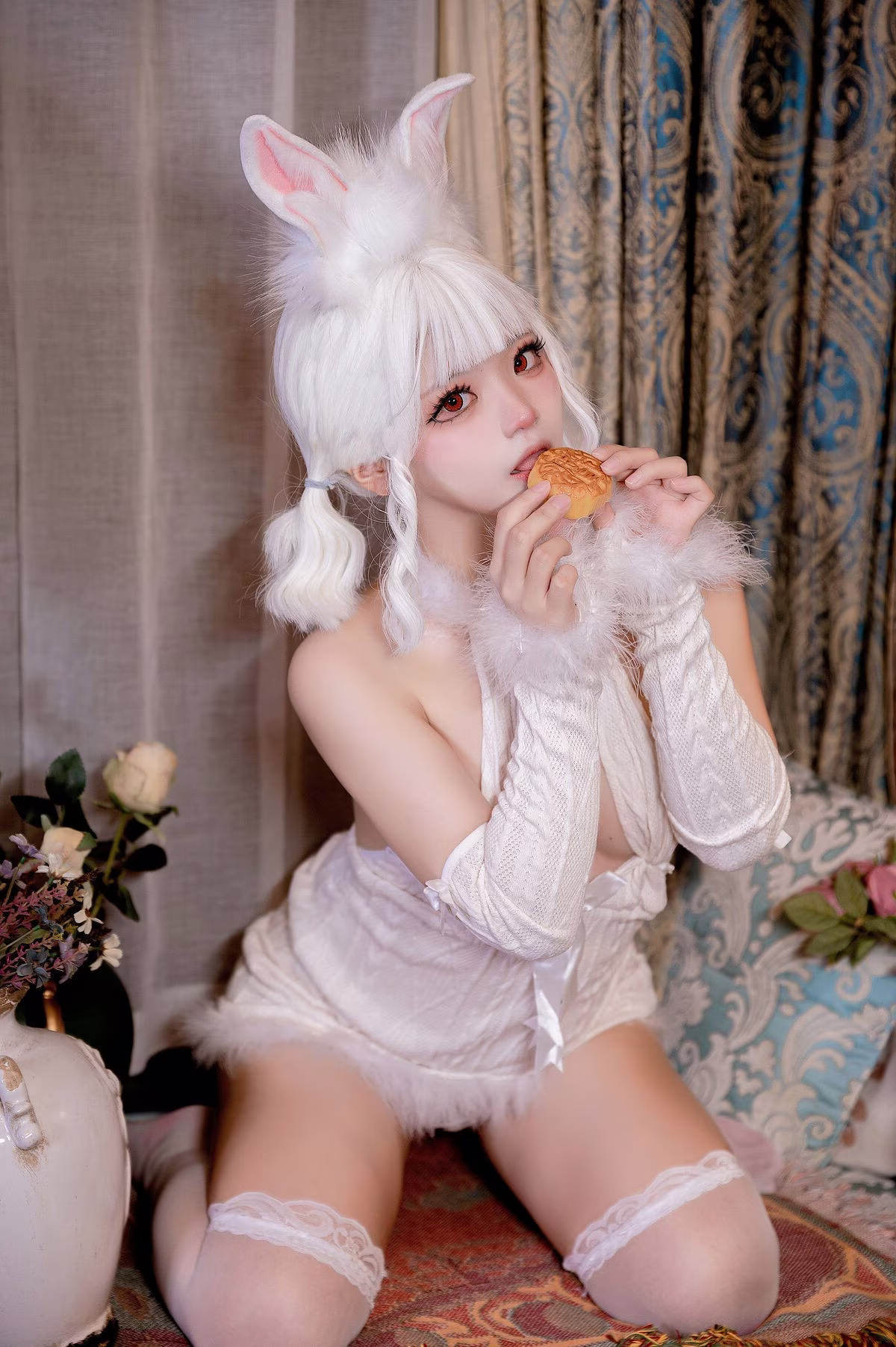 Immerse yourself in the enchanting beauty of Coser Yi Miao Jun in her Mid-Autumn Gift photoshoot. Transformed into a pure yet undeniably alluring white bunny girl Yi Miao Jun gracefully showcases her slender figure and sweet demeanor. The pristine white bunny costume complete with adorable bunny ears a captivating corset and soft furry gloves creates an image that is both innocent and irresistibly charming. Every small detail from her flowing platinum hair to her mesmerizing eyes contributes to a perfect portrait sparking curiosity and admiration. This collection is truly a special Mid-Autumn gift promising surprise and delight for fans.