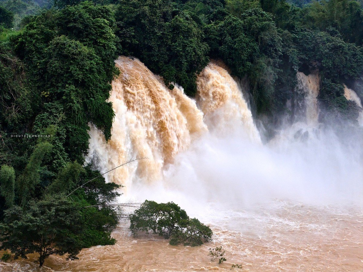 This stunning photograph captures the majestic beauty of Ban Gioc Waterfall in autumn a magnificent natural icon nestled in the Vietnam China border region Though not a scene of stormy floods the water still cascades powerfully creating white silken ribbons amidst the endless green of Cao Bangs mountains and forests The waterfalls splendid beauty blends harmoniously with the lush vegetation and clear blue sky forming a vibrant natural masterpiece full of life It is an ideal destination for those seeking to explore unique landscapes and immerse themselves in the tranquility of the mountainous region Ban Gioc Waterfall is not merely a natural wonder but also a source of pride for Vietnamese tourism