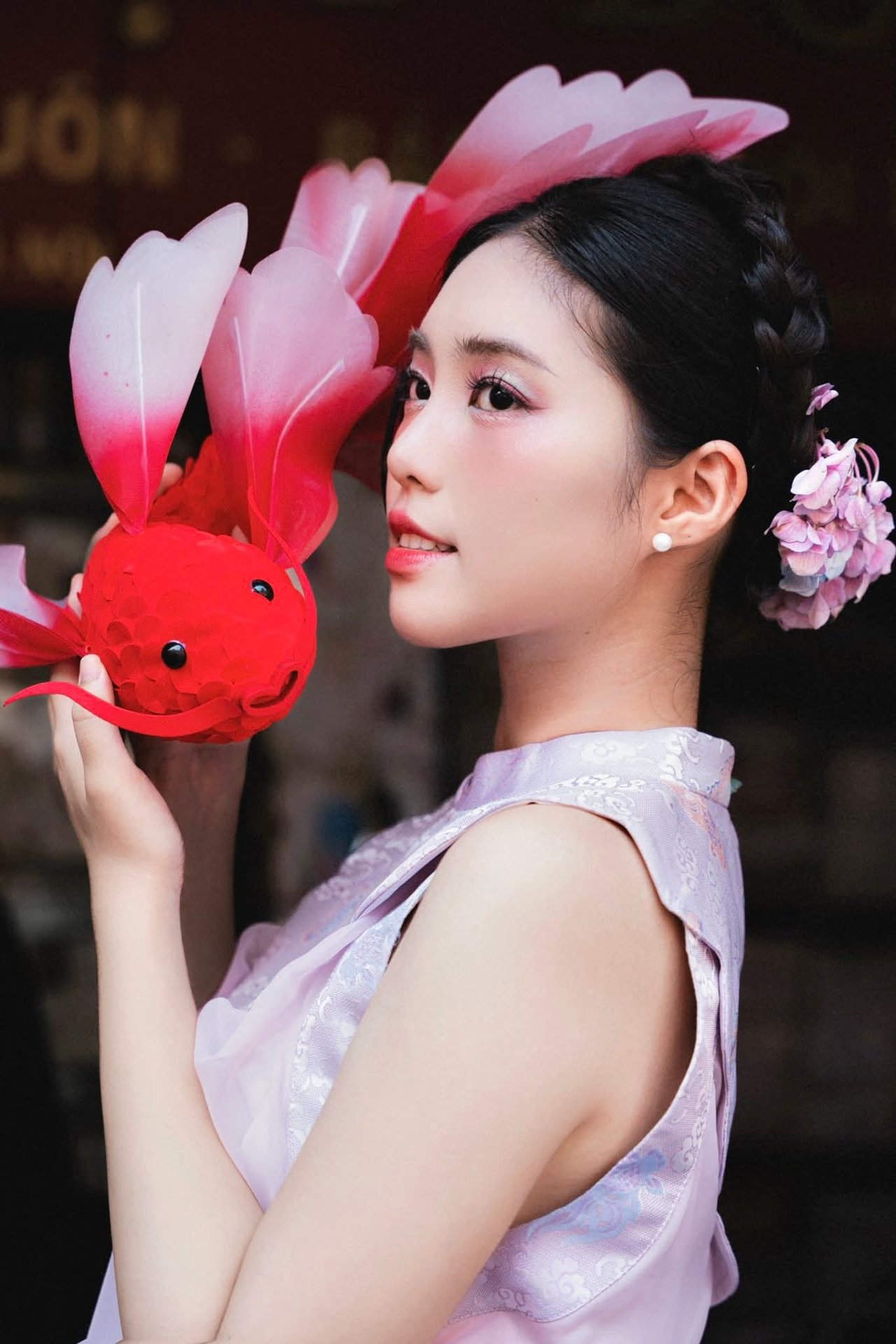 Elegant Vietnamese Beauty with Traditional Fish Lantern, Celebrating Culture