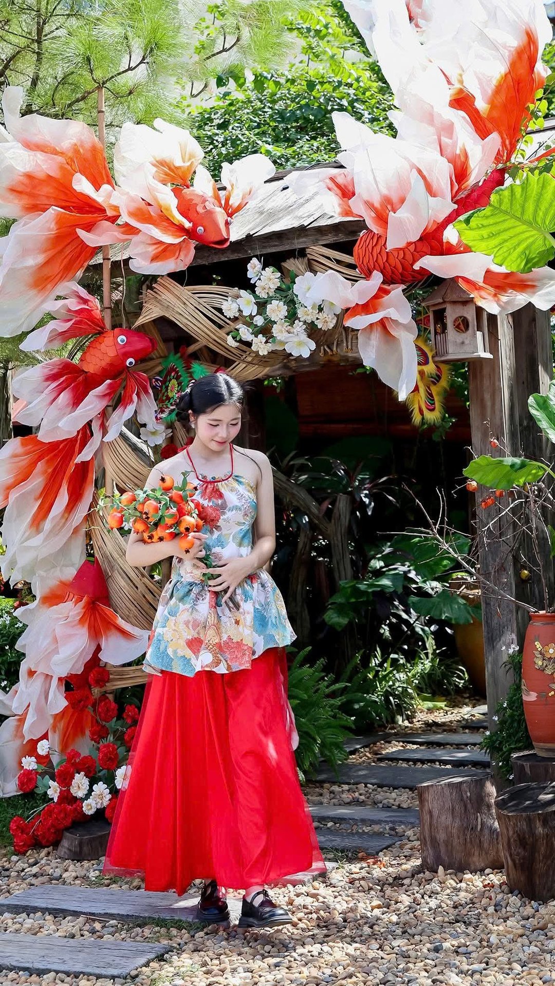 This stunning photograph transports us to Moc Chau during its vibrant ripe persimmon season where Vietnam's natural landscape unfolds with captivating charm. Amidst an orchard laden with ripe persimmons a young girl in traditional attire stands silently admiring the beautiful scenery. Golden sunlight filters through the leaves highlighting the fresh orange hues of the juicy fruits adding vividness to the natural canvas. This is not merely a tranquil moment but an invitation to explore the unique beauty of Moc Chau plateau. An unforgettable experience immerse yourself in the peaceful atmosphere savor the sweet flavors of autumn in the Northwest and feel the wonderful harmony between people and nature.VGU No.31: Captivating Asian Muse Radiates Elegance in a Stunning Autumn-Themed Photoshoot