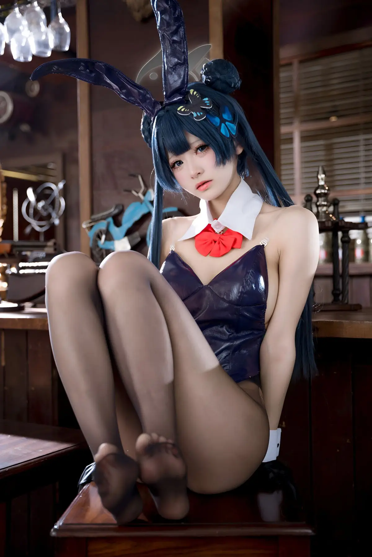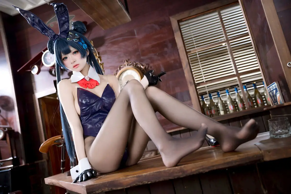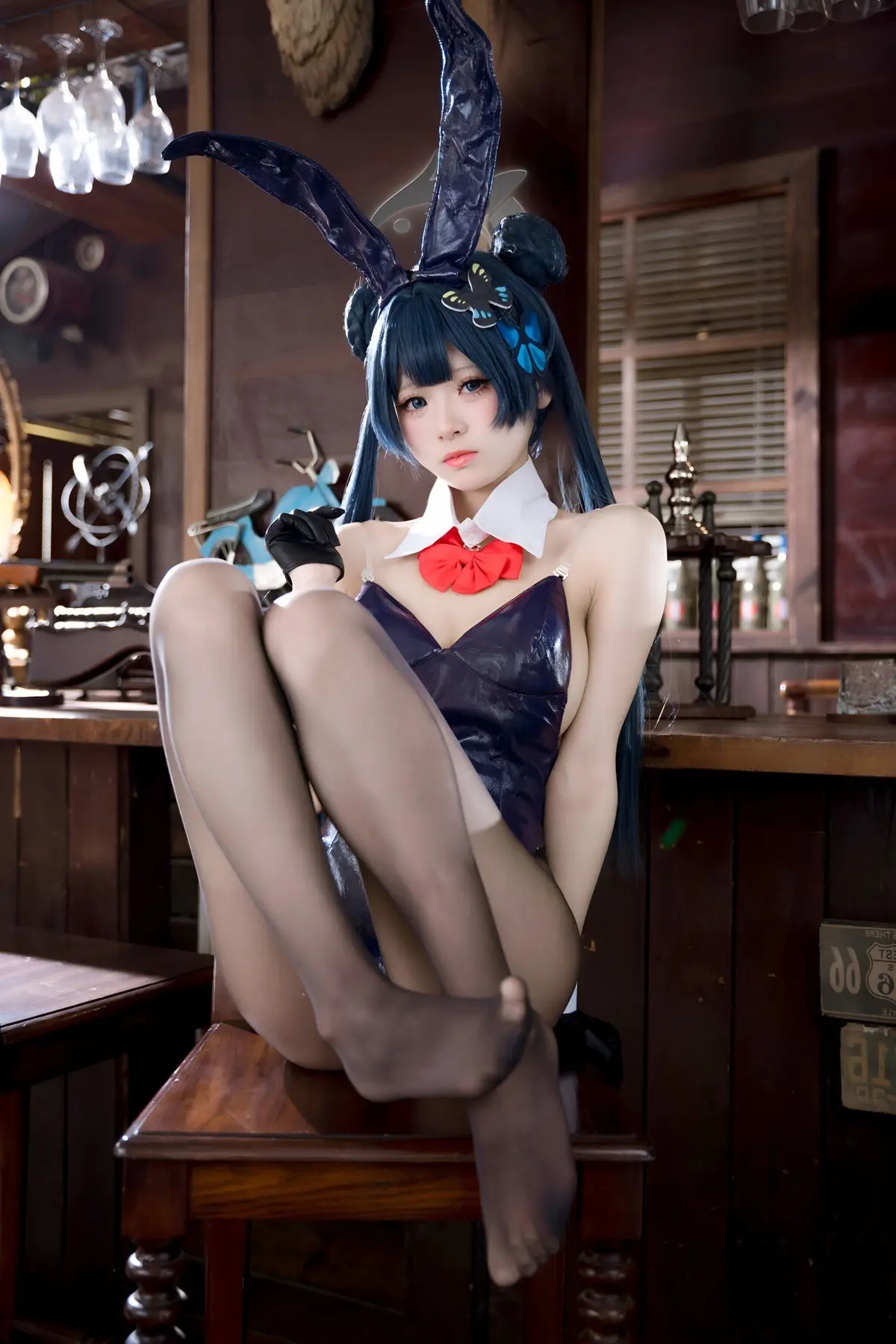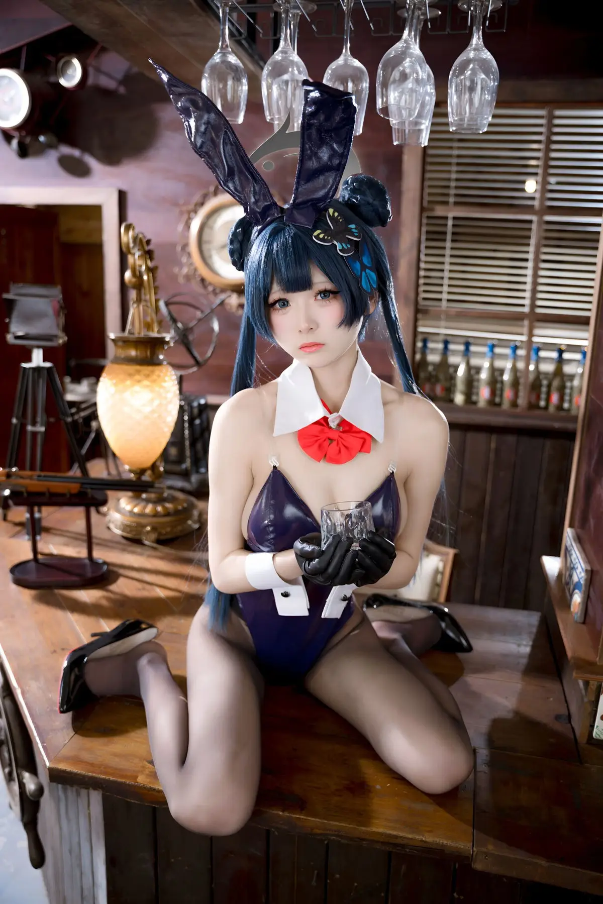 This stunning image captures Coser Jiu Qi Miao's exquisite portrayal of Ryūka Fisaki in her alluring Bunny Girl outfit from the popular game Blue Archive. With her flowing dark blue hair and playful bunny ears, she exudes an irresistible charm. The form-fitting dark blue bunny suit, paired with sheer black stockings and gloves, elegantly highlights the character's graceful silhouette. Her captivating pose, kneeling gracefully on a wooden bar counter, combined with a sharp gaze directly into the camera, establishes a powerful connection with the viewer. The classic bar setting in the background, complete with hanging glasses and warm golden lighting, enhances the mysterious and sophisticated ambiance of the photograph. This is truly an impressive cosplay, showcasing Jiu Qi Miao's meticulous dedication and passion for the character Ryūka Fisaki.#Coser #JiuQiMiao #RyukaFisaki #BlueArchive #BunnyGirlCosplay #AnimeCosplay