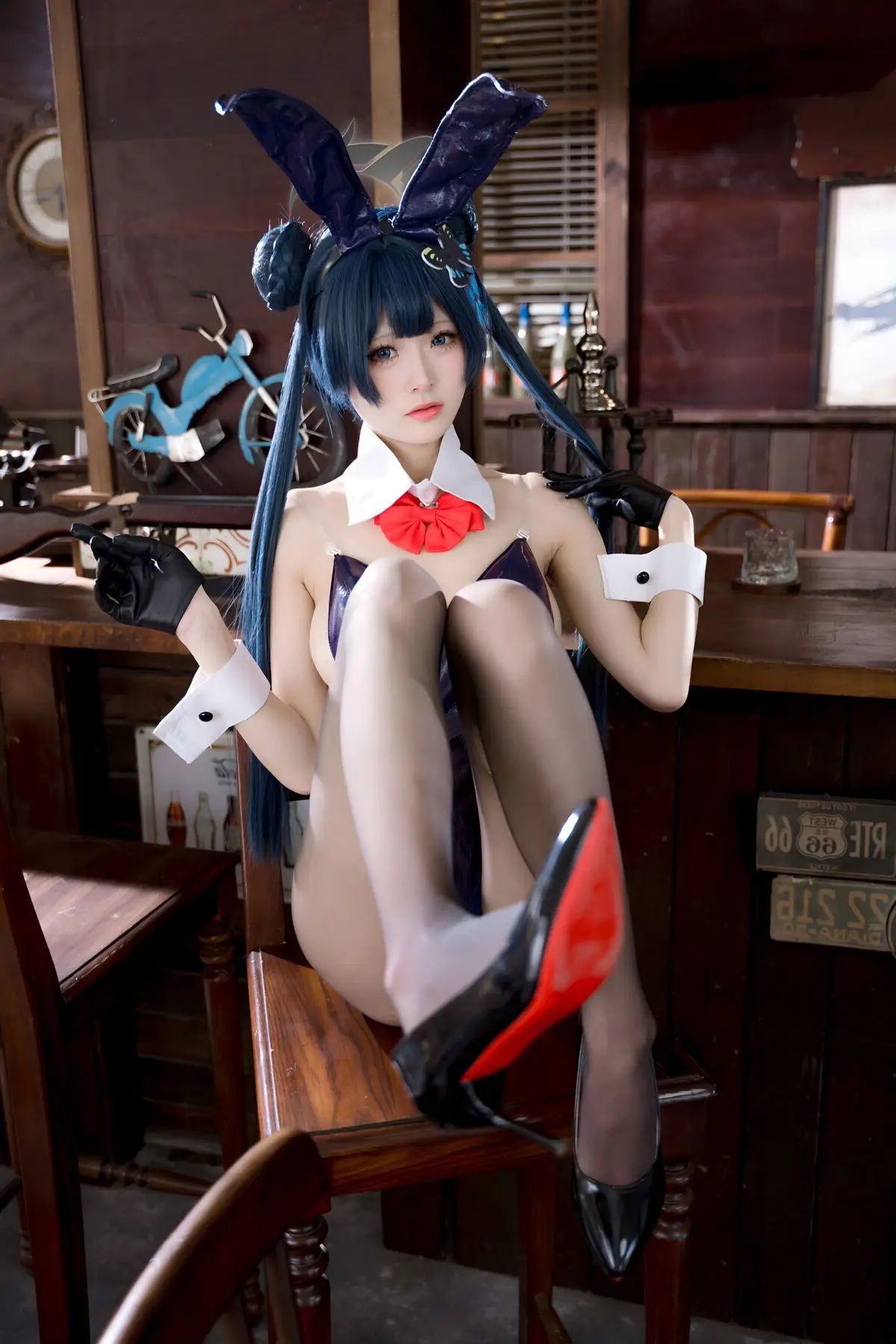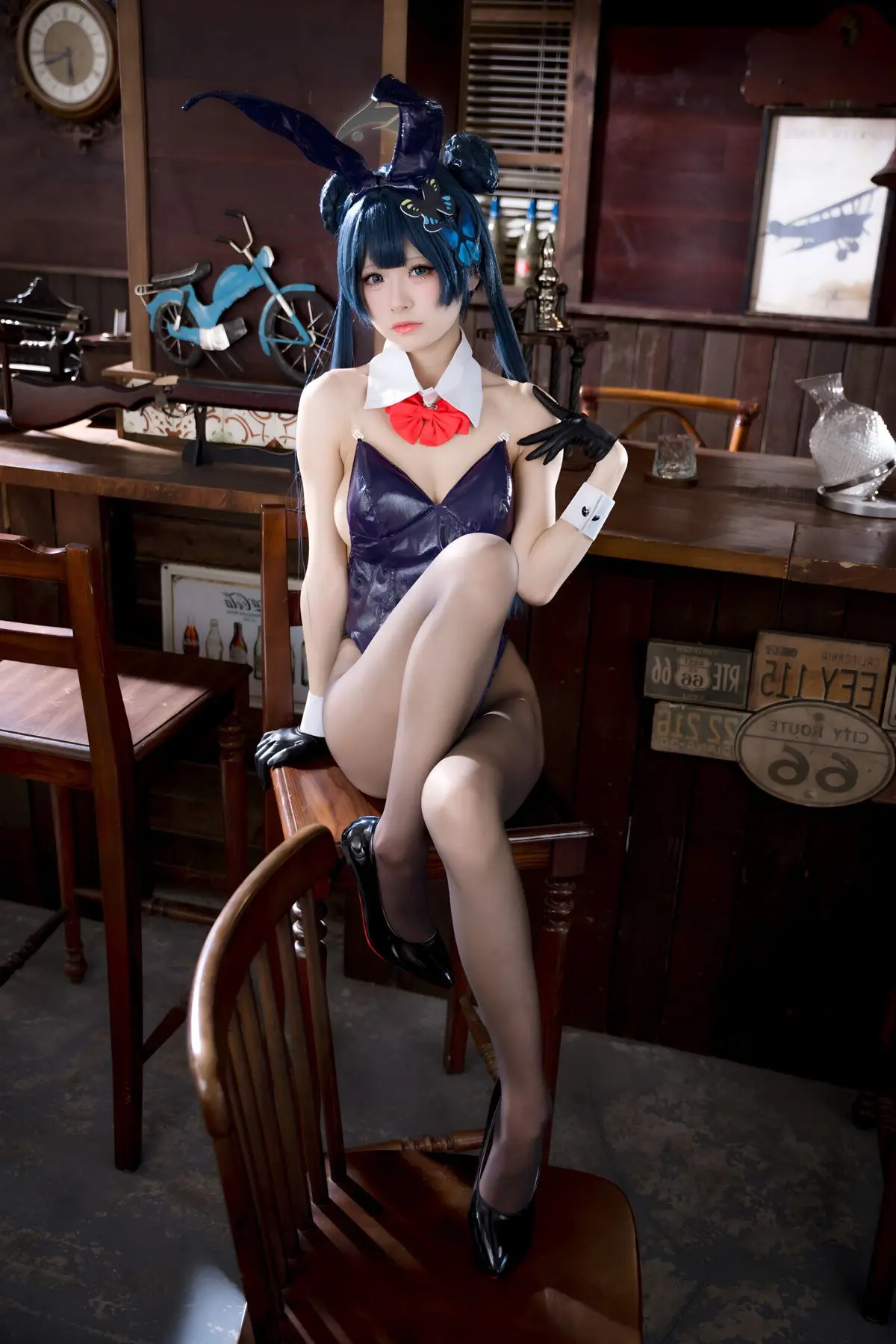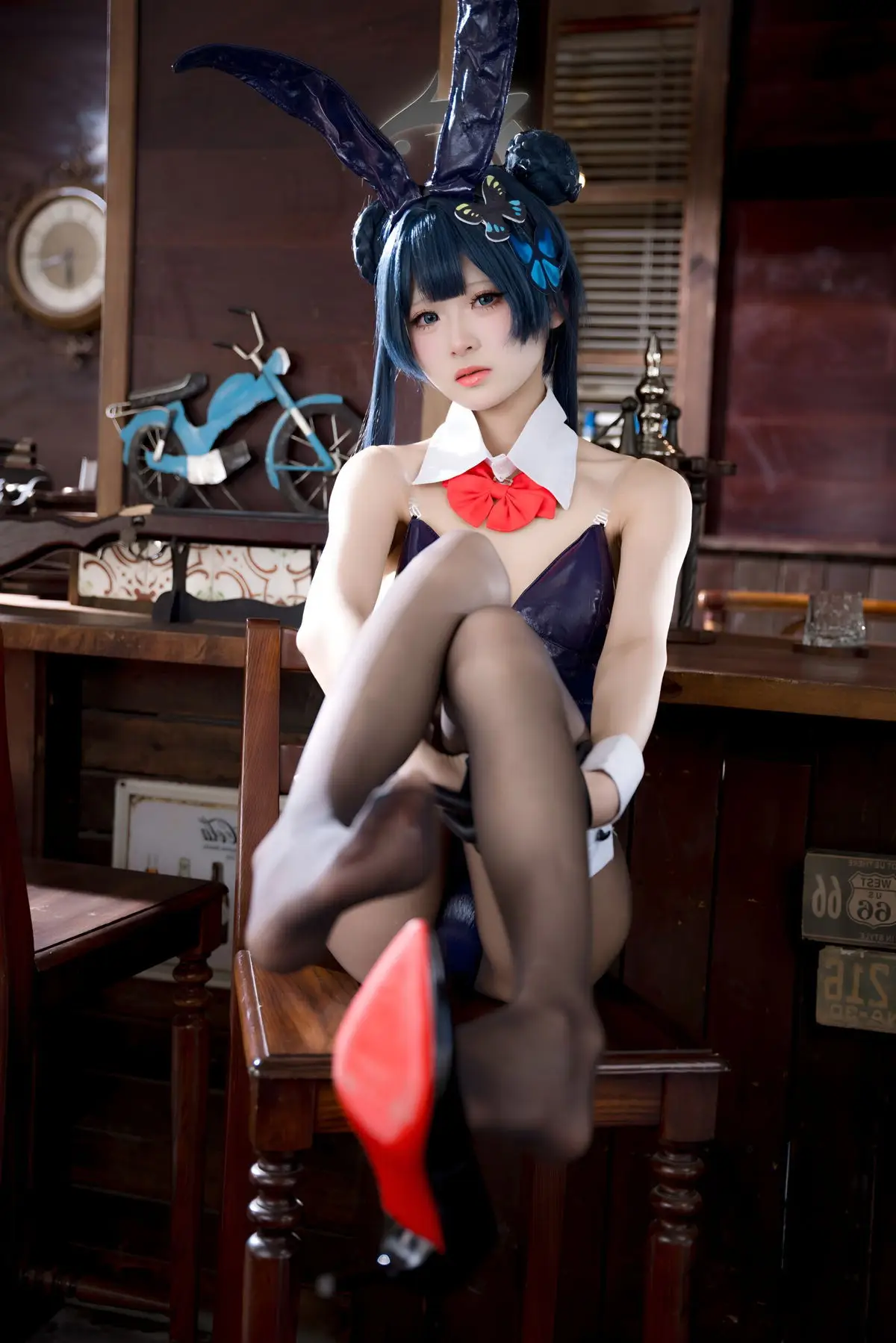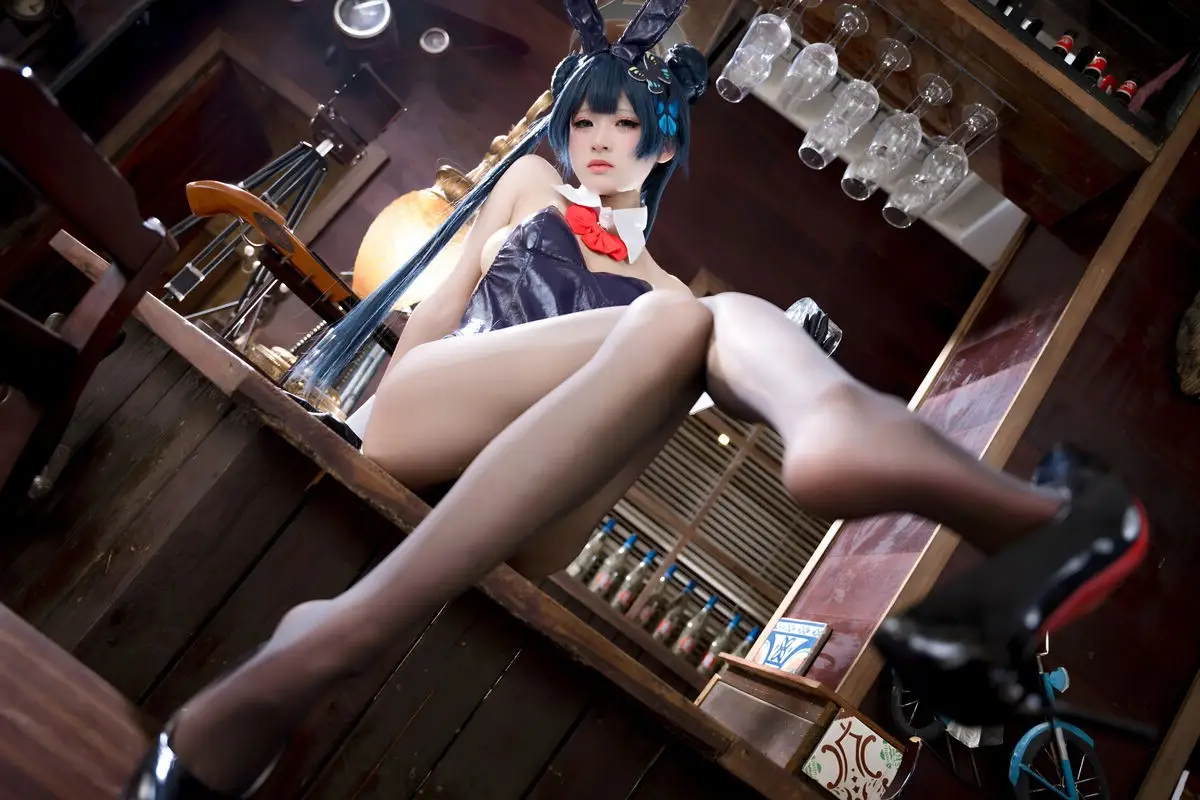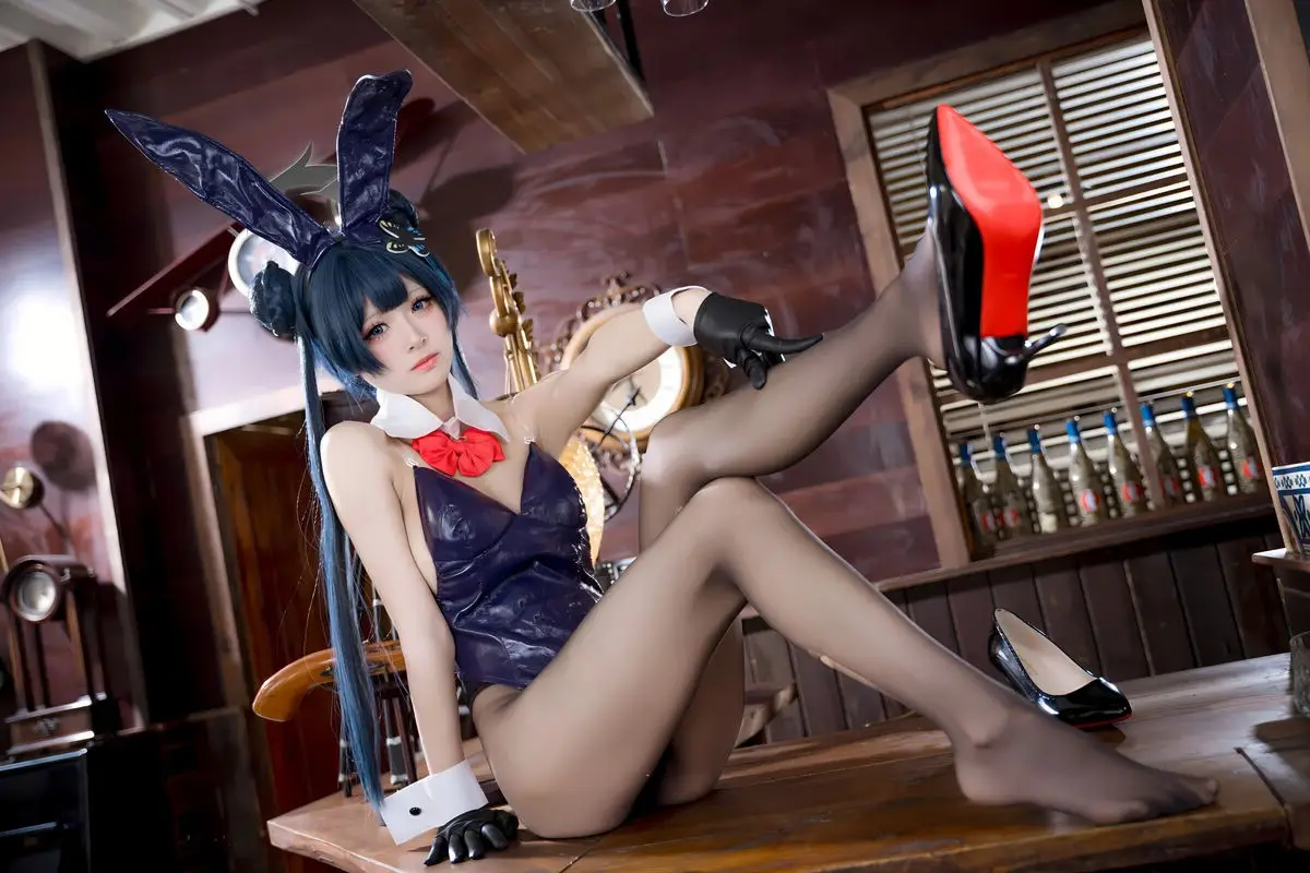 This stunning image captures Coser Jiu Qi Miao's exquisite portrayal of Ryūka Fisaki in her alluring Bunny Girl outfit from the popular game Blue Archive. With her flowing dark blue hair and playful bunny ears, she exudes an irresistible charm. The form-fitting dark blue bunny suit, paired with sheer black stockings and gloves, elegantly highlights the character's graceful silhouette. Her captivating pose, kneeling gracefully on a wooden bar counter, combined with a sharp gaze directly into the camera, establishes a powerful connection with the viewer. The classic bar setting in the background, complete with hanging glasses and warm golden lighting, enhances the mysterious and sophisticated ambiance of the photograph. This is truly an impressive cosplay, showcasing Jiu Qi Miao's meticulous dedication and passion for the character Ryūka Fisaki.#Coser #JiuQiMiao #RyukaFisaki #BlueArchive #BunnyGirlCosplay #AnimeCosplay