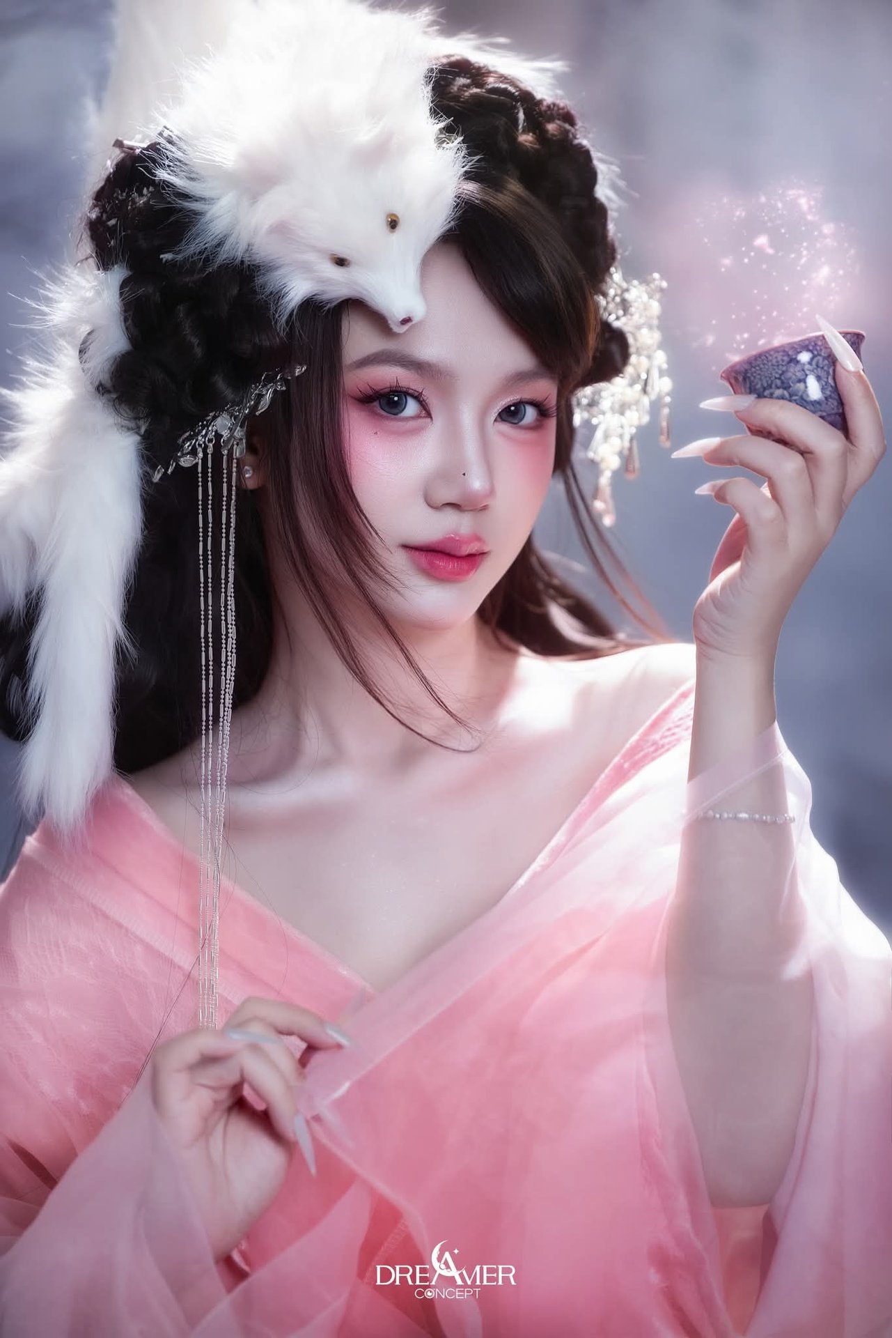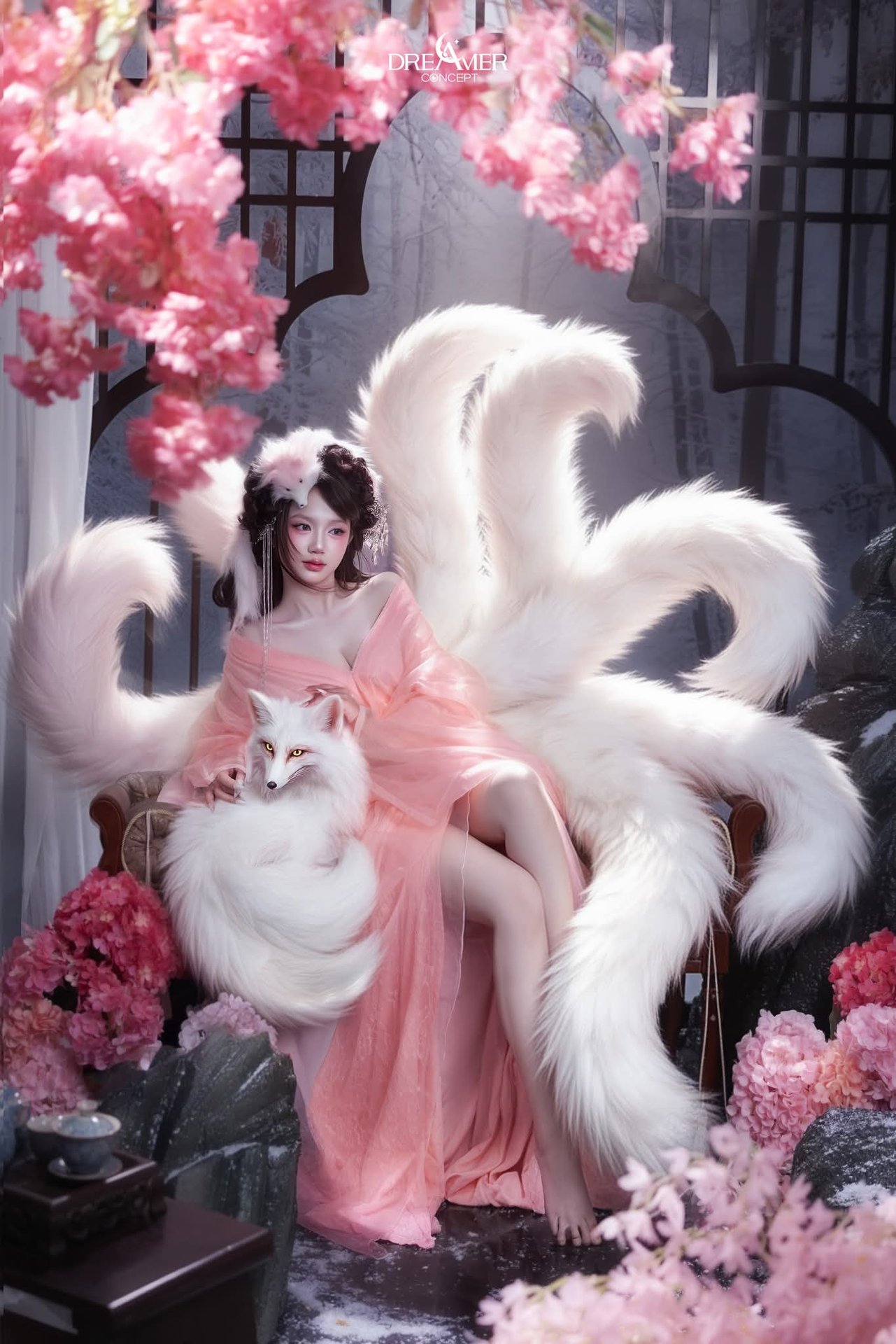This stunning image captures a beautiful Nine-Tailed Fox (Cửu Vĩ Hồ) cosplay vividly bringing to life the mysterious and enchanting allure of the legendary fox spirit. The central figure adorned in a delicate flowing pink traditional gown is gracefully posed with nine voluminous white tails that create an ethereal appearance. She sits elegantly beside a white fox her gaze captivating and mesmerizing. The surrounding scenery is embellished with vibrant cherry blossoms crafting a magical and dreamlike setting. This is more than just a cosplay photograph it is an artistic masterpiece that transports viewers into the realm of Eastern mythology where the exquisite beauty of the Nine-Tailed Fox truly comes alive with irresistible charm.