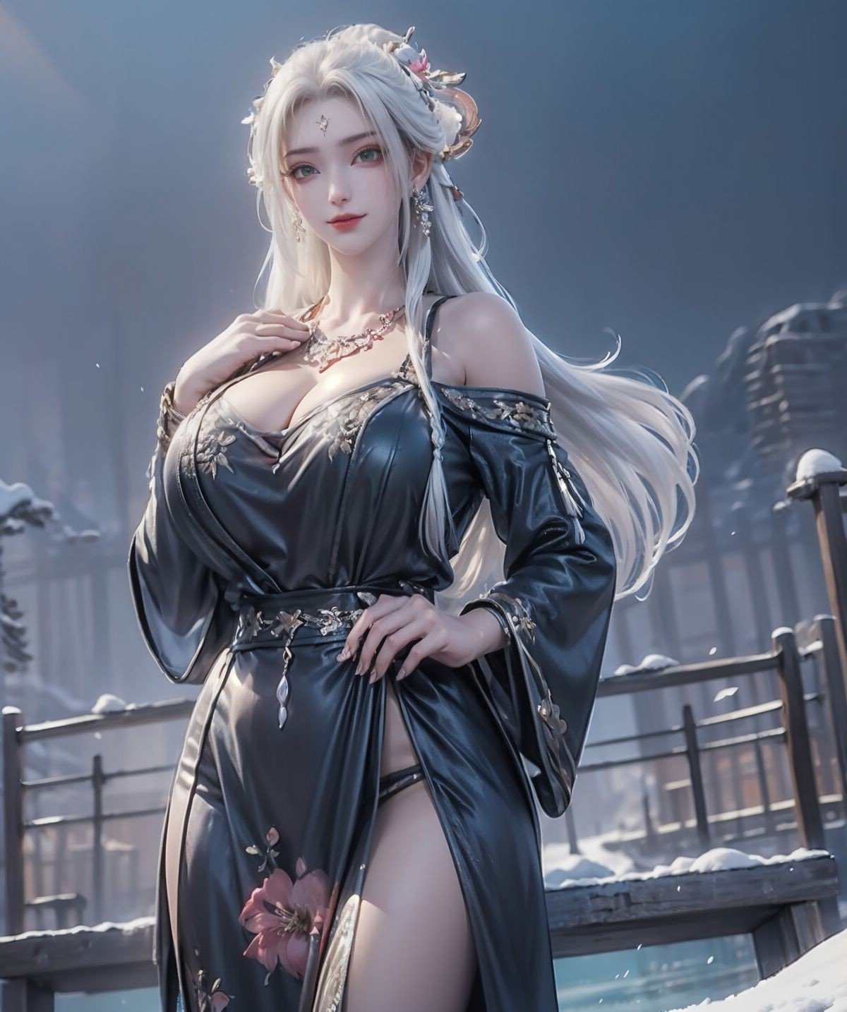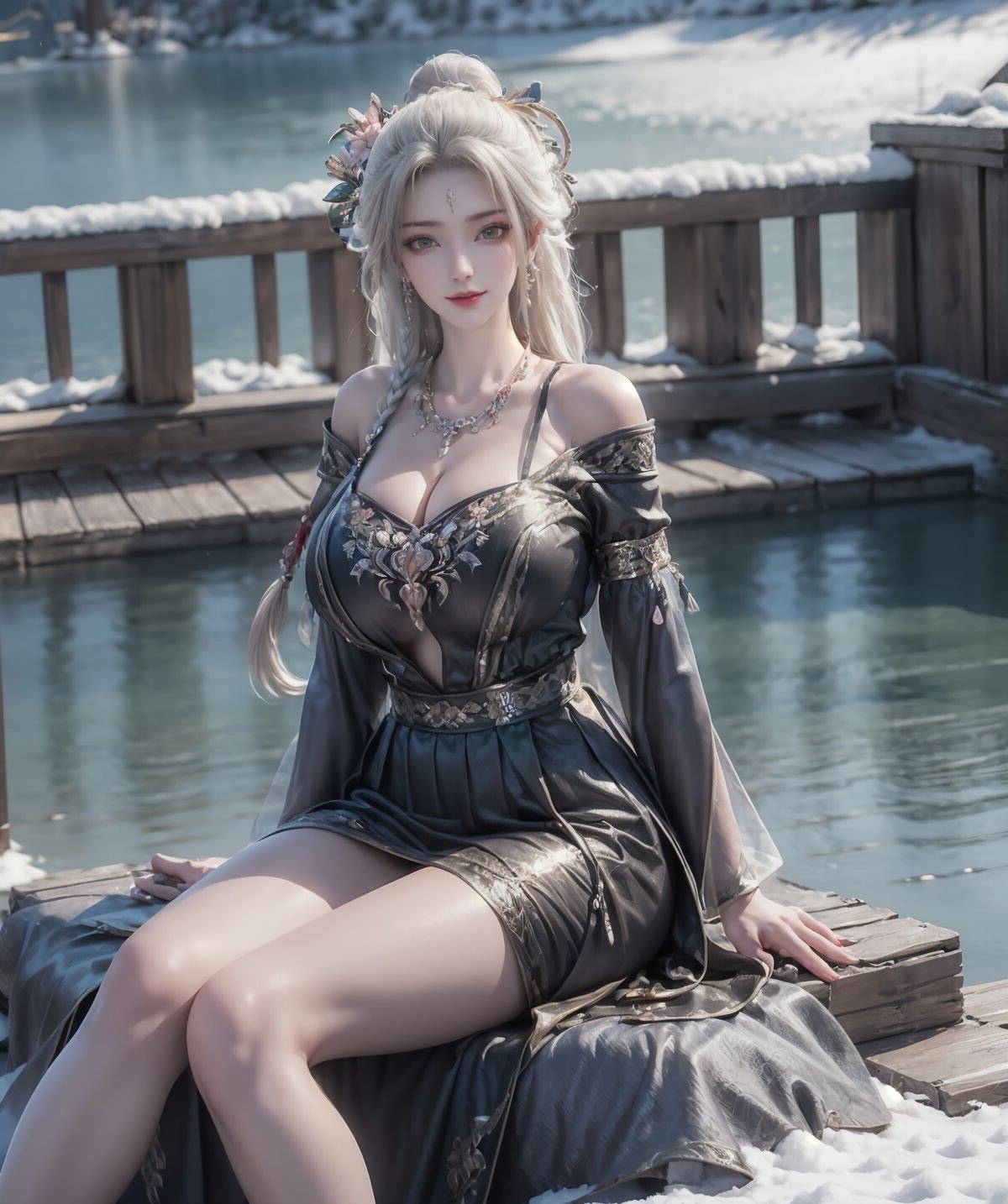 This stunning AI Generated artwork features Xiaobai from Zhu Xian set against a magnificent snowy landscape. She appears as an enchanting goddess by the vast ice lake her radiant silver hair and mysterious black dress highlighting her captivating and ethereal beauty. Her elegant pose by the lake reflects the pristine white snow capped mountains and delicate cherry blossoms creating a breathtaking contrast. This high quality AI art piece offers a profound glimpse into the magical world of Zhu Xian where Xiaobai shines with an irresistible aura blending perfectly with the serene majesty of the winter nature. This image will undoubtedly captivate fantasy art enthusiasts and Zhu Xian fans.