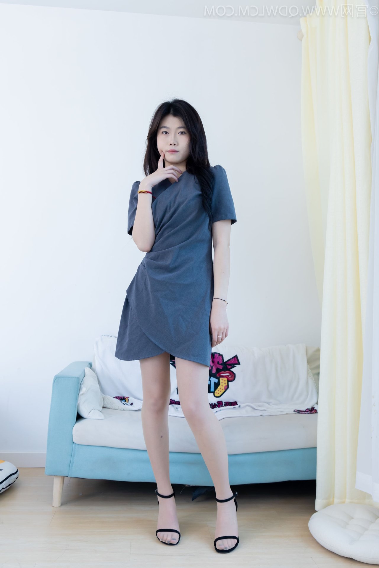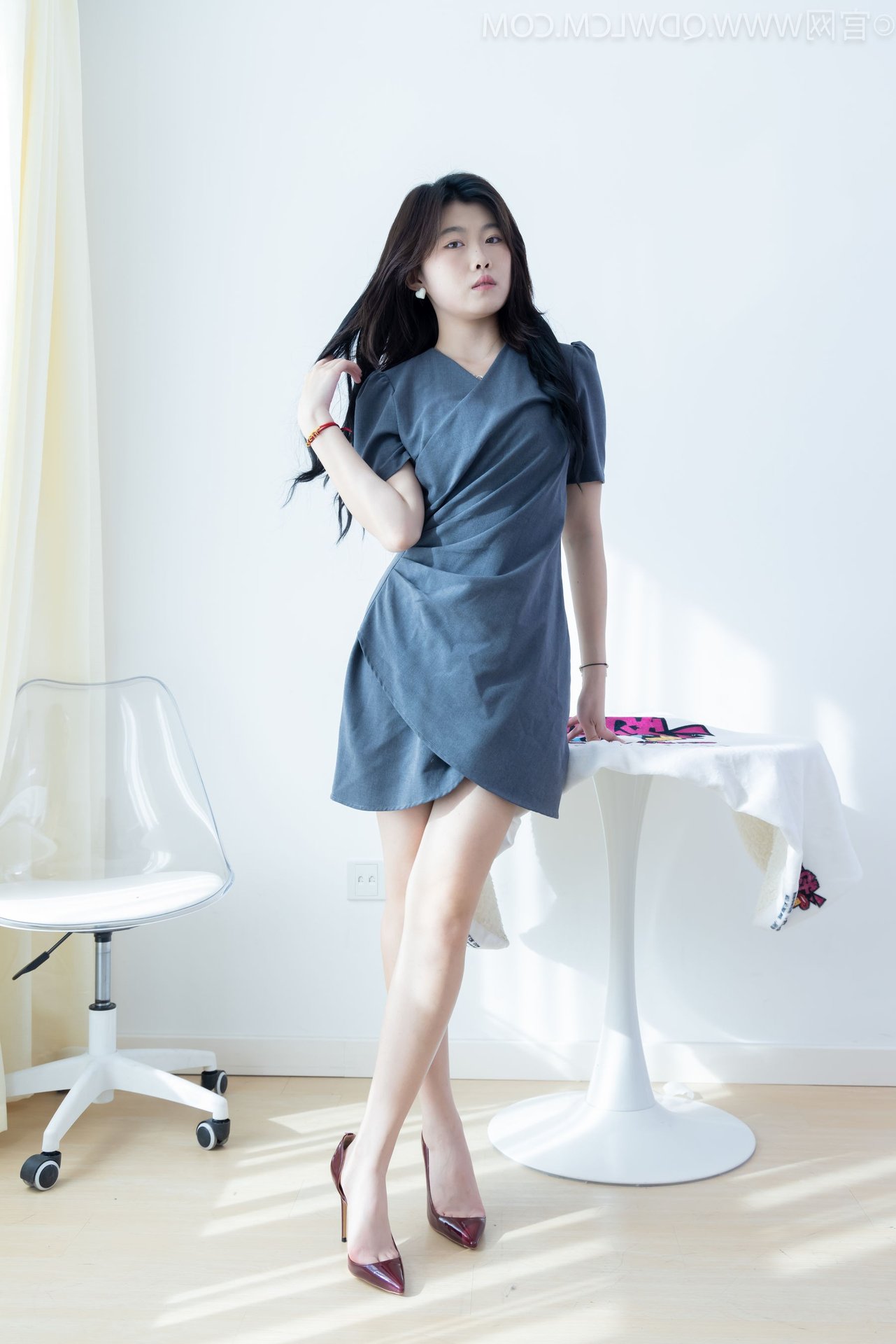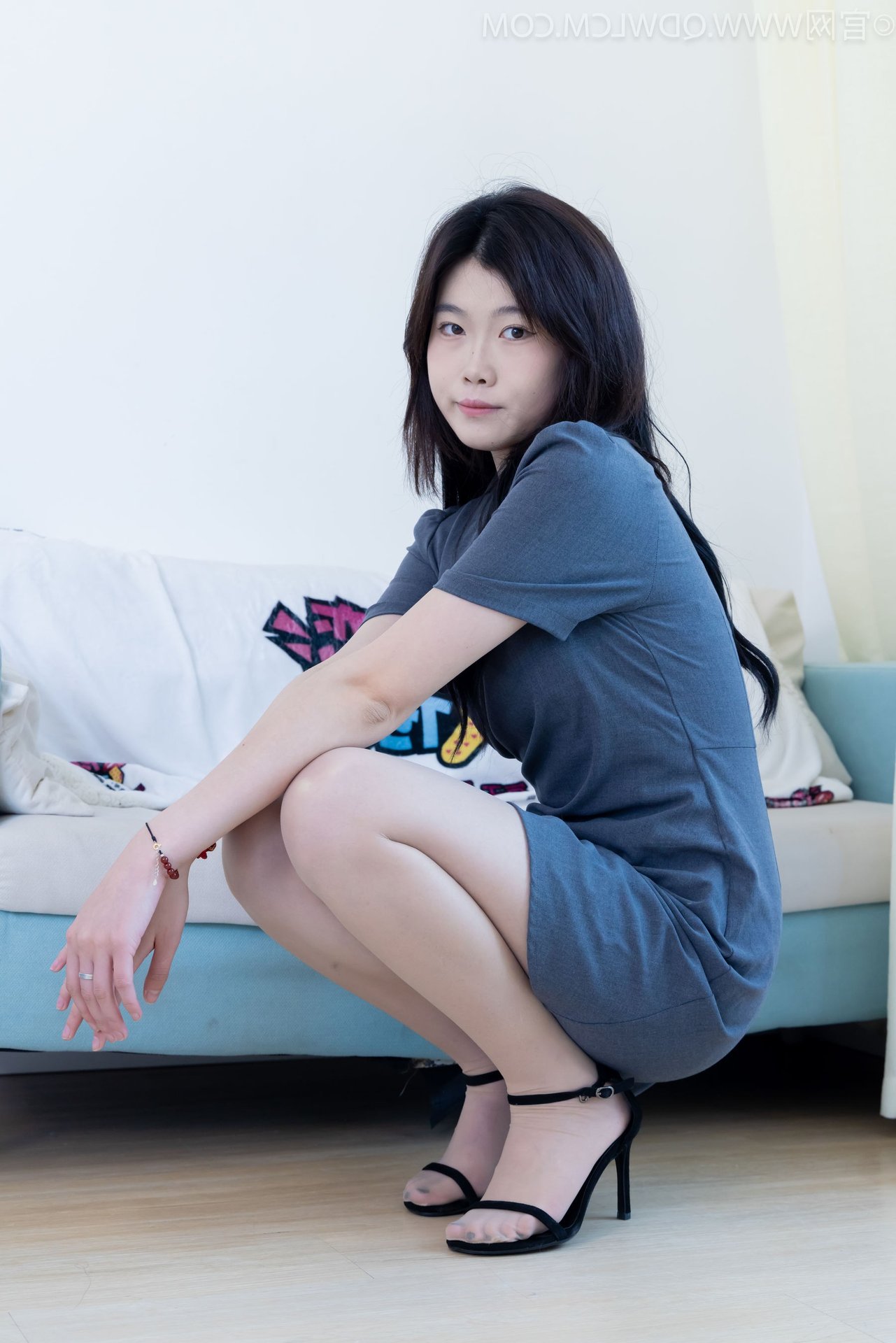 This stunning photograph features Chinese Model No2336 Cherry exuding elegance and charm She poses gracefully on a light blue sofa showcasing her slender legs enhanced by delicate sheer hosiery and sophisticated high heels Her dark gray short dress further accentuates her modern fashion sense With flowing dark hair and captivating eyes Cherry embodies a confident and alluring presence This image is perfect for those who appreciate the blend of high fashion and East Asian beauty highlighting the allure of high heels and sheer hosiery in contemporary style
