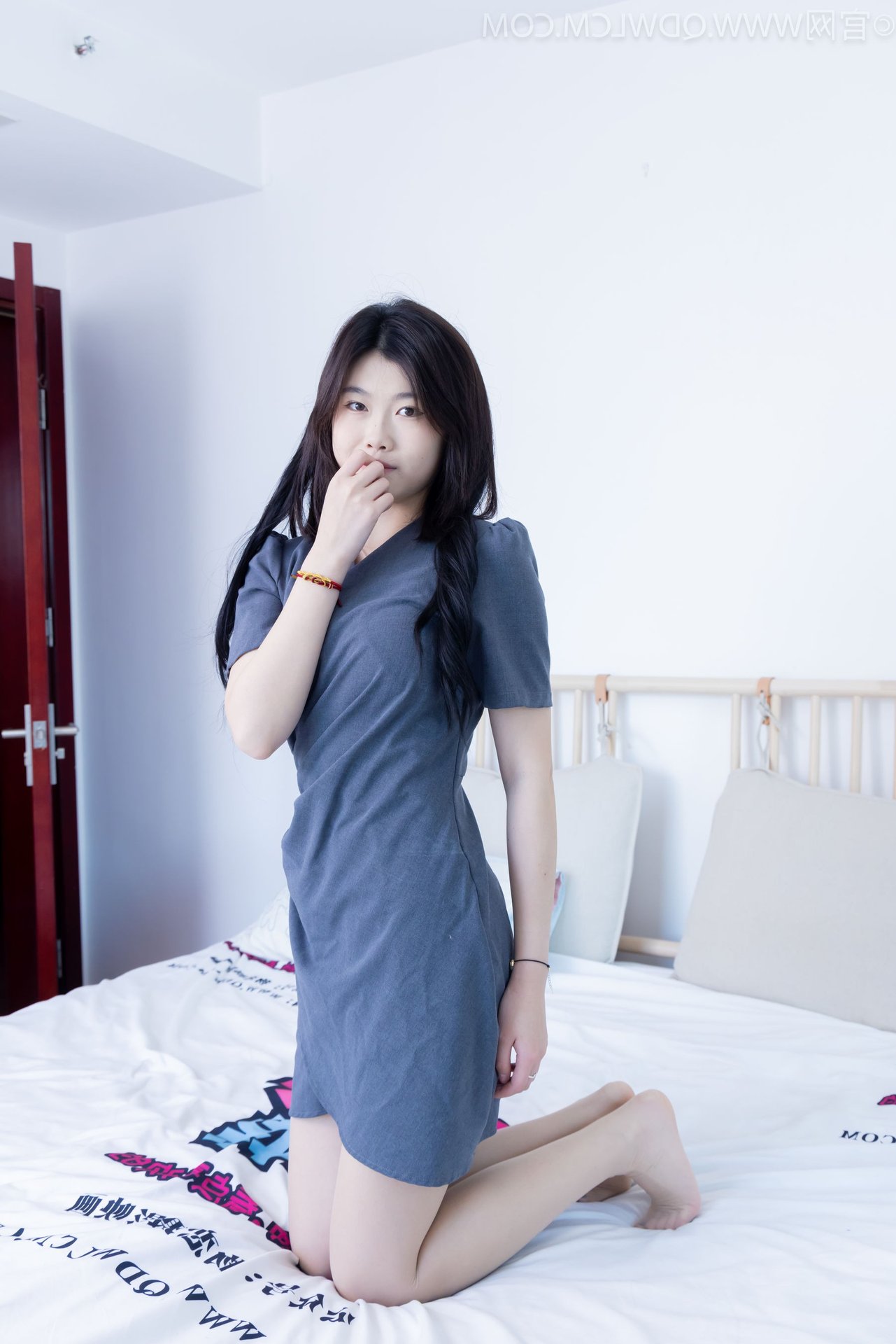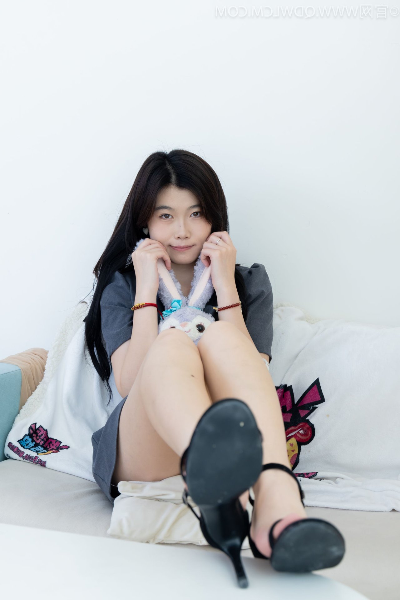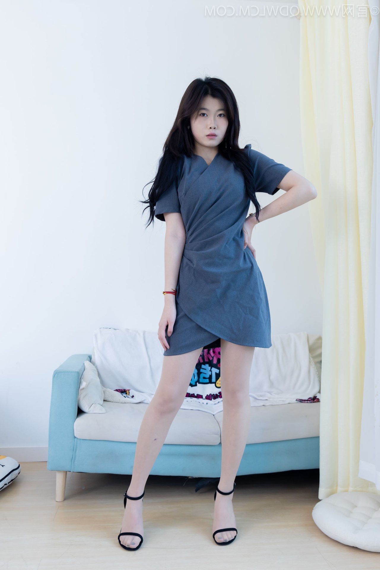 This stunning photograph features Chinese Model No2336 Cherry exuding elegance and charm She poses gracefully on a light blue sofa showcasing her slender legs enhanced by delicate sheer hosiery and sophisticated high heels Her dark gray short dress further accentuates her modern fashion sense With flowing dark hair and captivating eyes Cherry embodies a confident and alluring presence This image is perfect for those who appreciate the blend of high fashion and East Asian beauty highlighting the allure of high heels and sheer hosiery in contemporary style