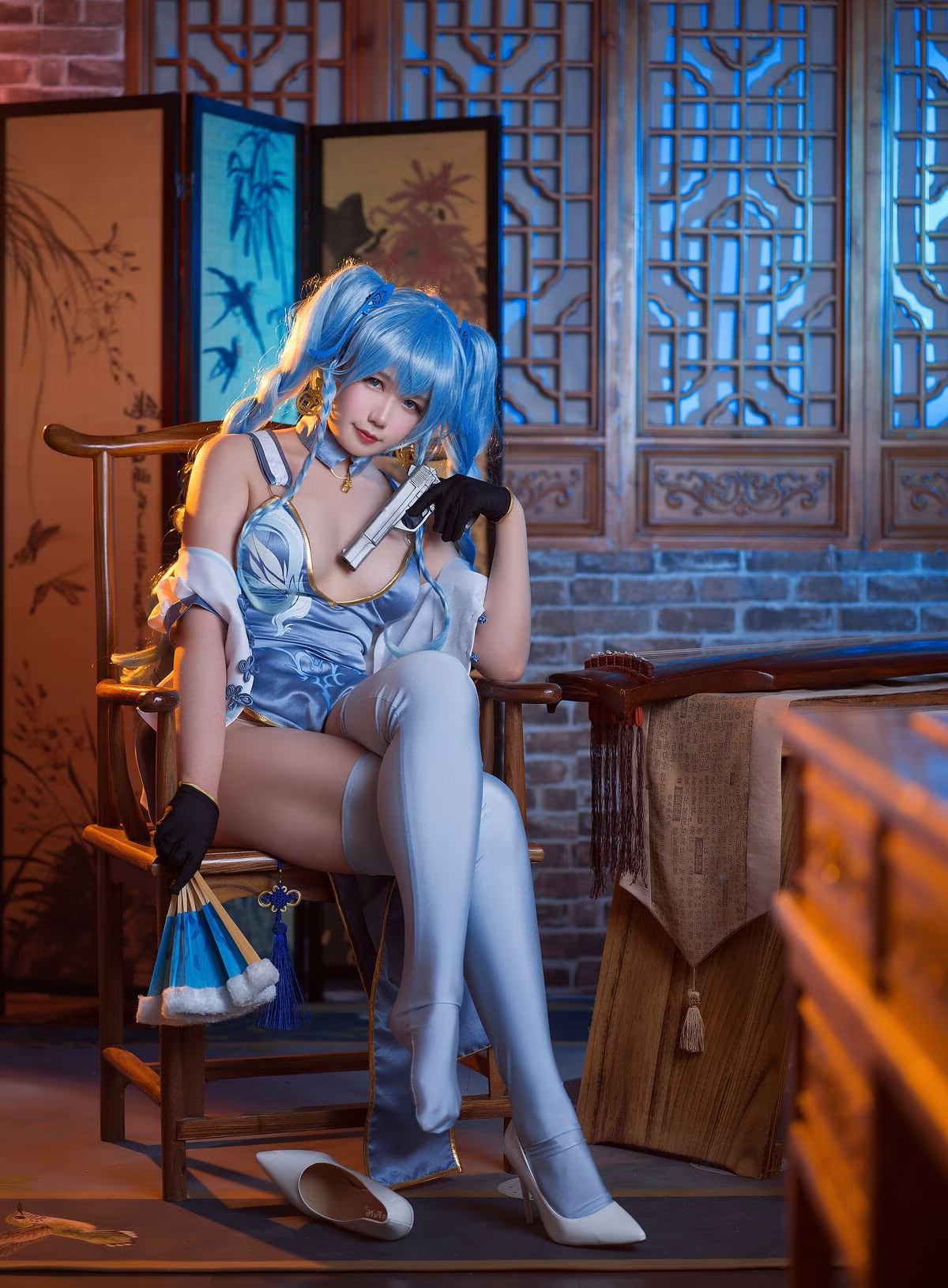 Immerse yourself in the captivating world of Girls' Frontline through the stunning portrayal by Coser 麻花麻花酱. This photoshoot showcases her alluring and refined beauty, donning a distinctive character costume in harmonious shades of blue and white. Every detail of the cosplay is meticulously crafted, from her flowing blue hair to the seductive long white stockings, creating an utterly enchanting look. Coser 麻花麻花酱's expressive gaze, combined with her elegant pose on a traditional wooden chair and the classic architectural backdrop, accentuates the character's grace and charm. This collection is more than just a vibrant recreation; it's an artistic masterpiece that evokes emotion and admiration from viewers.