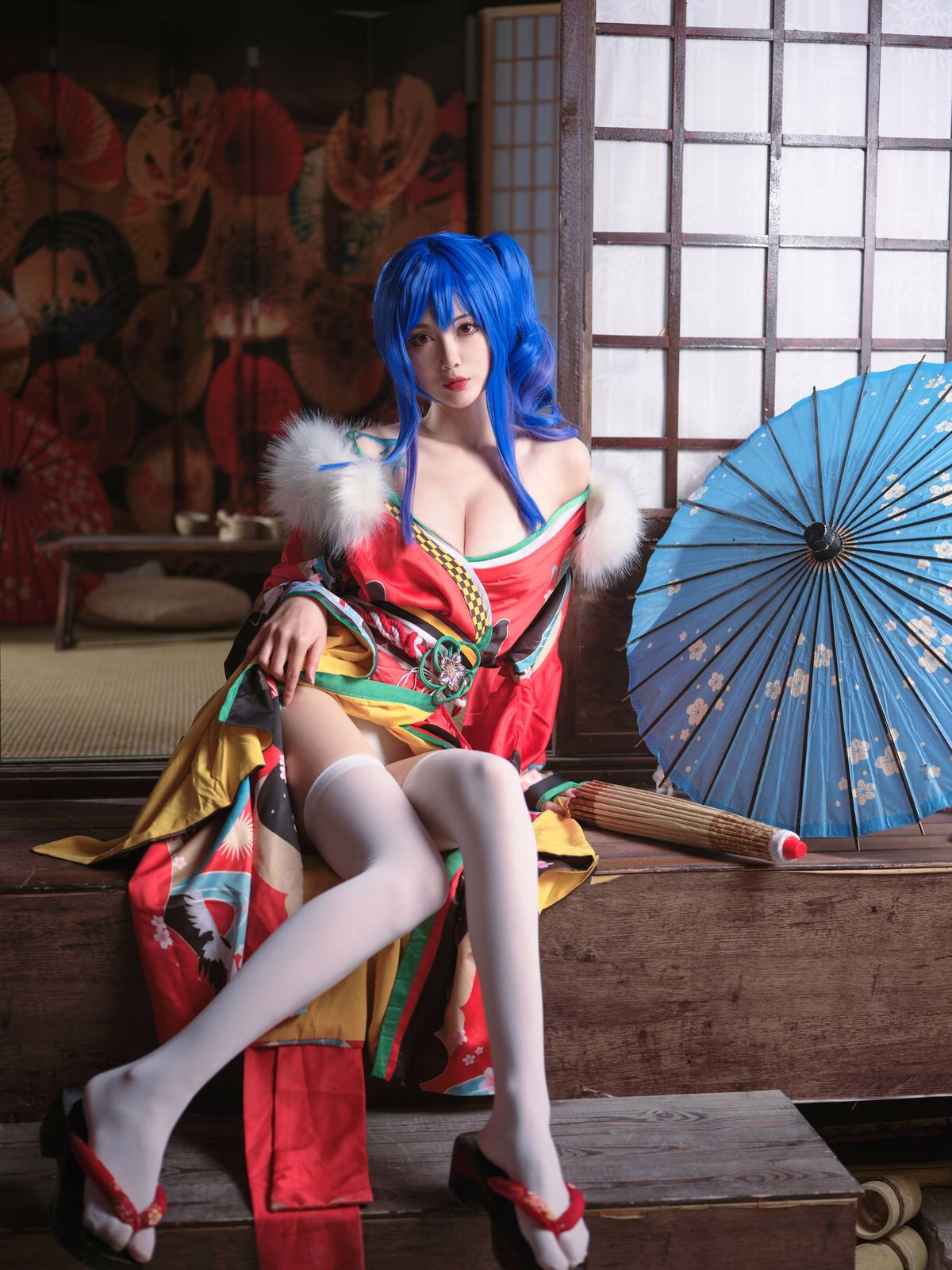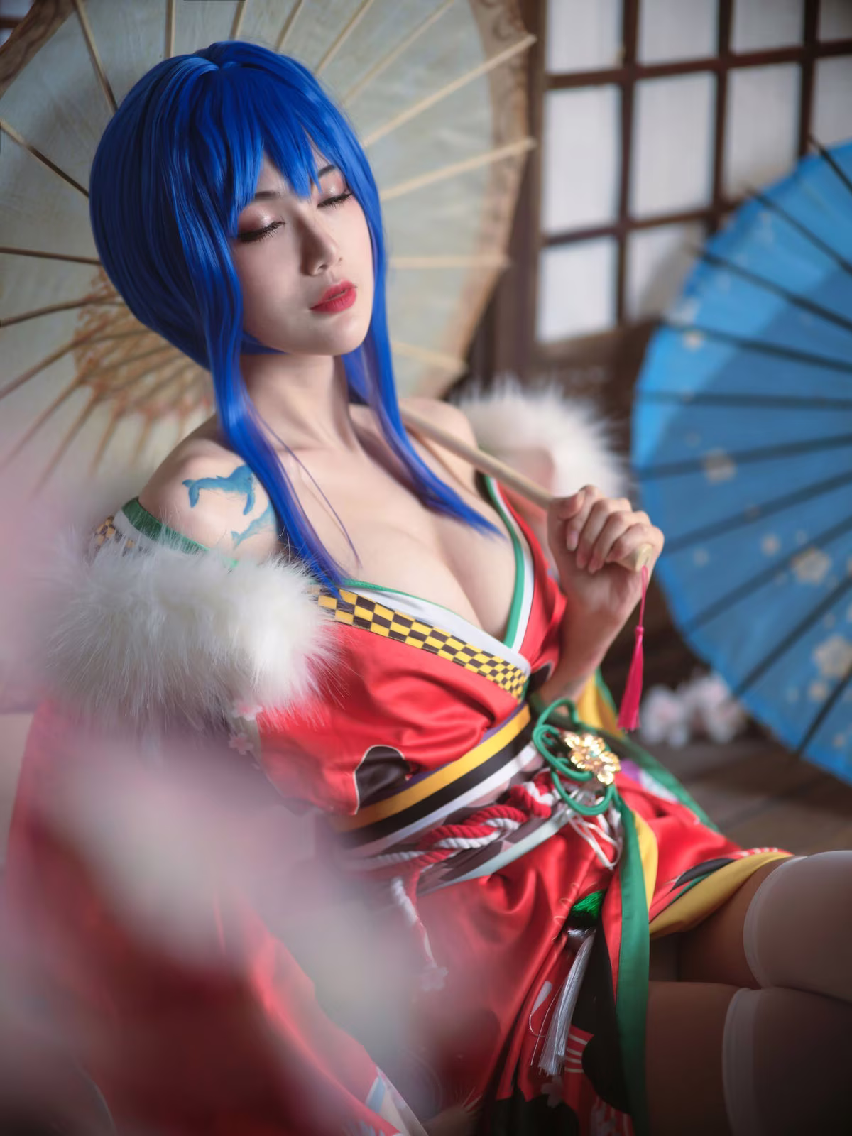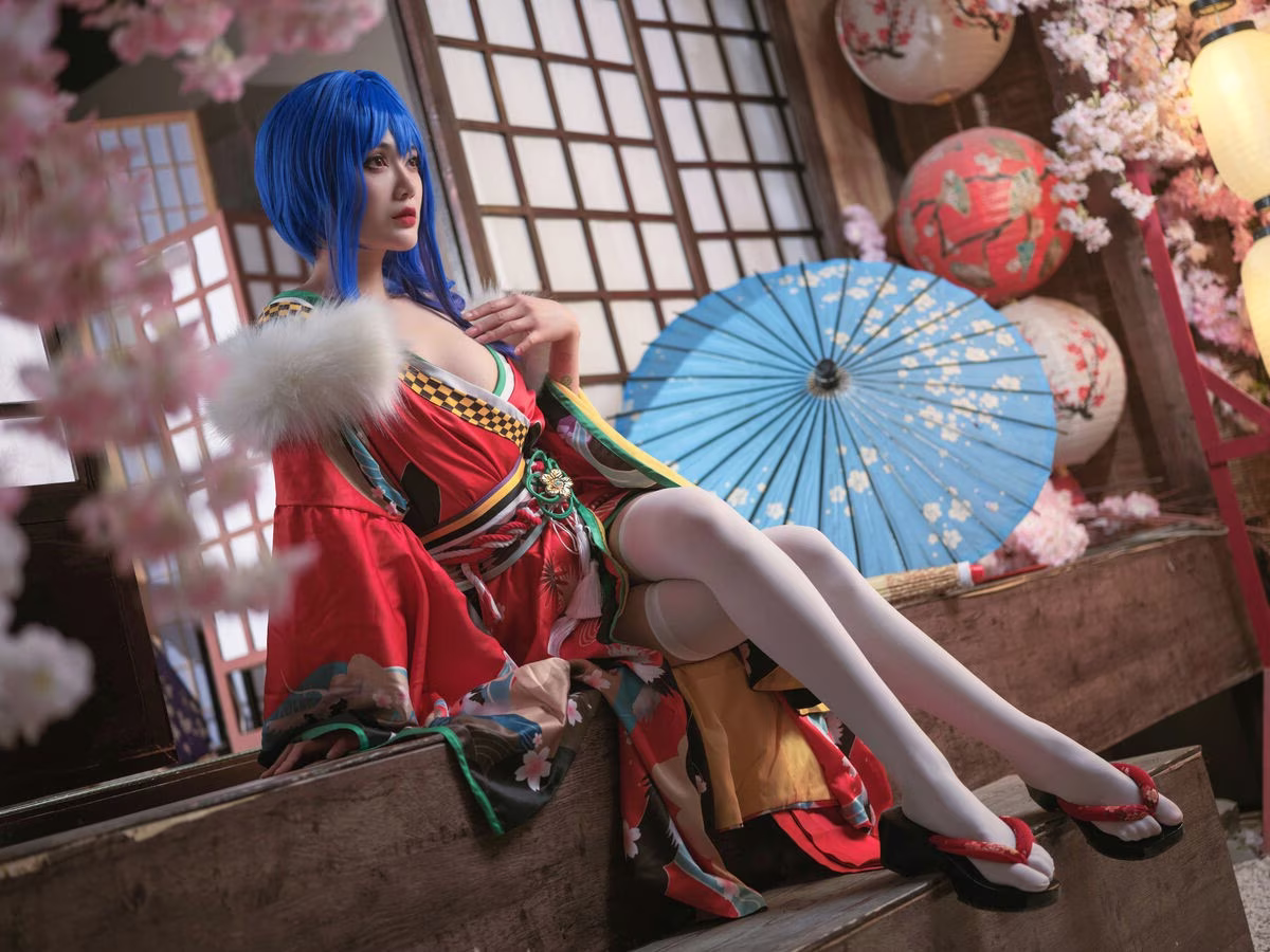 Coser Yi Mi Ba De Da Li Zi delivers a stunning portrayal of Sheng Yi He Fu, captivating viewers with her exquisite cosplay. The traditional Japanese inspired costume is brought to life with vibrant red hues intricate patterns and delicate white and green accents. Her striking blue hair and classic umbrella add layers of mystery and allure to the character. The coser masterfully embodies the persona conveying confidence and charm through her gaze and posture. This artistic transformation showcases the immense creativity and dedication within the cosplay community offering a mesmerizing glimpse into the world of character embodiment.