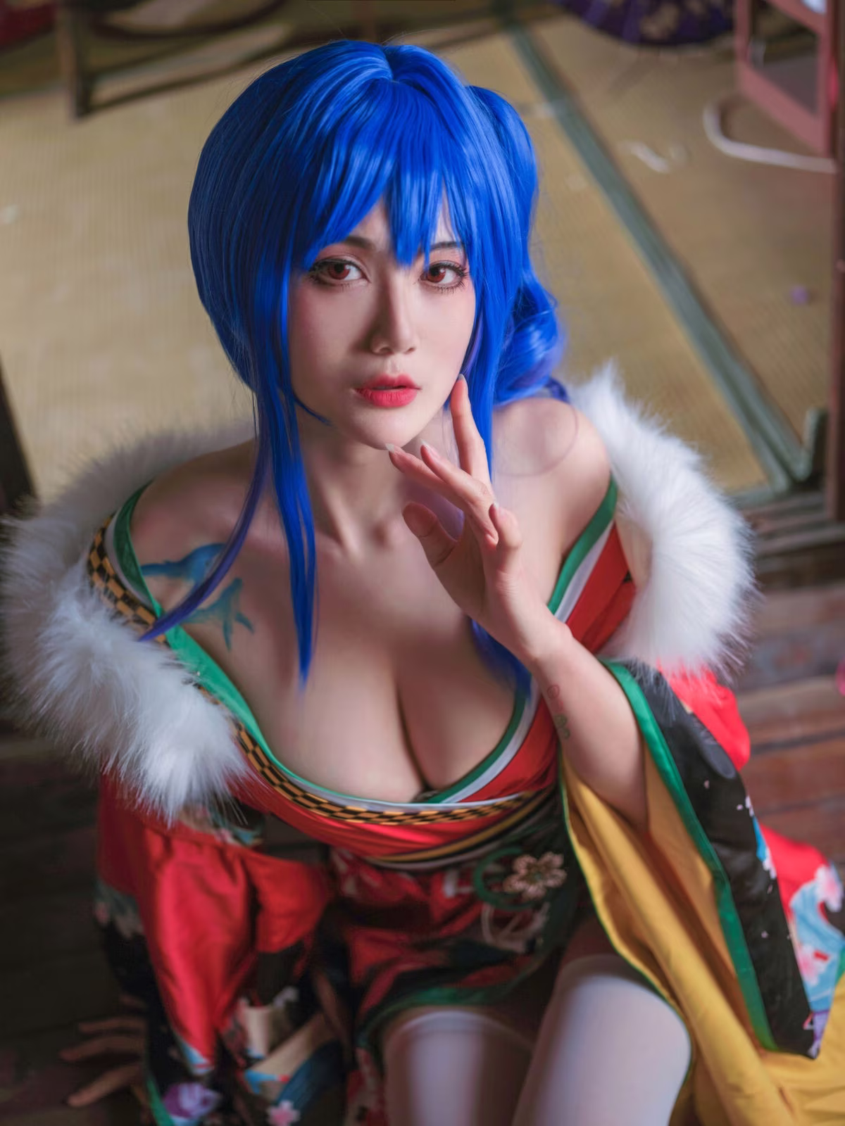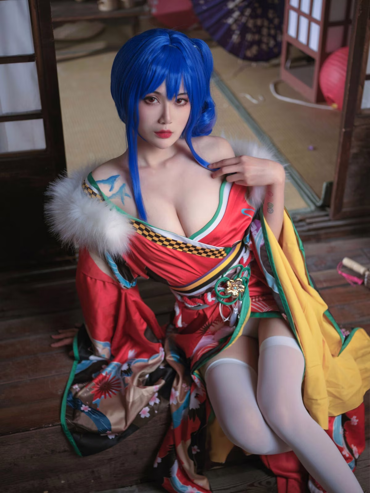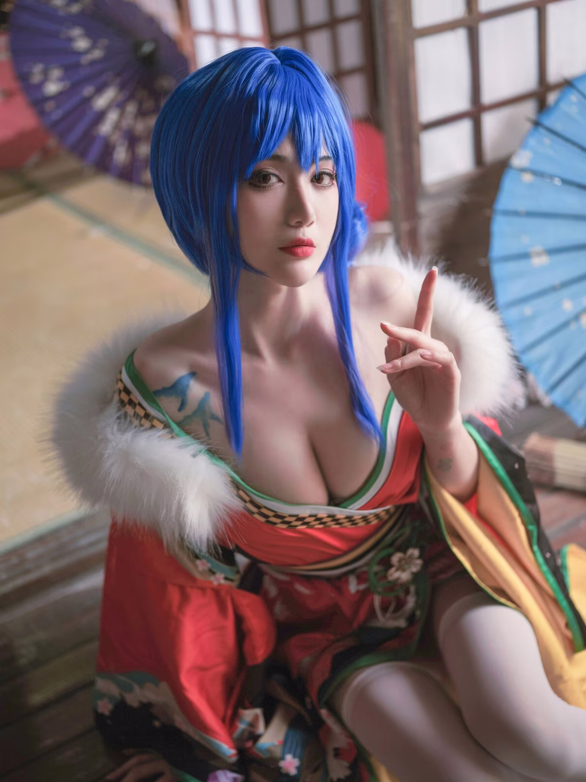 Coser Yi Mi Ba De Da Li Zi delivers a stunning portrayal of Sheng Yi He Fu, captivating viewers with her exquisite cosplay. The traditional Japanese inspired costume is brought to life with vibrant red hues intricate patterns and delicate white and green accents. Her striking blue hair and classic umbrella add layers of mystery and allure to the character. The coser masterfully embodies the persona conveying confidence and charm through her gaze and posture. This artistic transformation showcases the immense creativity and dedication within the cosplay community offering a mesmerizing glimpse into the world of character embodiment.