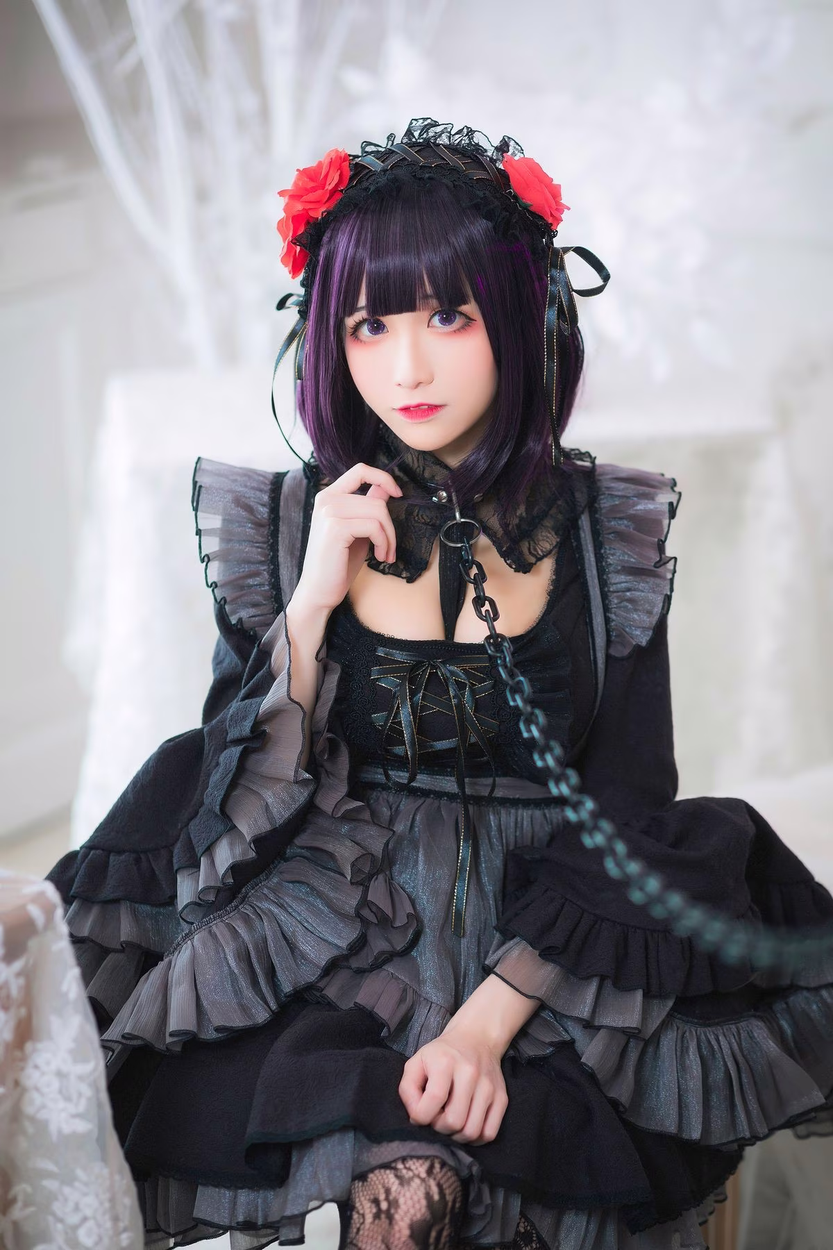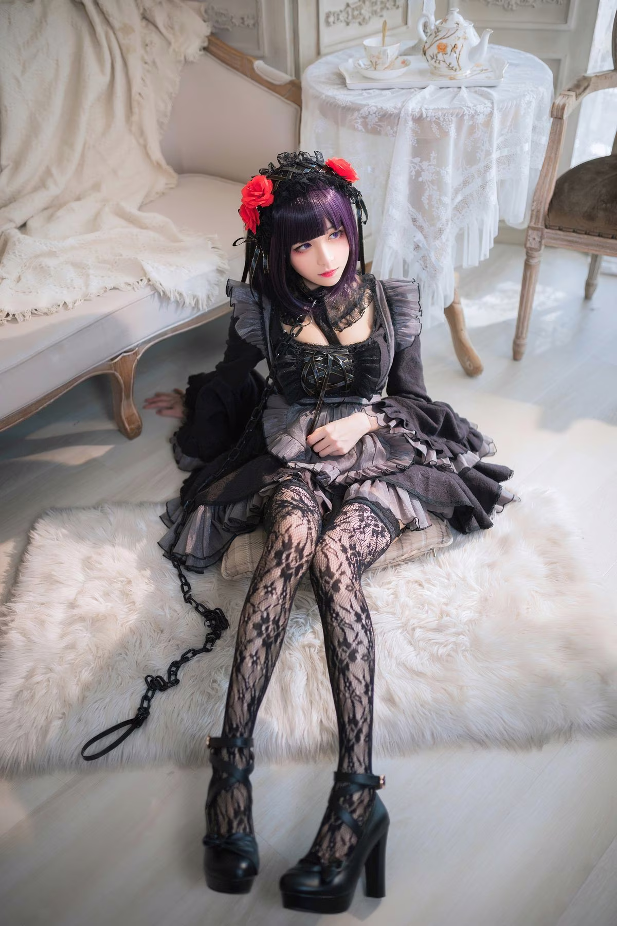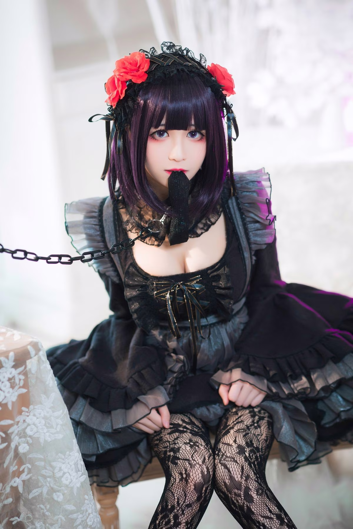In this photoshoot Coser Tomoyo Jiang embodies the character Kuroe Shizuku with a unique Gothic style She wears a striking all-black outfit adorned with intricate lace and ruffle details exuding a mysterious and captivating allure The thigh-high fishnet stockings and high-heeled shoes further enhance her sensual appeal With a cool yet captivating expression Tomoyo Jiang perfectly captures Kuroe Shizukus enigmatic aura The luxurious interior setting accentuates the characters elegant and bewitching presence This is a truly impressive cosplay showcasing meticulous attention to detail from the costume to the overall portrayal guaranteed to mesmerize viewers