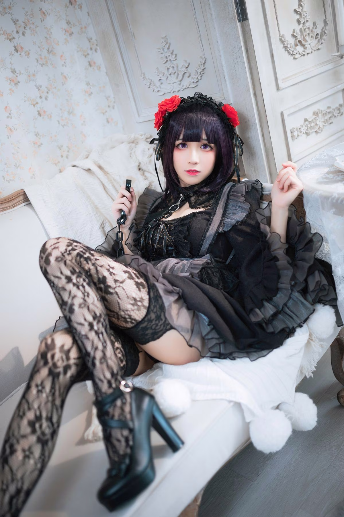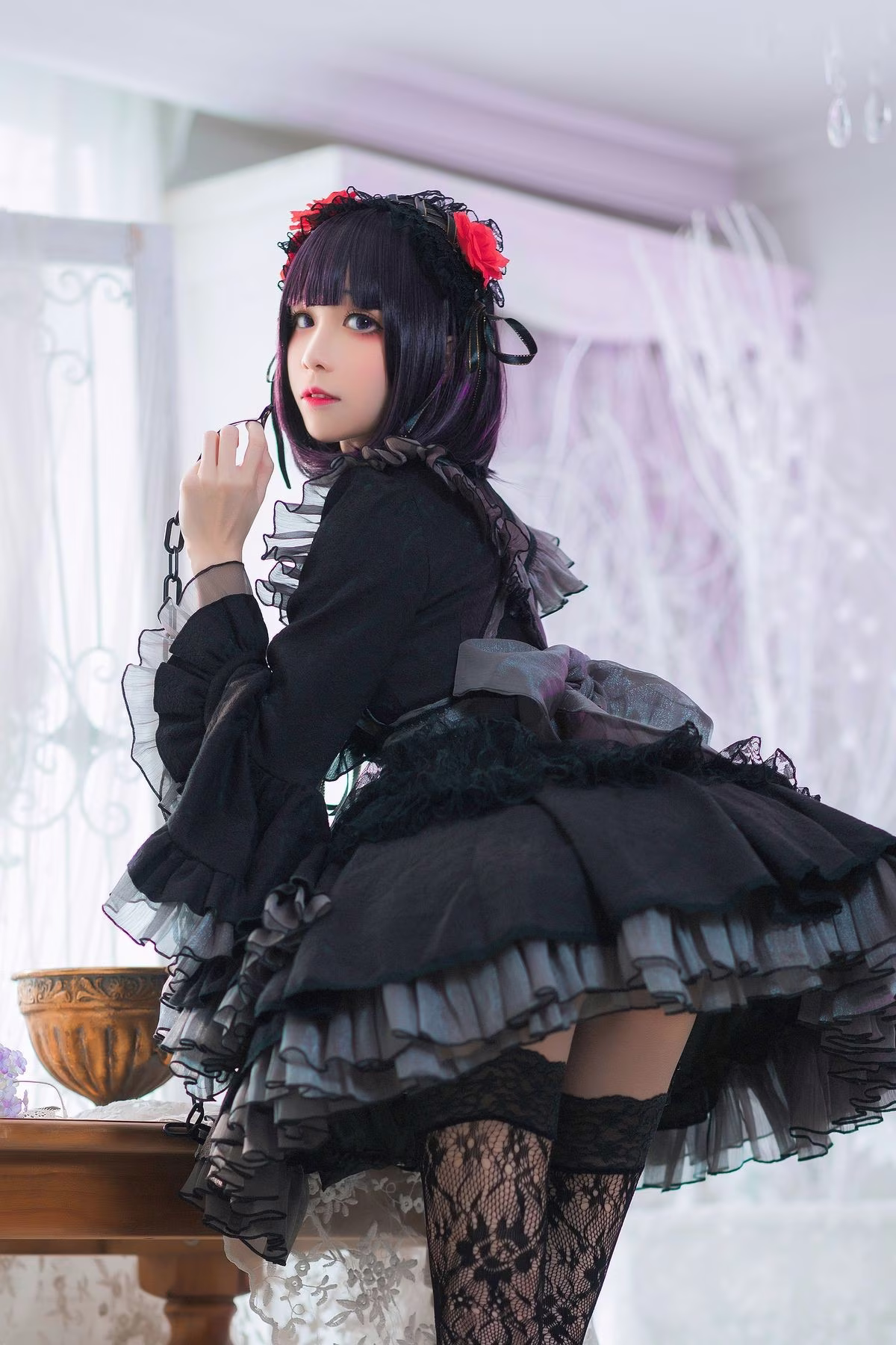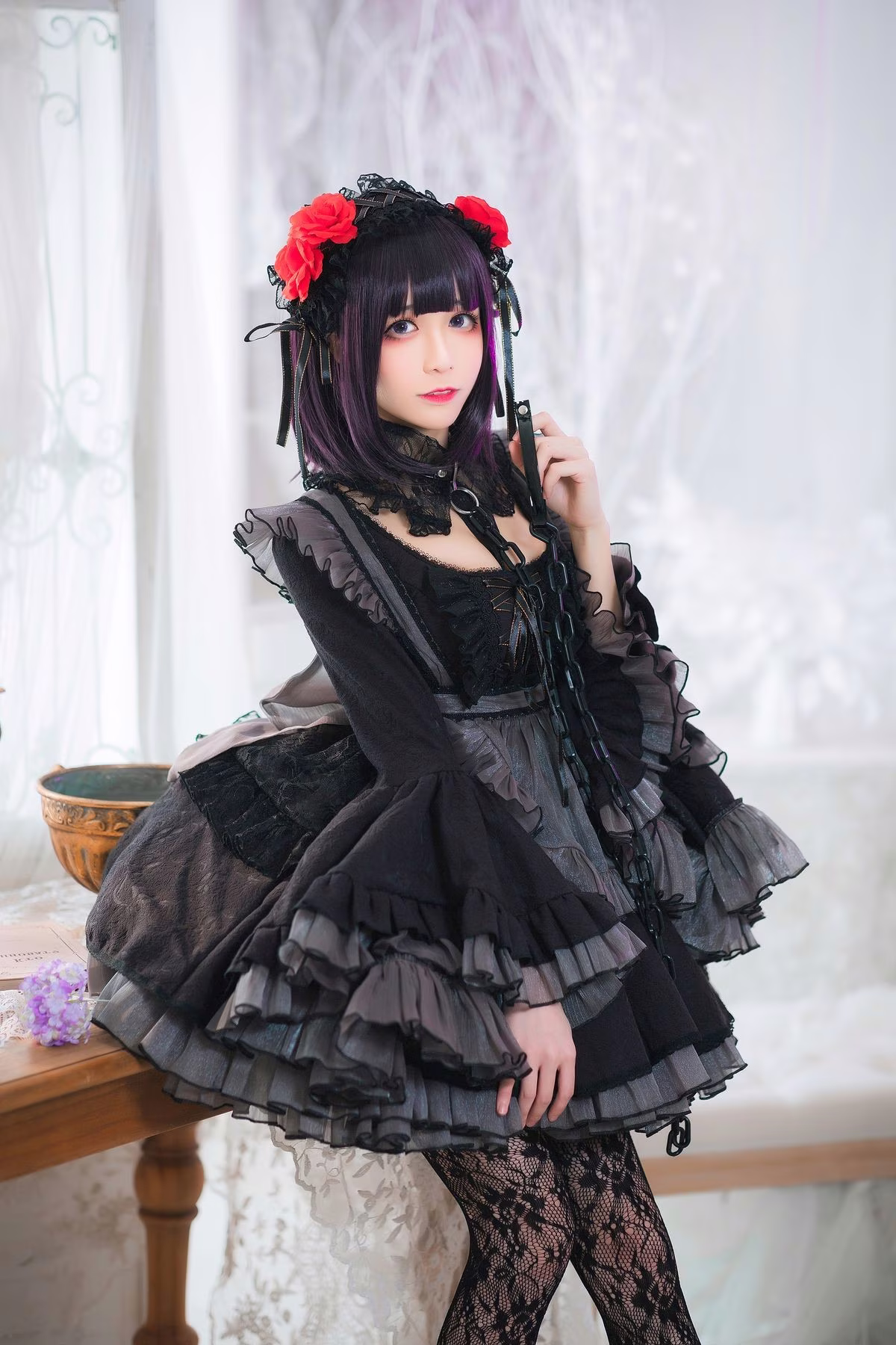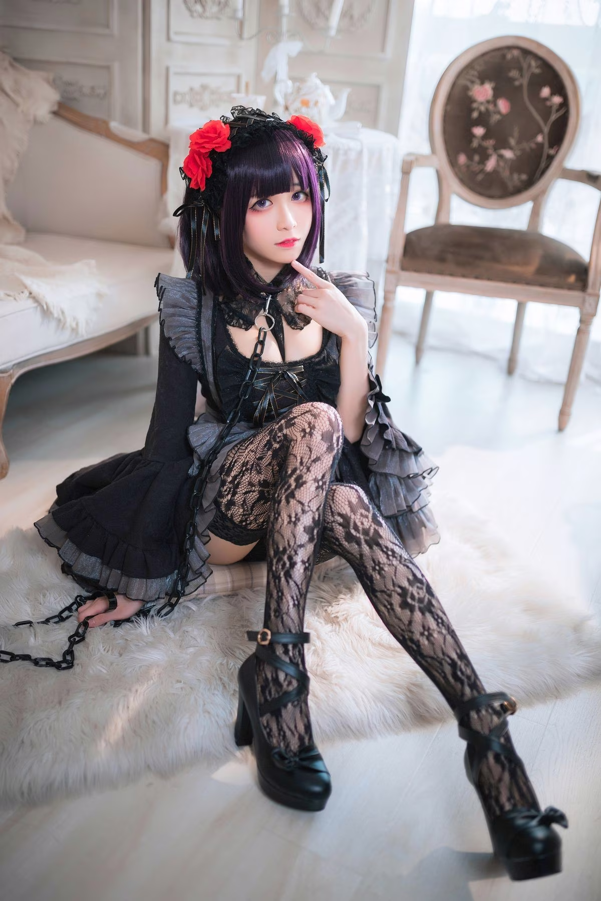 In this photoshoot Coser Tomoyo Jiang embodies the character Kuroe Shizuku with a unique Gothic style She wears a striking all-black outfit adorned with intricate lace and ruffle details exuding a mysterious and captivating allure The thigh-high fishnet stockings and high-heeled shoes further enhance her sensual appeal With a cool yet captivating expression Tomoyo Jiang perfectly captures Kuroe Shizukus enigmatic aura The luxurious interior setting accentuates the characters elegant and bewitching presence This is a truly impressive cosplay showcasing meticulous attention to detail from the costume to the overall portrayal guaranteed to mesmerize viewers