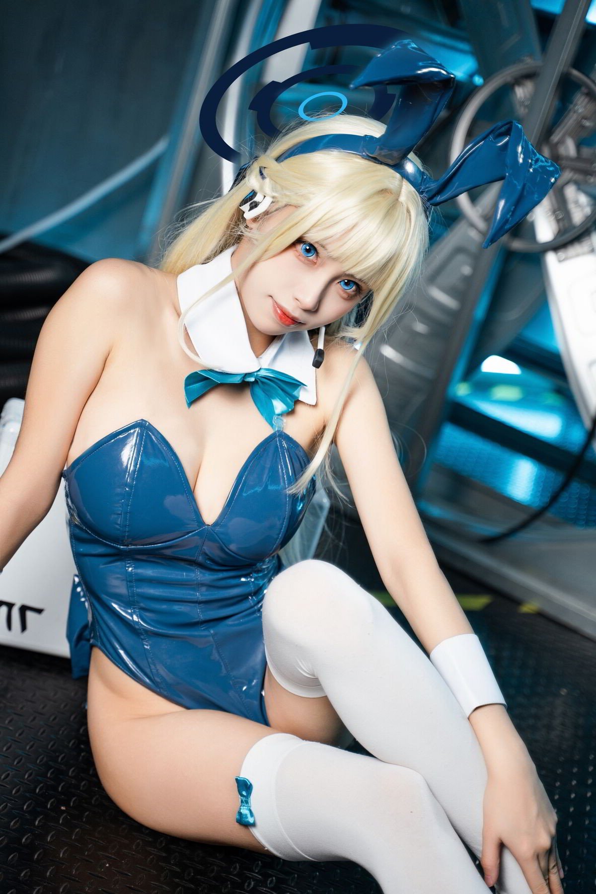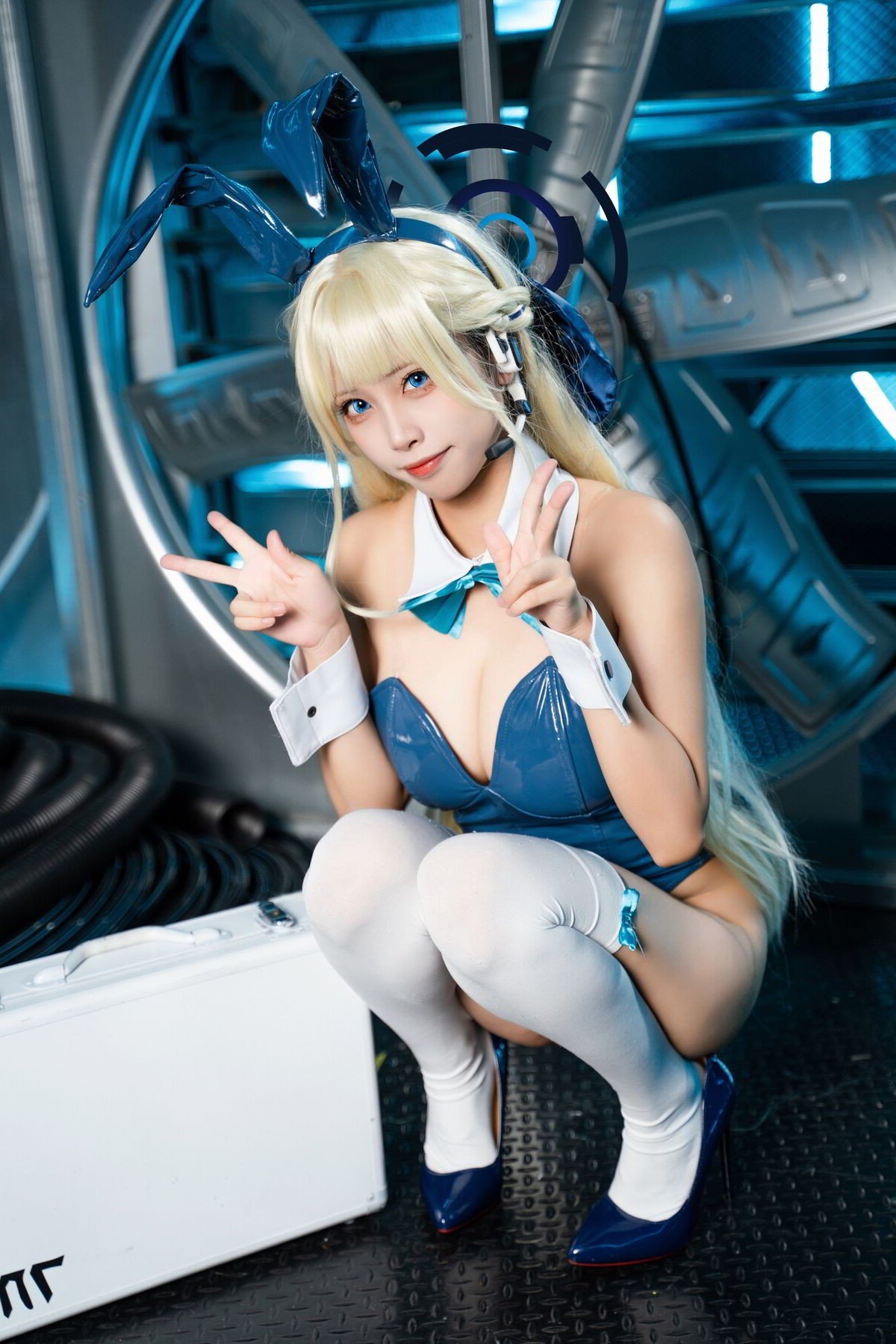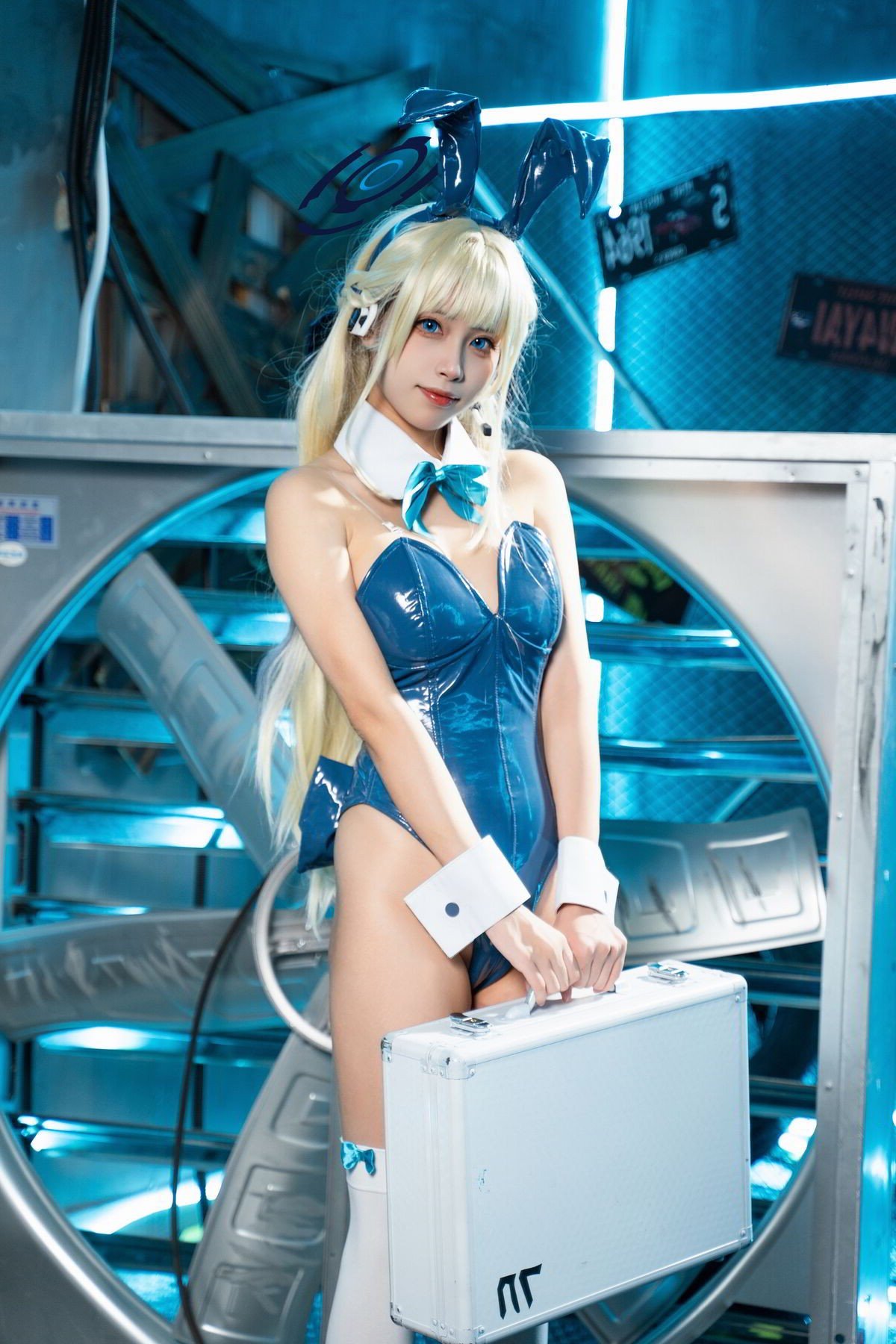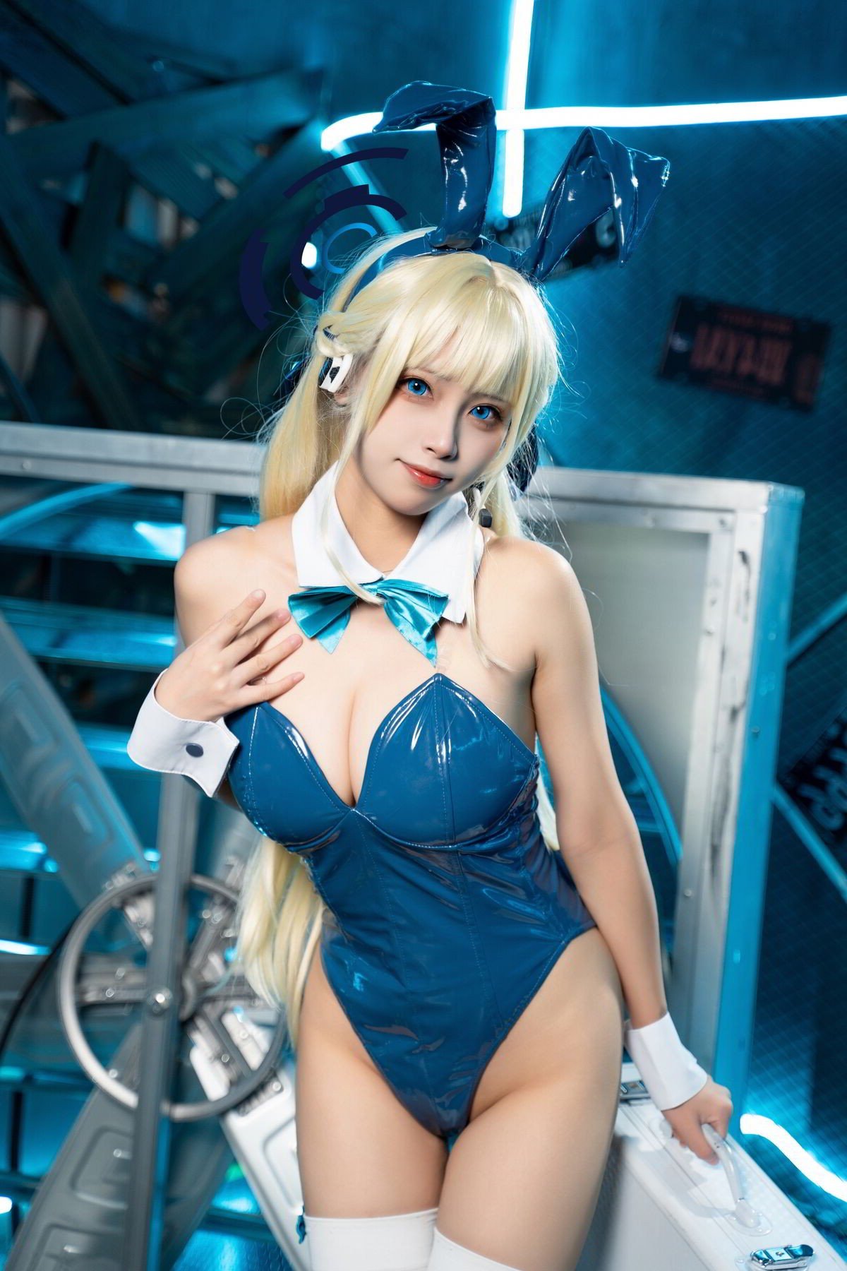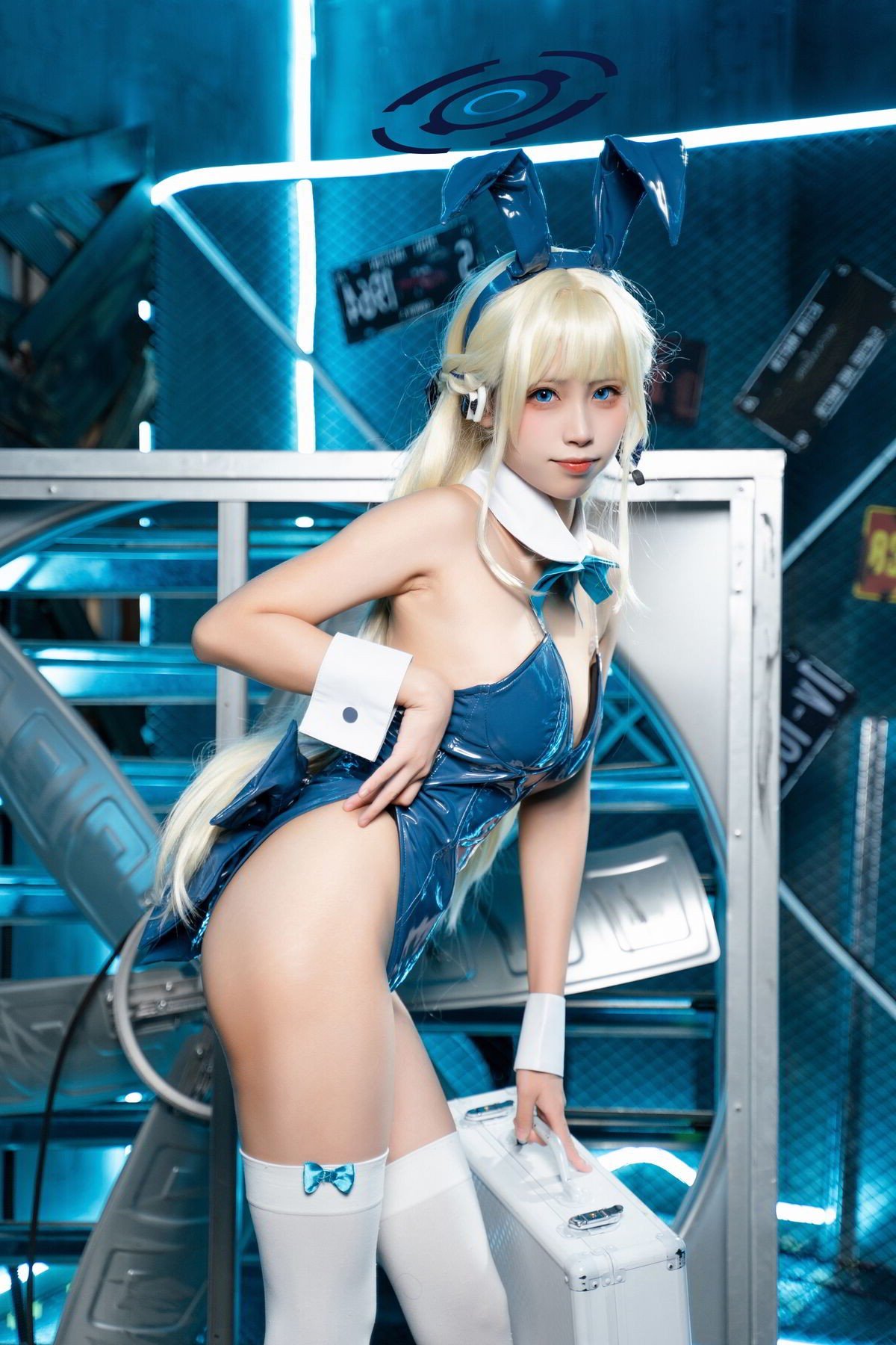 Coser San Wu Ren Xing delivers an outstanding portrayal of the Asuma Toki Bunny Girl character from the Blue Archive game. Dressed in the iconic blue bunny girl outfit, complete with playful rabbit ears and stylish headphones, she exudes a beauty that is both sweet and alluring. Every detail of the costume is meticulously presented, from the form-fitting bodysuit that highlights her elegant curves to the pristine white thigh-high stockings. Her captivating gaze and lustrous blonde hair perfectly capture Asuma Toki's essence. The sci-fi themed background, illuminated by mystical blue neon lights, further enhances the unique and impressive appeal of this photoshoot. This is undoubtedly an artistic and eye-catching cosplay collection.