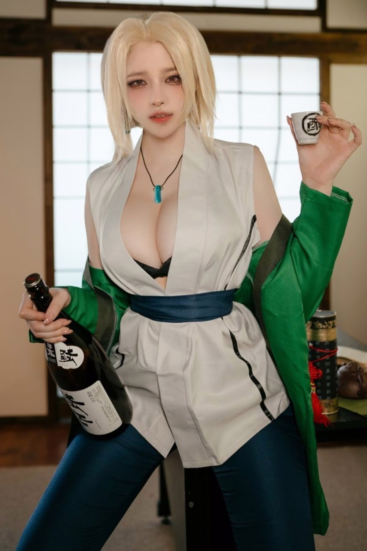 In this striking set, Coser@暴走鲤鱼王 - 12月合集 Part01, the model flawlessly embodies the legendary Fifth Hokage, Tsunade, from Naruto. Her vibrant blonde hair, piercing gaze, and iconic green and white attire perfectly capture Tsunade's formidable yet alluring essence. Posing confidently with a sake cup and bottle, she exudes the character's signature bold and free-spirited demeanor. Every detail, from the meticulously crafted costume to the expressive facial features, brings this beloved anime character vividly to life. This captivating portrayal is a highlight of the special collection, drawing viewers into Tsunade's powerful world.