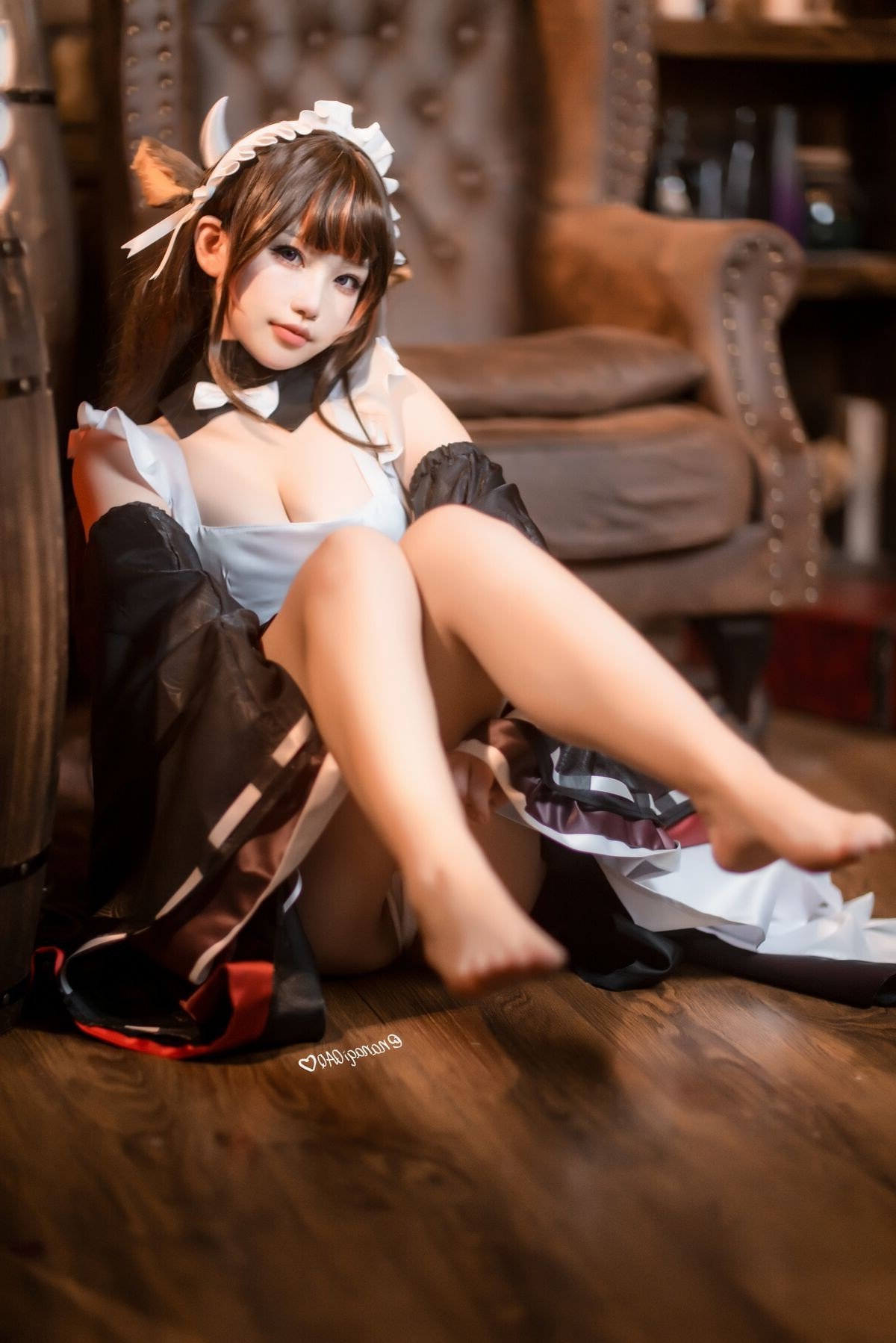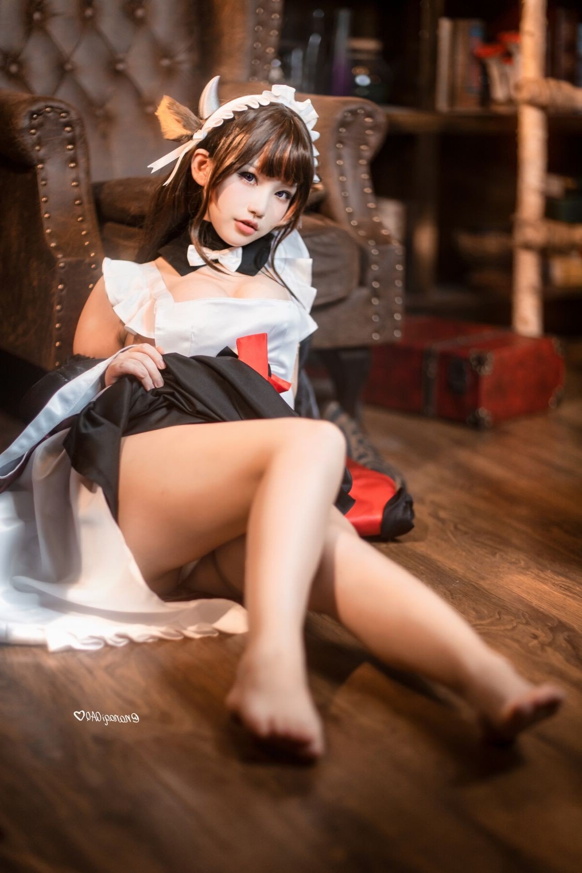 This captivating image features Coser San Wu Ren Xing embodying a high-cut maid. Her elegant costume with its distinctive design accentuates her graceful figure. San Wu Ren Xing's pose holding a tray exudes both dedication and undeniable charm. The meticulous attention to detail in her outfit and her expressive demeanor create a powerful and alluring portrayal of the character. This cosplay showcases exceptional artistry and professionalism making it a compelling visual experience for enthusiasts of maid costumes and character interpretations.
