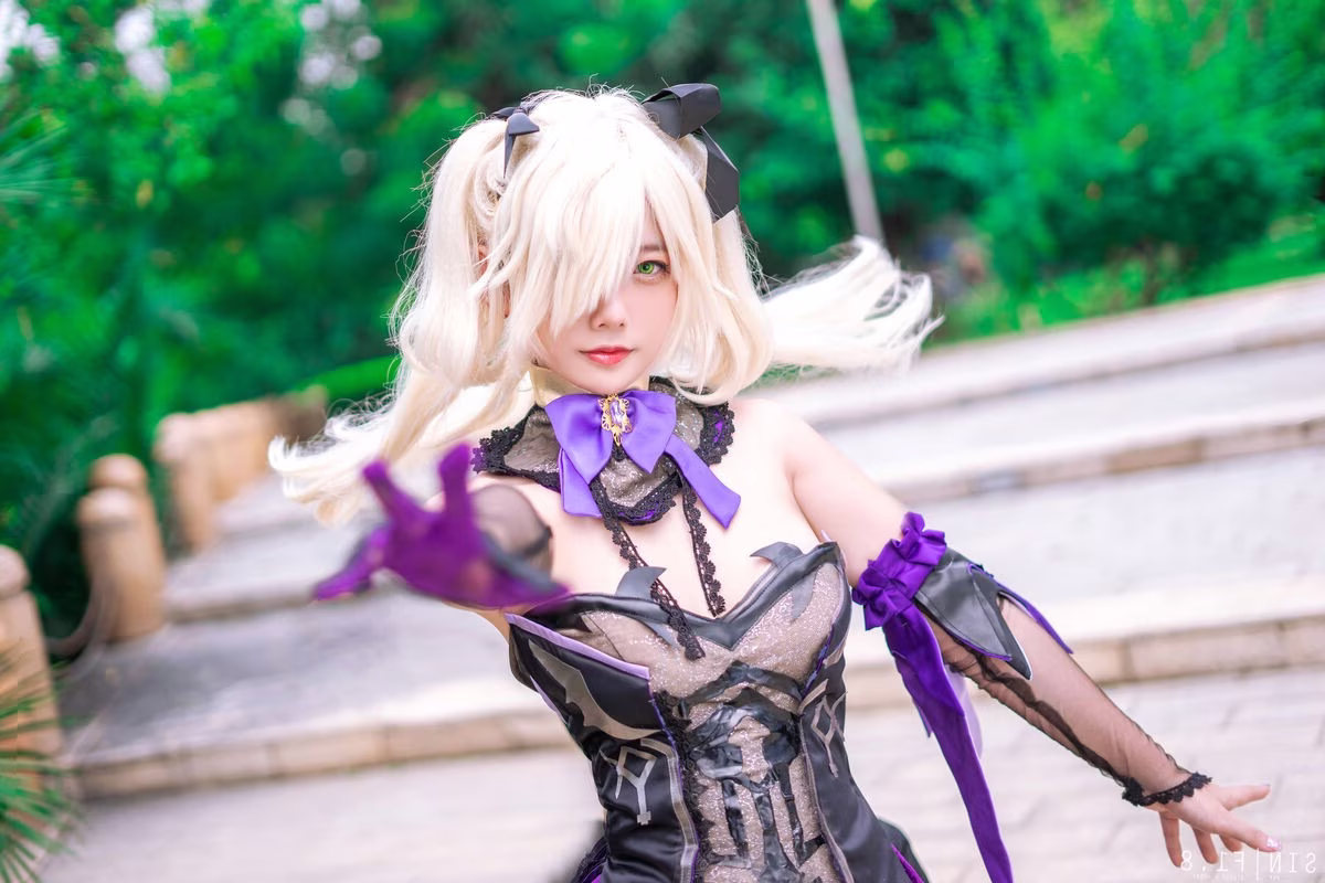 Witness the impressive transformation of Coser Messie Huang as Fischl from Genshin Impact. This image showcases a meticulously crafted purple and black costume, faithfully recreating the Prinzessin der Verurteilung. Messie Huang perfectly captures Fischl's mysterious and powerful aura through her pose especially with her hand raised as if summoning Electro energy. Her golden blonde hair and intricate accessories complete the enchanting and enigmatic look. The detailed craftsmanship of the outfit and the expressive portrayal bring Fischl to life as if stepping directly out of Teyvat. Viewers will be mesmerized by this creative artistry in cosplay.