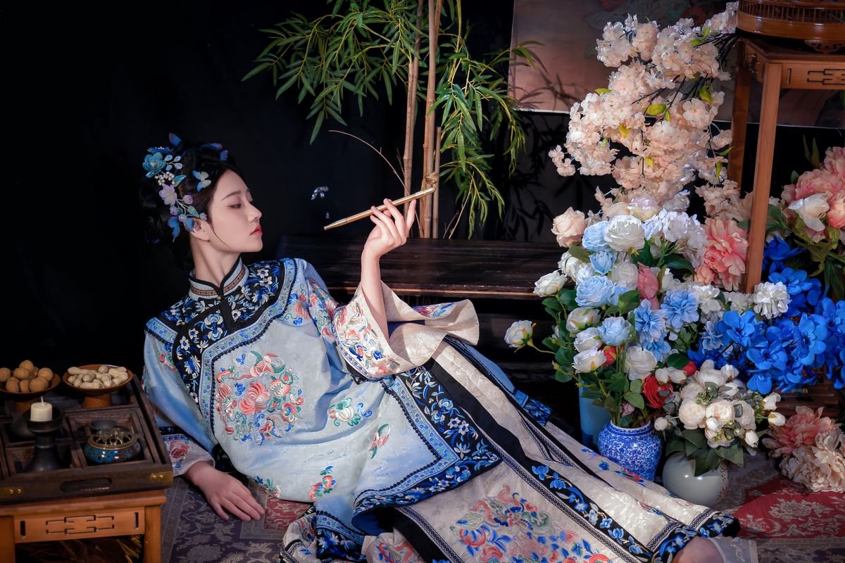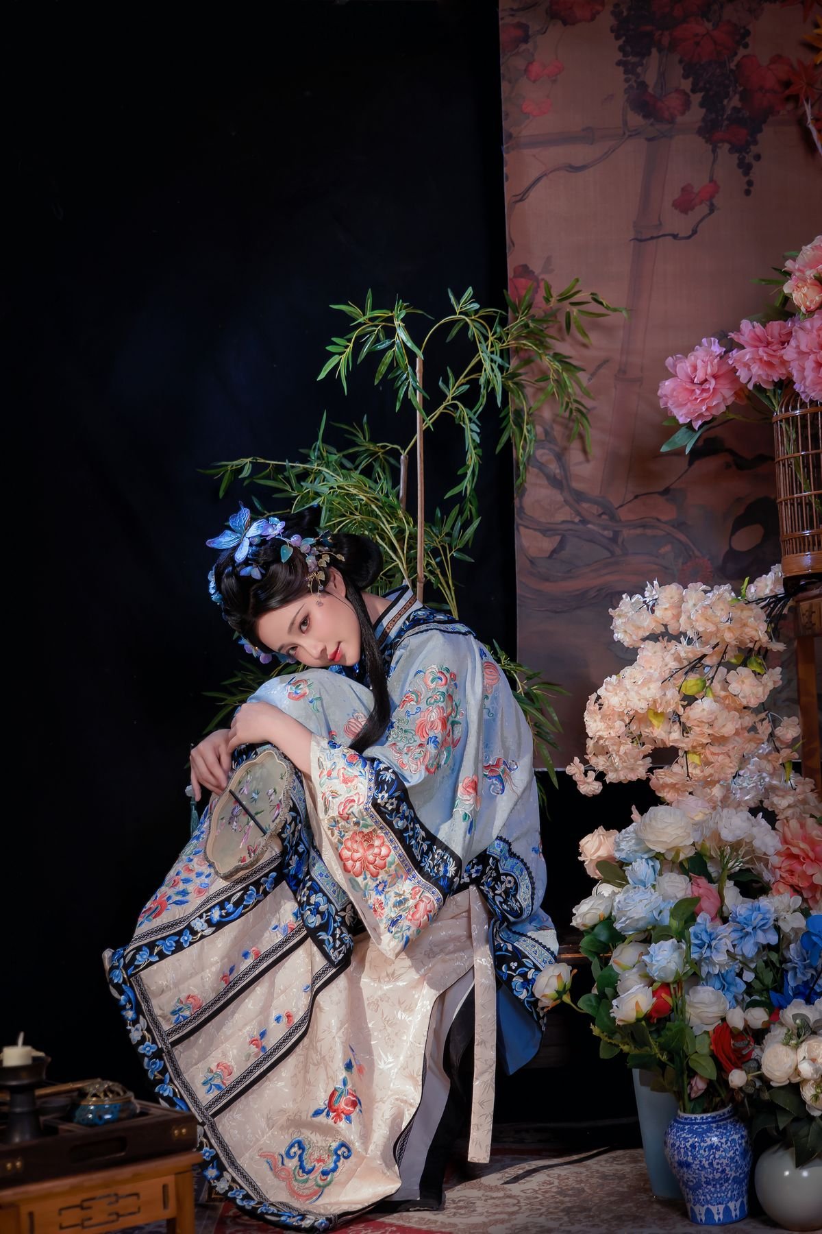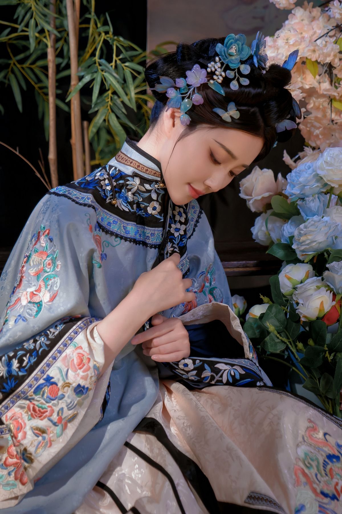 In this captivating image coser Nian Nian embodies the character 丝兰陵 exuding classic and serene beauty. She is adorned in an exquisite traditional Chinese costume featuring a dominant blue palette intricately embroidered with rich floral patterns. Her dark hair is elegantly styled in an updo embellished with delicate blue flower accessories creating a harmonious and noble aesthetic. Her deep gaze and gentle hand gesture convey grace and sophistication. The minimalist background featuring green bamboo foliage further accentuates the characters timeless and tranquil charm. This artistic cosplay showcases meticulous attention to both the elaborate attire and the captivating demeanor.Vietnamese Cultural Beauty: Girl in Traditional Attire