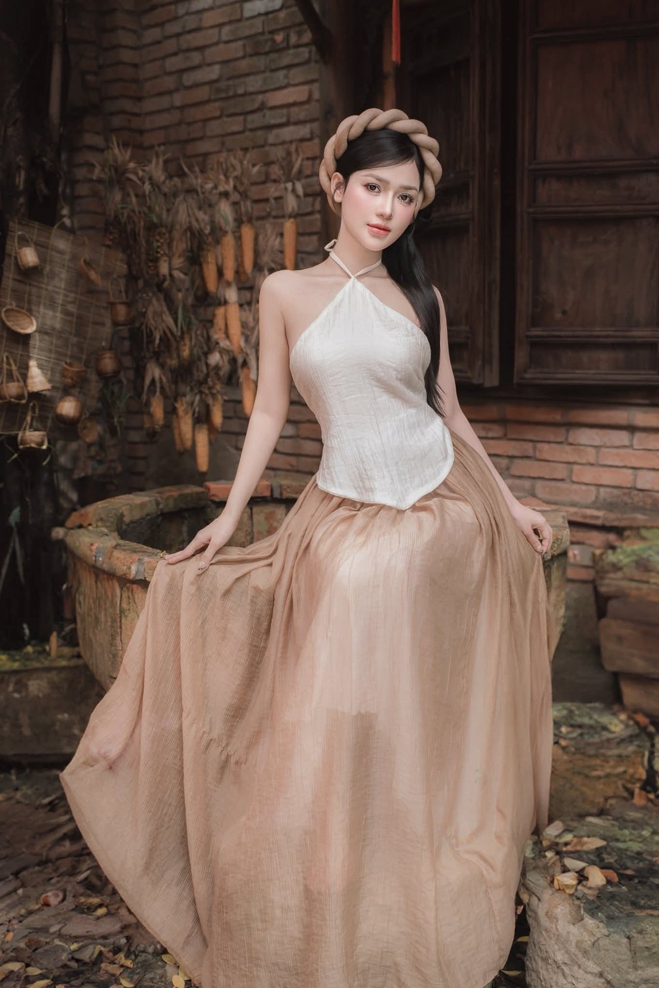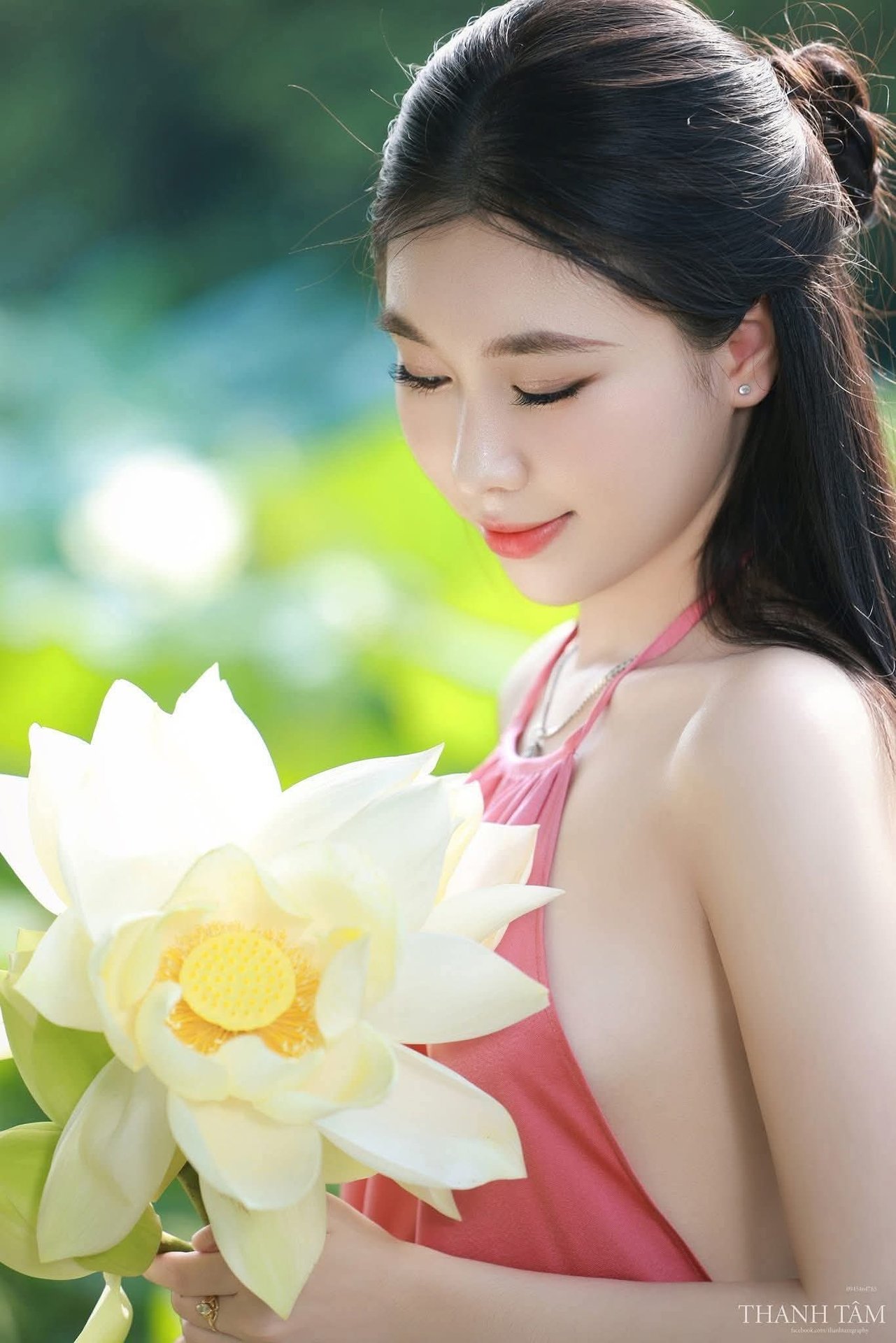 This photograph captures the elegant and graceful beauty of a Vietnamese girl in traditional-inspired attire. The girl stands out with her pristine white Ao Yem top combined with a flowing long beige skirt creating a harmonious and captivating overall look. Her gentle beauty radiates from her eyes a soft smile and neatly braided hair highlighting her delicate facial features. The ancient setting with brick walls and rustic potted plants further emphasizes her pure beauty evoking deep traditional cultural values. This is a subtle blend of classic beauty and modern style honoring the timeless charm of Vietnamese women.Elegant Vietnamese Girl in Pink Ao Yem by Lotus Pond, Capturing Traditional Beauty and Serenity