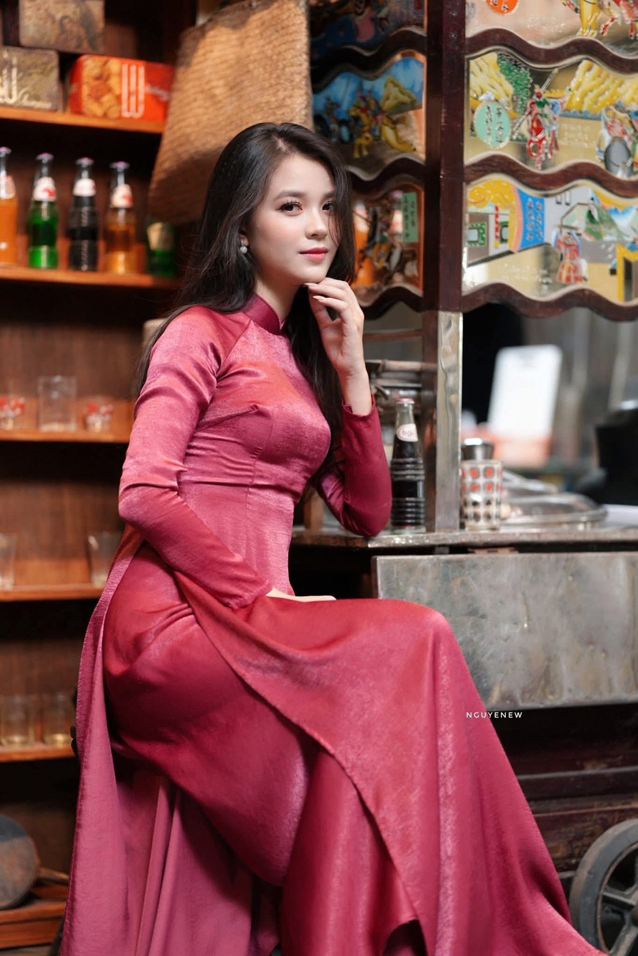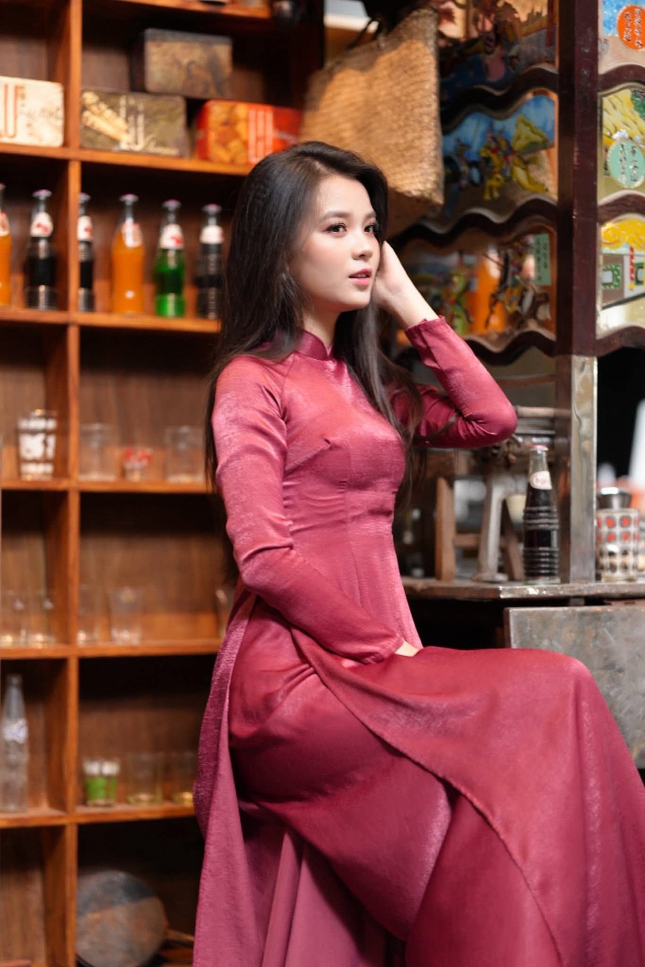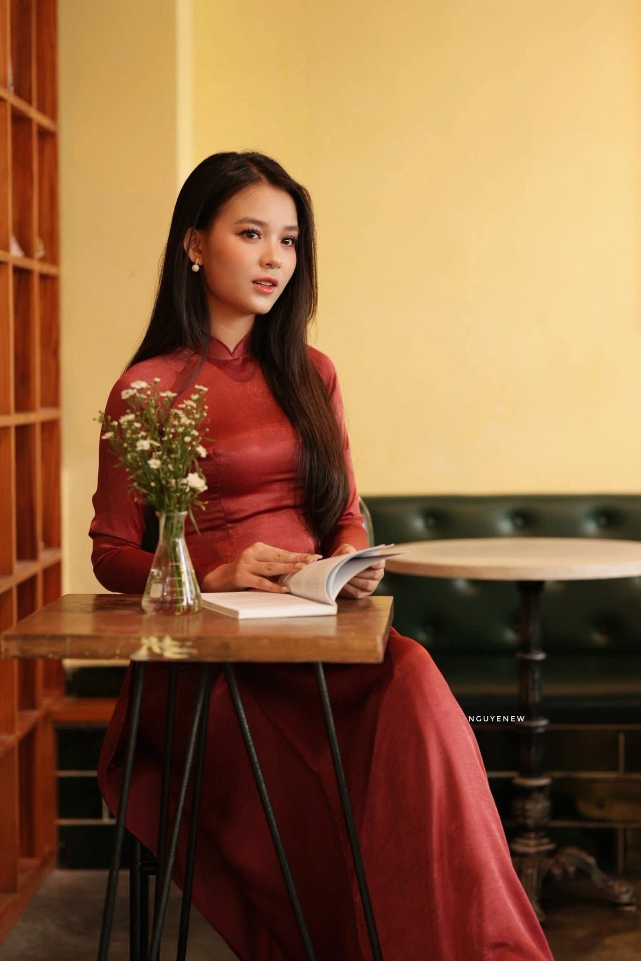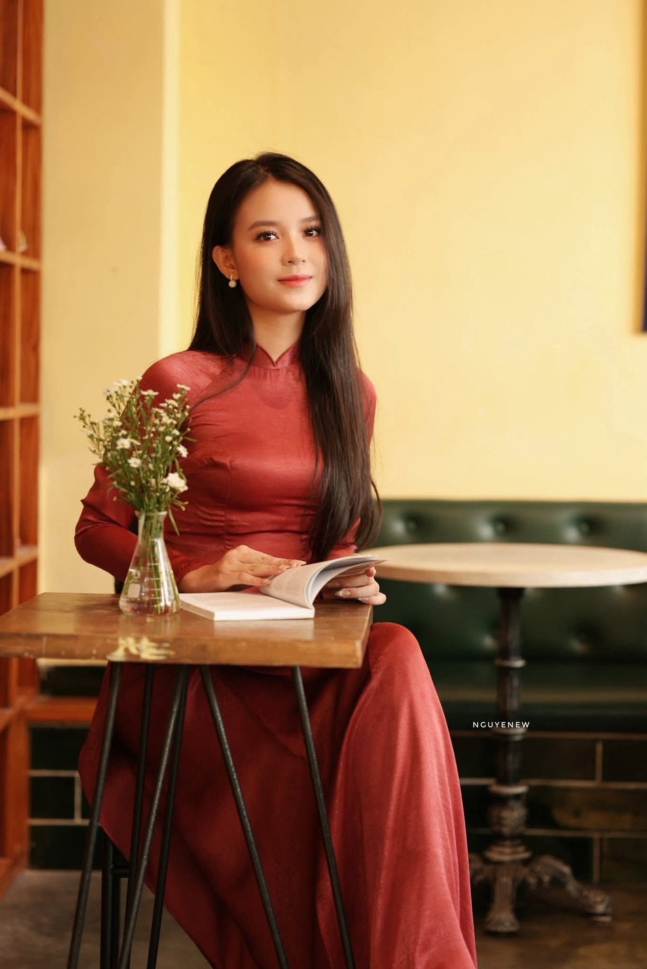 This photo captures a beautiful young Vietnamese woman dressed in a traditional earthy red Ao Dai, radiating elegance and grace. She is seated at a wooden table in the cozy ambiance of a cafe, holding an open book, her gaze gentle and forward. The soft Ao Dai fabric gracefully accentuates her figure, highlighting the unique charm of Vietnamese women. The harmonious blend of traditional attire and a modern setting creates a captivating image, reflecting a refined lifestyle and cultural appreciation. This portrayal not only symbolizes the essence of Asian beauty but also evokes a sense of peace and tranquility, inviting viewers to admire the timeless allure of the Ao Dai and the elegant demeanor of a Vietnamese girl.Elegant Vietnamese Ao Dai Beauty Amidst Vibrant Flower Market: Youthful Charm