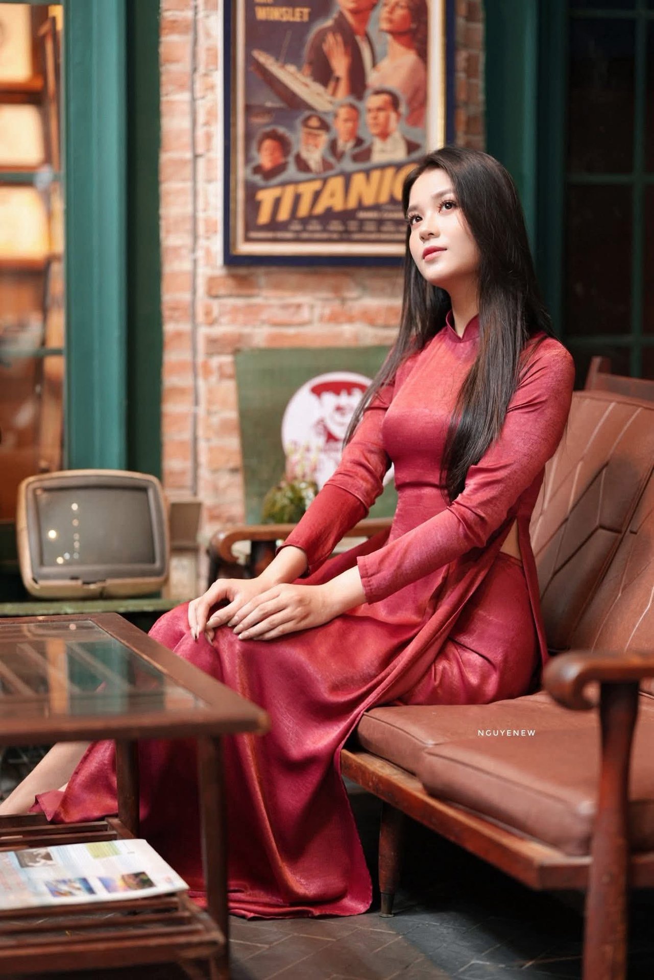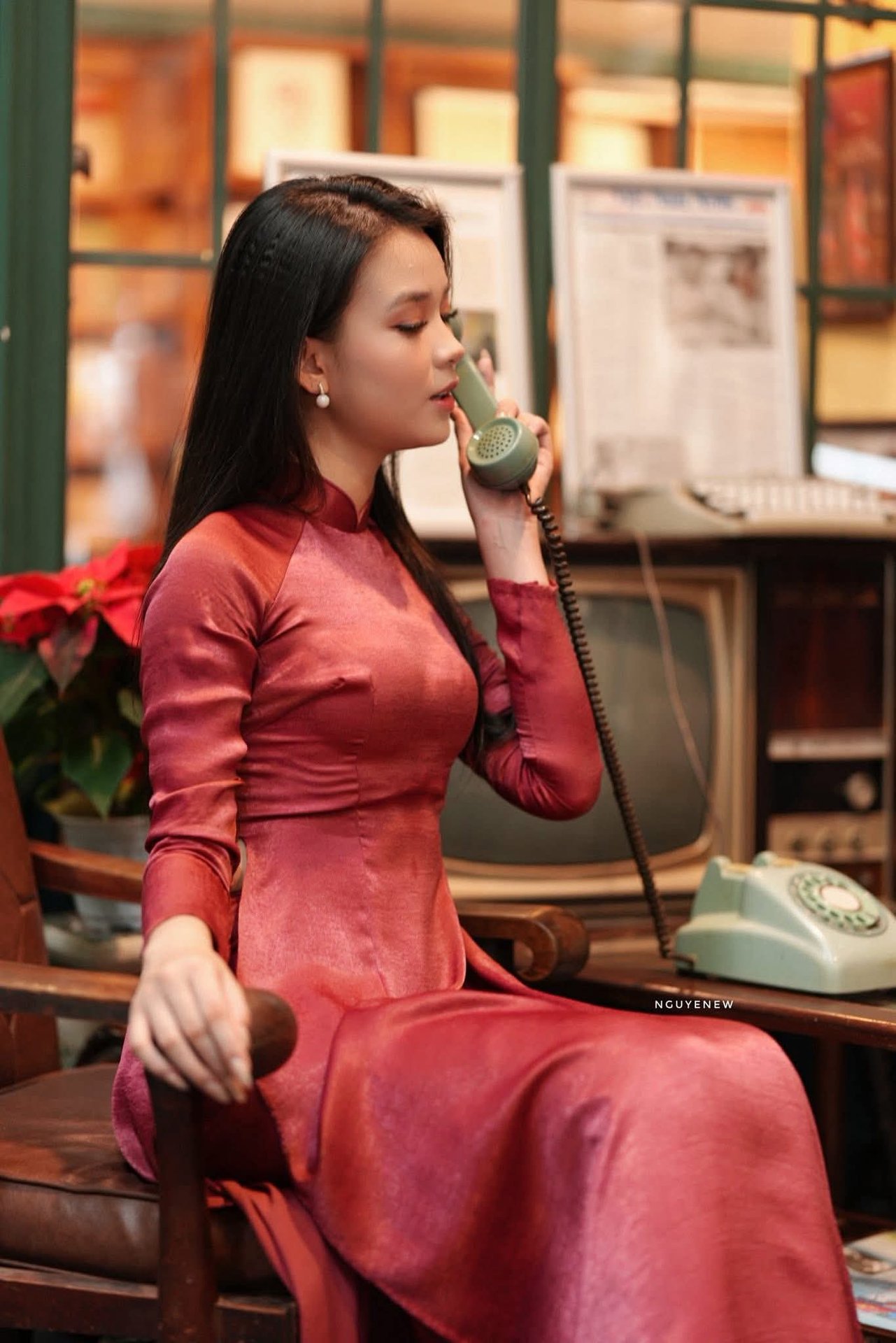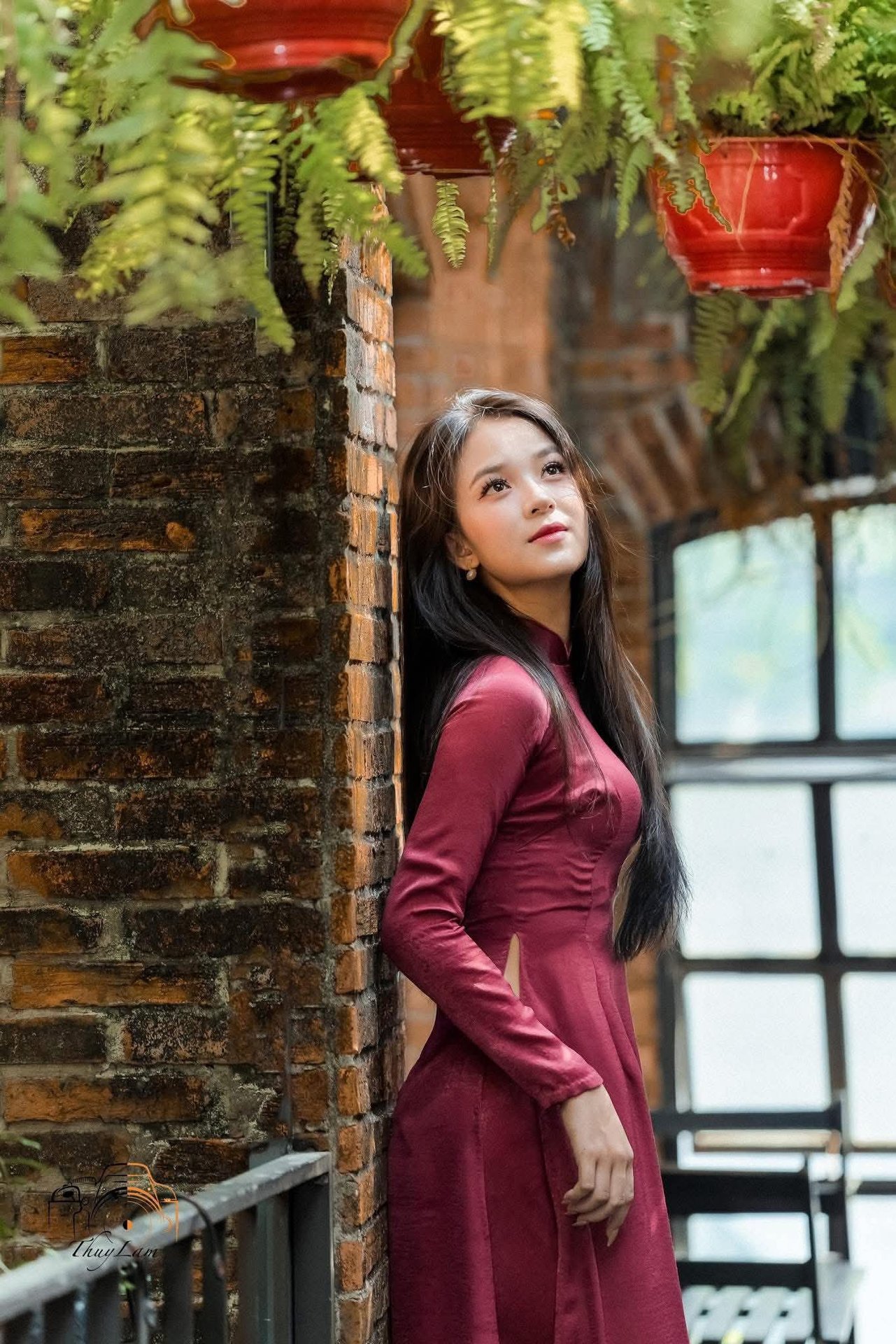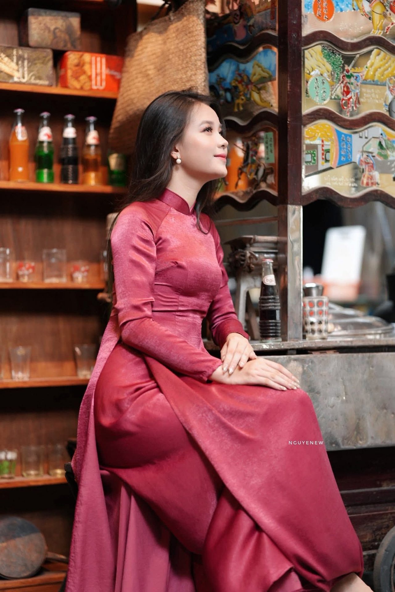 This photo captures a beautiful young Vietnamese woman dressed in a traditional earthy red Ao Dai, radiating elegance and grace. She is seated at a wooden table in the cozy ambiance of a cafe, holding an open book, her gaze gentle and forward. The soft Ao Dai fabric gracefully accentuates her figure, highlighting the unique charm of Vietnamese women. The harmonious blend of traditional attire and a modern setting creates a captivating image, reflecting a refined lifestyle and cultural appreciation. This portrayal not only symbolizes the essence of Asian beauty but also evokes a sense of peace and tranquility, inviting viewers to admire the timeless allure of the Ao Dai and the elegant demeanor of a Vietnamese girl.Elegant Vietnamese Ao Dai Beauty Amidst Vibrant Flower Market: Youthful Charm