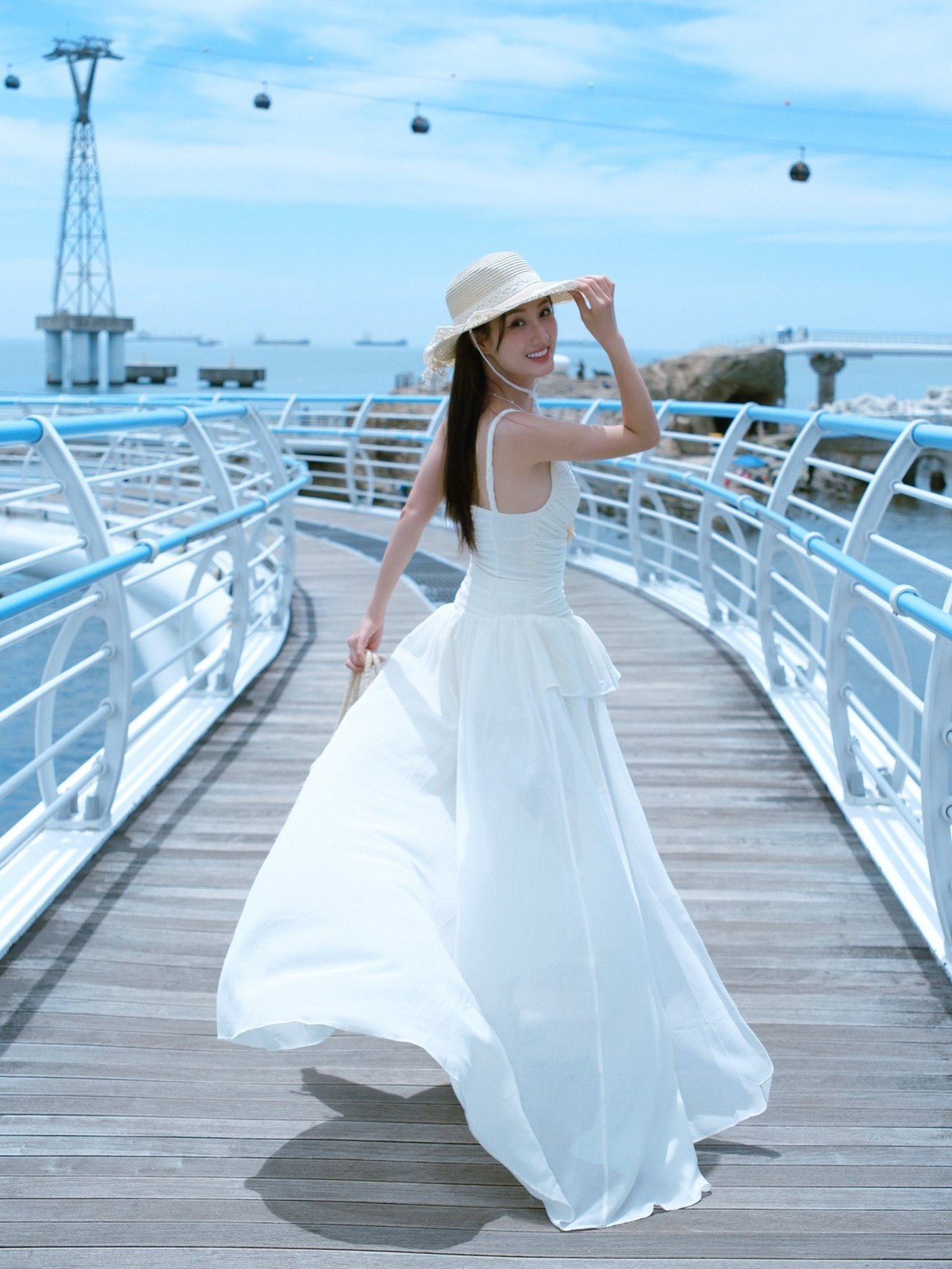 This enchanting photograph captures a beautiful Vietnamese girl in a pristine white Ao Dai. She exudes an elegant and graceful charm, adorned with a radiant smile and gentle eyes. Holding a delicate bouquet of white flowers further enhances her soft and refined appearance. The traditional Ao Dai flows gently as she stands on a paved path creating a poetic and serene scene. This image is not merely a fashion statement but a heartfelt celebration of Vietnamese cultural beauty embodied by a graceful woman. Her natural beauty and confident demeanor are sure to captivate every gaze.