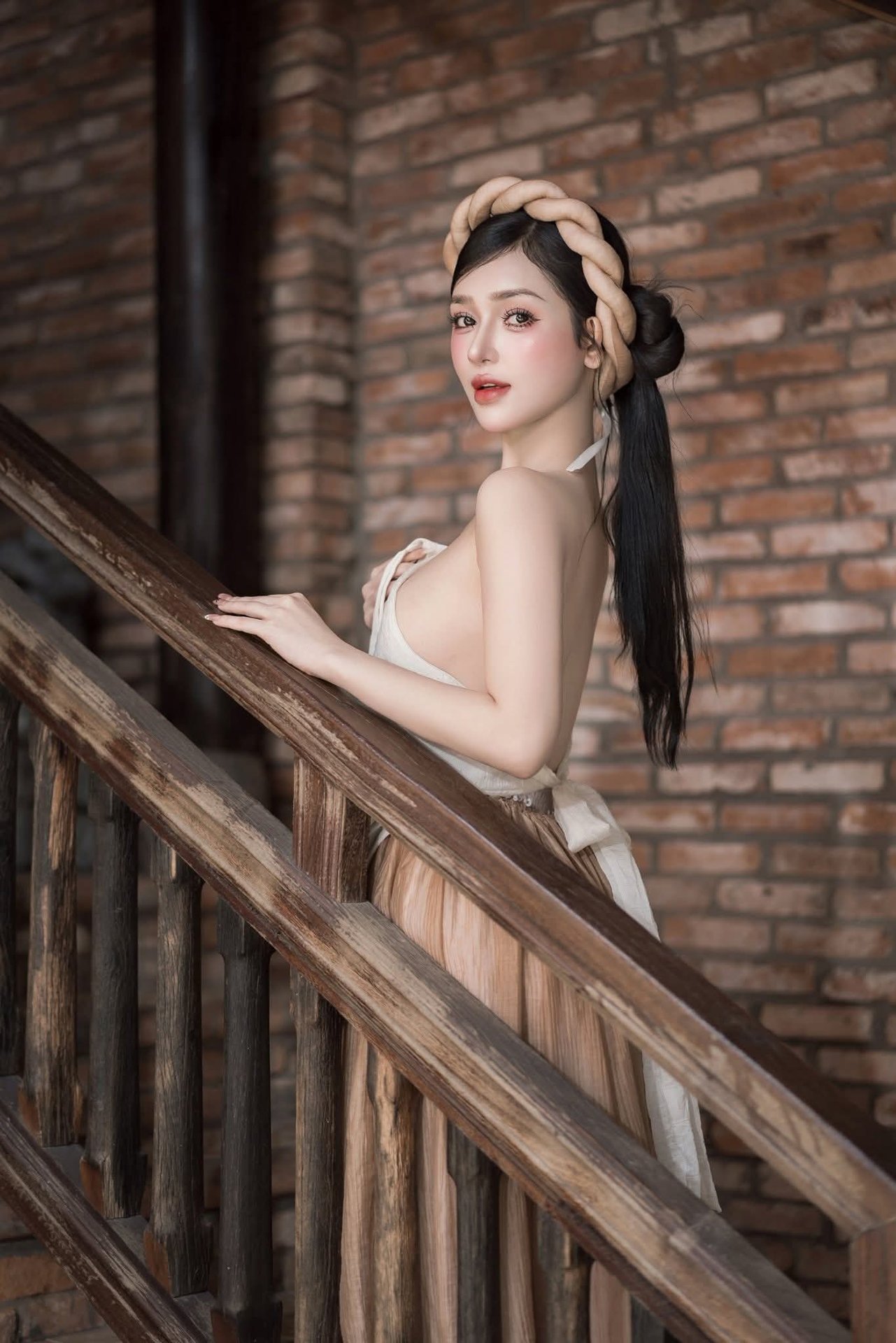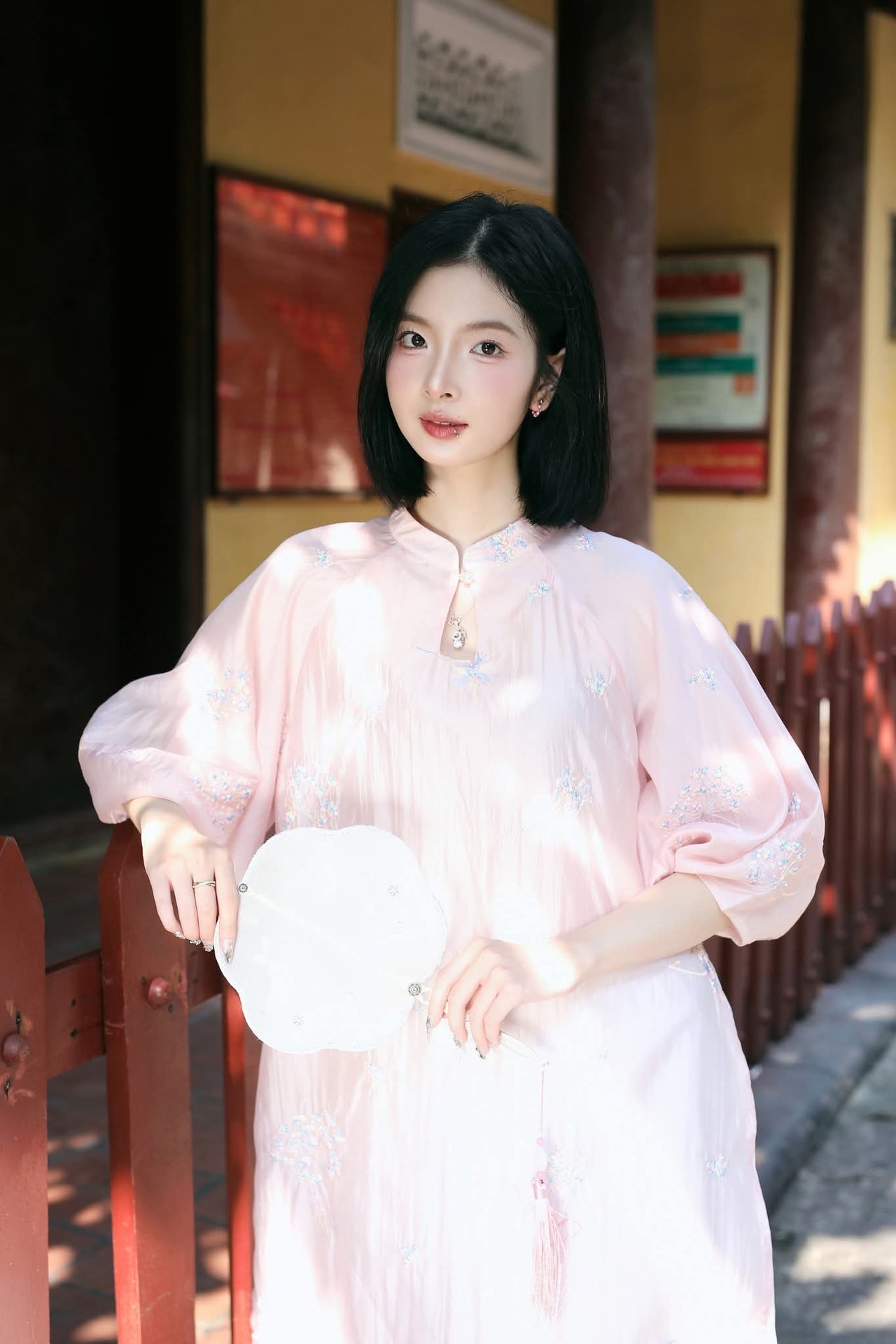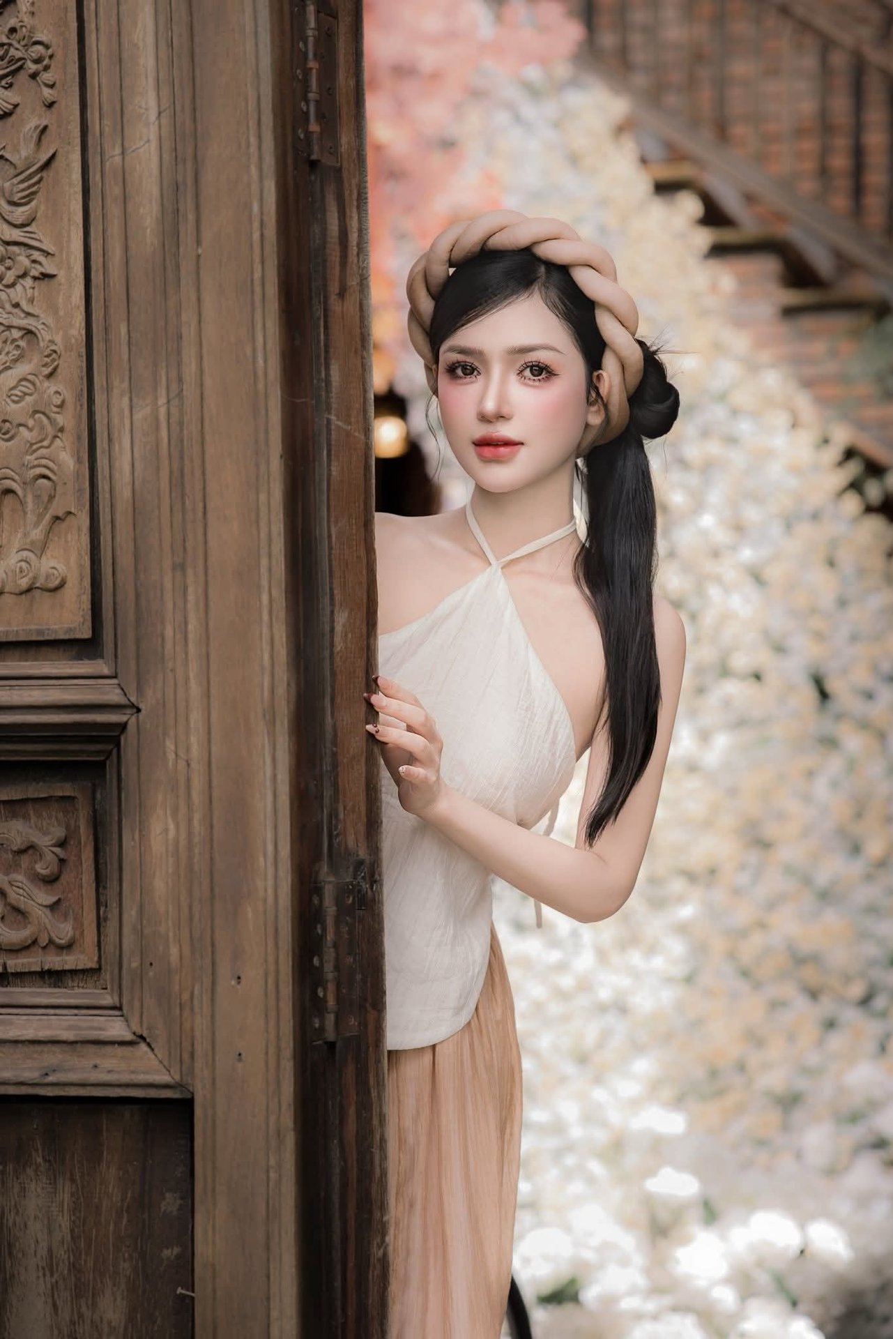 This stunning photograph captures a graceful Vietnamese woman adorned in a pristine pink and white Ao Dai. She sits elegantly on a classic park bench amidst the lush green scenery bathed in gentle sunlight. Her delicate beauty is further highlighted by her long flowing dark hair and the pure white bouquet she tenderly holds. The traditional Ao Dai is not merely an outfit but a profound symbol of elegance nobility and cultural heritage. This image beautifully conveys a sense of peace profound cultural beauty and the unique charming allure of Vietnamese women offering viewers a moment of tranquility and admiration.Hoang Khanh Ly 'Hot Girl at Boarding House': Pure Vietnamese Beauty Graces National Day 2/9
