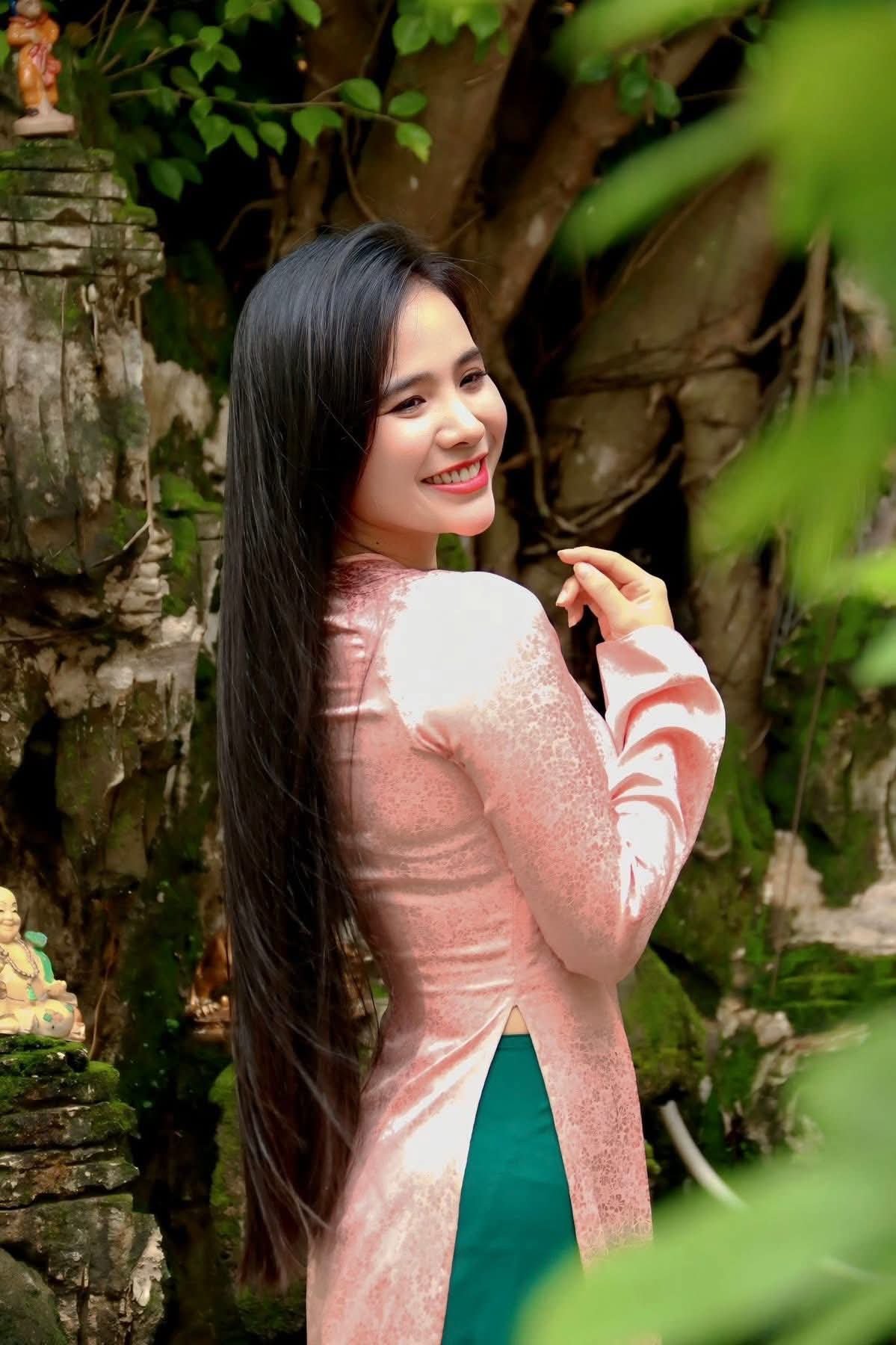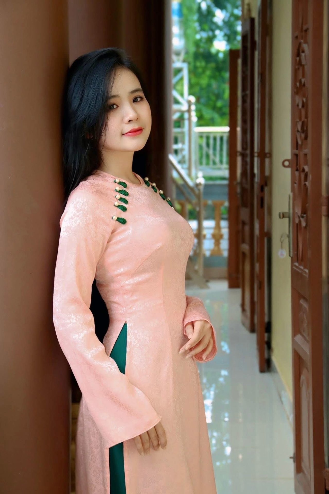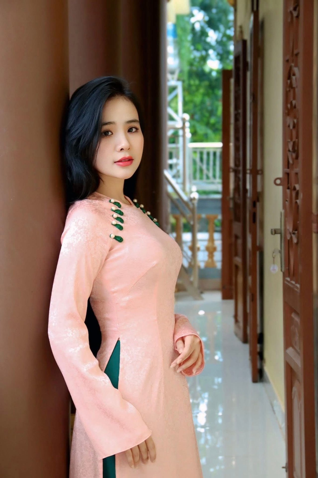 This stunning `portrait` captures the gentle elegance of a Vietnamese woman wearing a beautiful pink `silk Ao Dai`. The `traditional` attire, subtly adorned with delicate green frog buttons, enhances her graceful and refined appearance. Her long, flowing dark hair and serene smile highlight her pure Asian beauty. This high-quality `HD wallpaper` image is perfect for those seeking a peaceful and culturally rich visual experience, reflecting the timeless charm of Vietnamese `traditional` aesthetics. Ideal for desktops or mobile devices. Image ID: `1000017399`.
