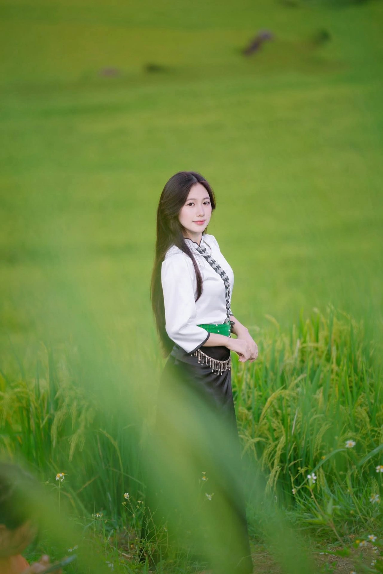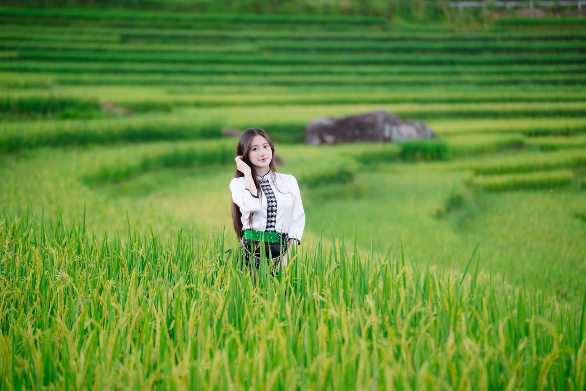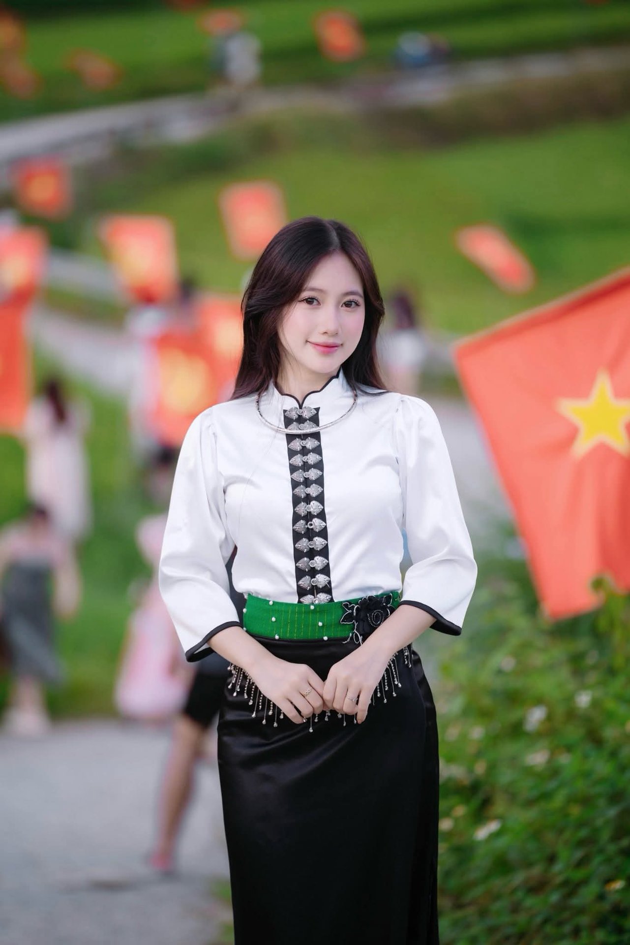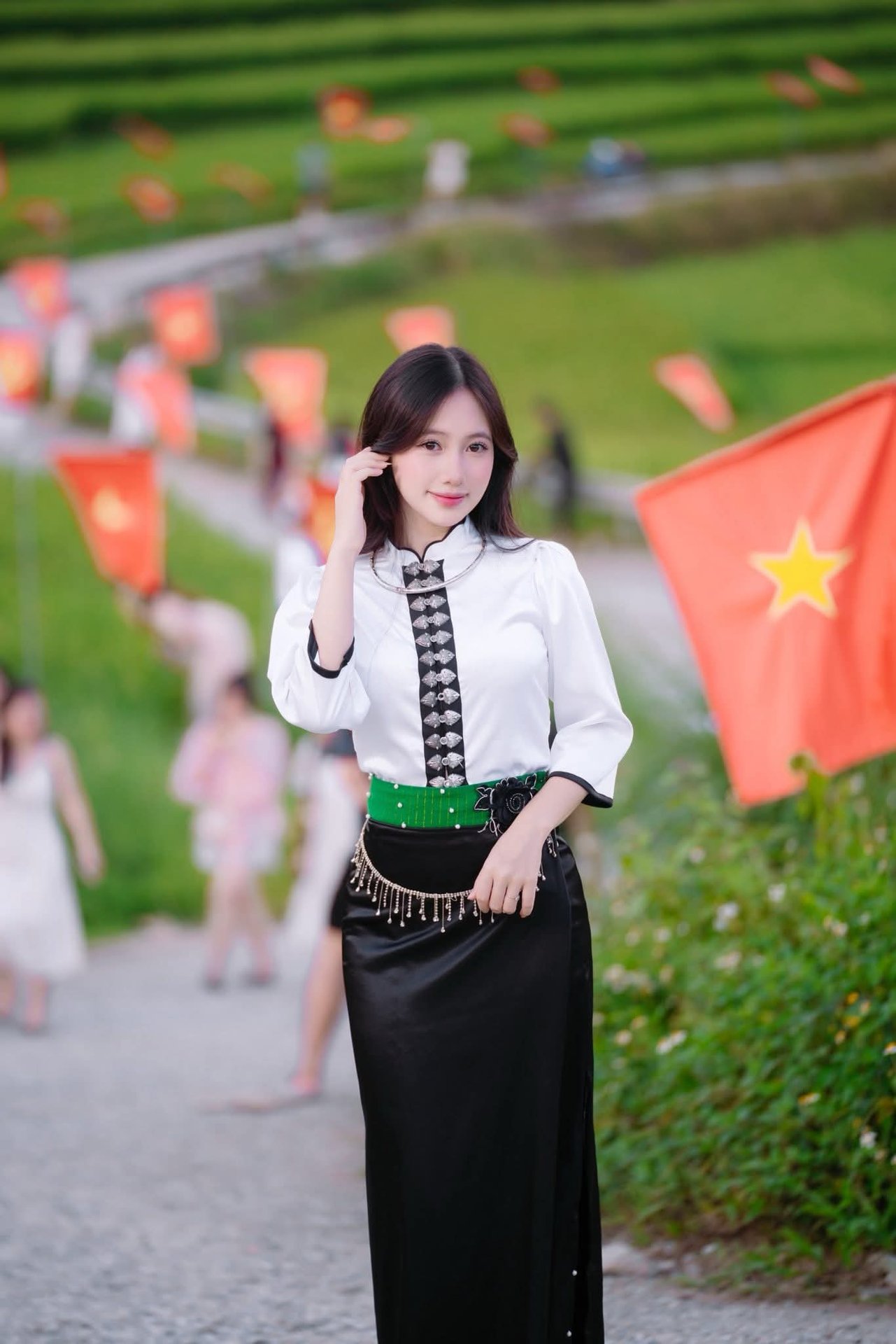 The image captures the graceful beauty of a Vietnamese girl in traditional ethnic costume. Her radiant smile and exquisite outfit, featuring a white embroidered top and a black skirt accentuated by a green sash, beautifully showcase the unique cultural essence of Vietnam's ethnic groups. In the background, a lush green landscape is adorned with vibrant Vietnamese flags, evoking a festive and patriotic atmosphere. This photograph not only celebrates the beauty of Vietnamese people but also highlights the rich diversity of Vietnamese culture and traditions, especially the traditional attire, a true symbol of national identity.Vietnamese Beauty: Elegant Traditional White Ao Dai Woman with Conical Hat
