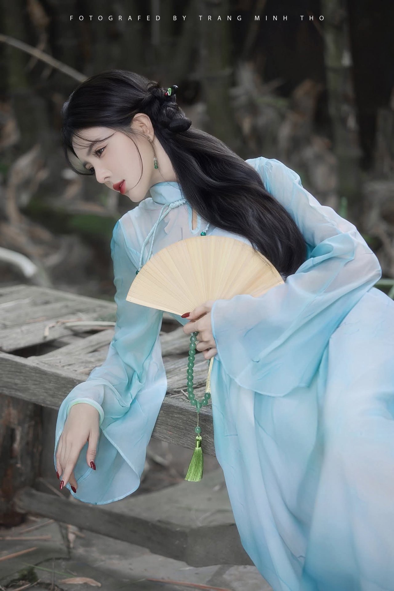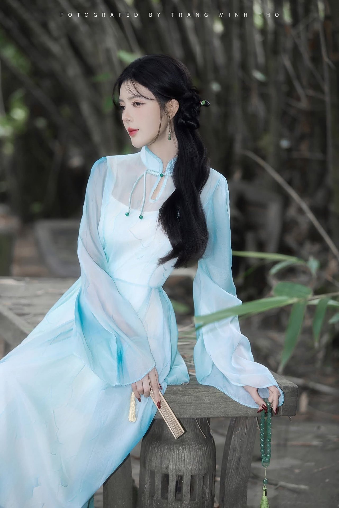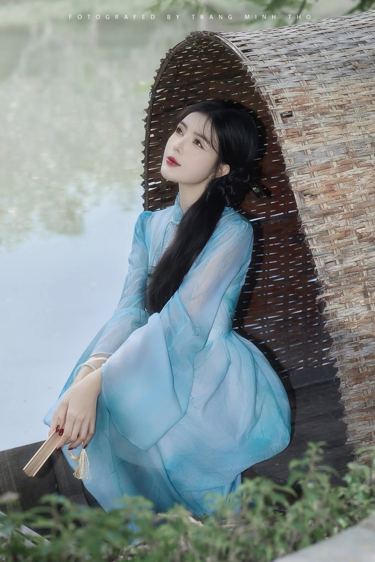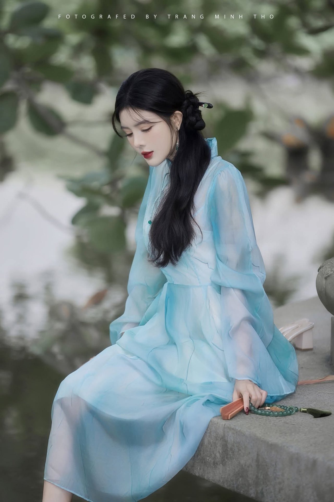 This stunning portrait captures a captivating hot girl with elegant long legs, gracefully seated by a dreamy pond. Dressed in beautiful traditional attire of soft pastel blue, she exudes an alluring and serene charm. The lush natural backdrop combined with classic architectural elements creates a truly aesthetic and poetic atmosphere. The image evokes a sense of peace and romance, subtly showcasing cultural beauty. It's an inspiring photograph for those who appreciate the harmonious blend between human elegance and a tranquil environment.Gentle Beauty of Vietnamese Woman in Traditional Ao Dai at Hoan Kiem Lake