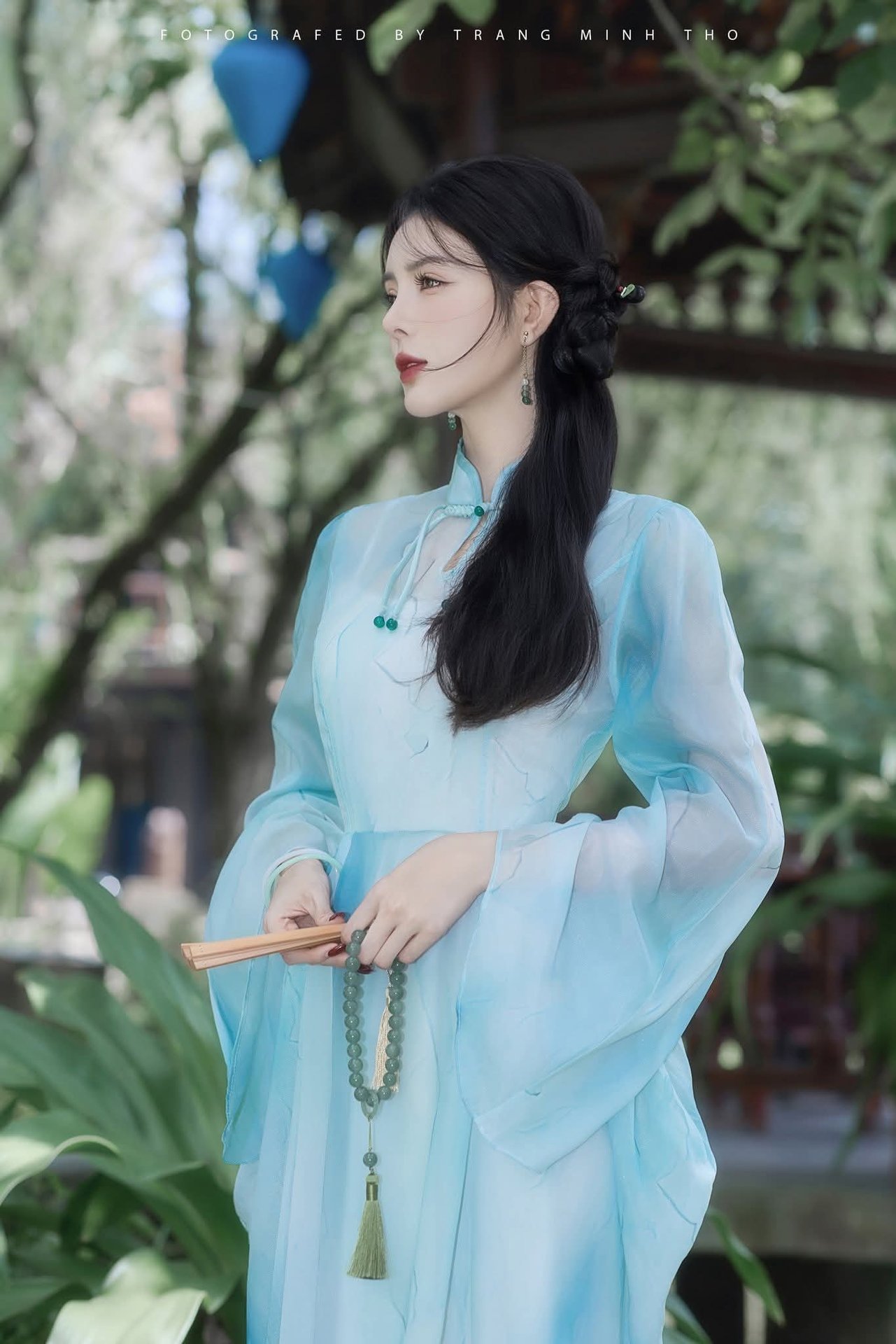 This captivating image portrays the serene beauty of a young woman adorned in traditional East Asian attire, exuding grace and allure. She stands delicately beside a vibrant red lantern, a powerful symbol of good fortune and warmth, creating an enchanting and poetic scene. Her gentle and elegant charm perfectly blends with the traditional architectural backdrop, evoking a sense of deep cultural values. While the outfit reflects a broader East Asian influence, the image beautifully conveys the enduring appreciation for classical beauty, a sentiment deeply cherished and admired by the Vietnamese people. This moment is not merely a portrait but a narrative of the interplay between past and present, offering a feeling of tranquility and nostalgia.