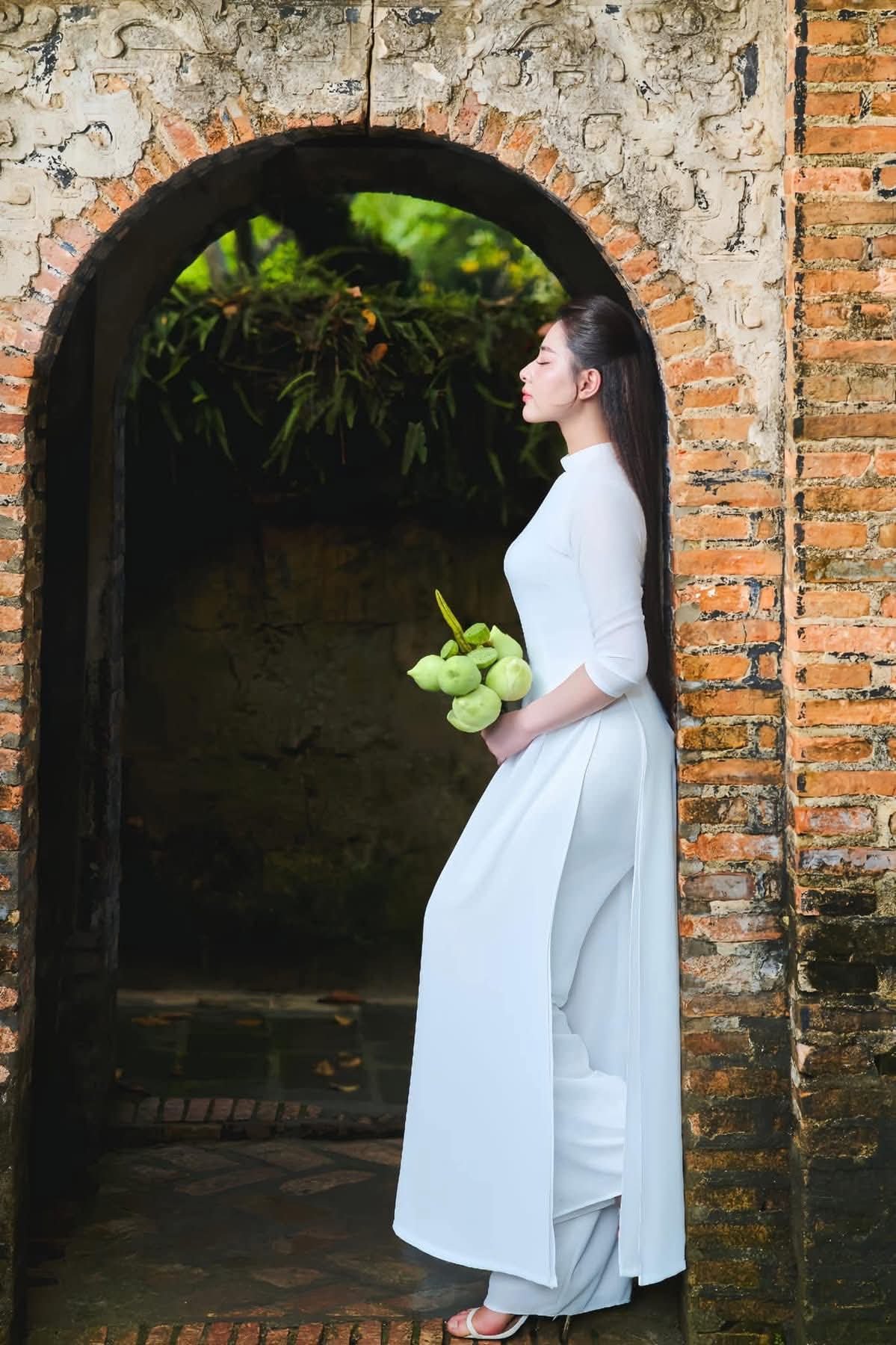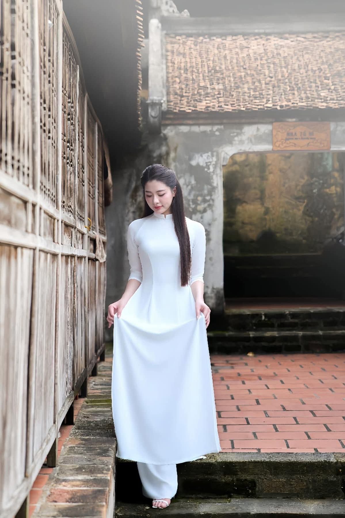 This captivating image showcases the ethereal beauty of a young Vietnamese woman gracefully adorned in a pristine white Ao Dai, complemented by a traditional conical hat (nón lá). Her long, dark hair and gentle expression highlight a serene Asian aesthetic. Holding a bouquet of delicate white lilies, she embodies purity and elegance. The Ao Dai, a quintessential symbol of Vietnamese culture, accentuates her slender figure and timeless charm. This portrait not only captures her striking physical appearance but also evokes the spirit and cultural heritage of Vietnam. It's a profound representation of traditional Vietnamese beauty, offering a glimpse into the nation's rich identity and the enduring grace of its women.Elegant Vietnamese Woman in Traditional White Ao Dai, Gracing an Ancient Pathway | 1000017528