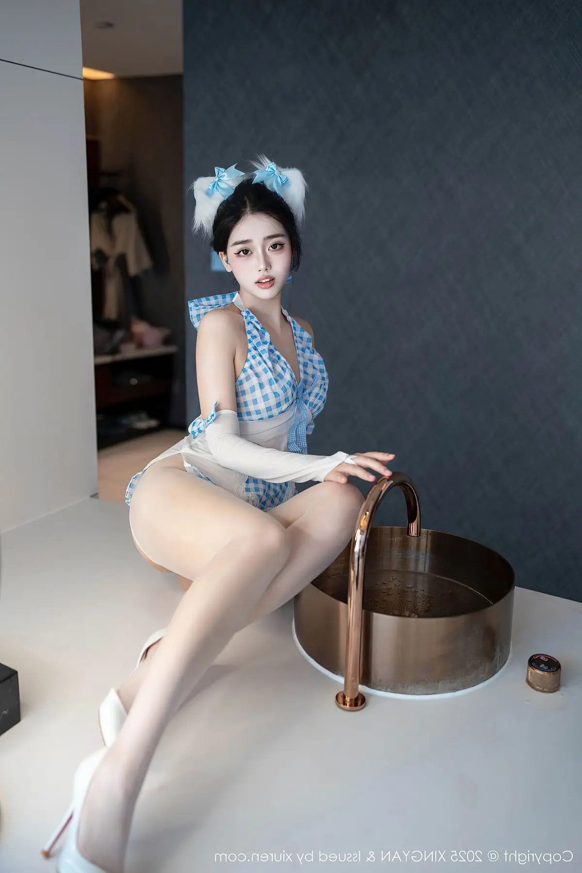 This captivating image features Ruan Fu Fu from XingYan Vol399 exuding a sweet and alluring charm The model is elegantly dressed in a stylized blue and white maid outfit blending playfulness with subtle sensuality Every contour of her figure is gracefully highlighted from her slender long legs to her inviting captivating gaze Her elegant pose beside a bronze sink creates a unique artistic scene Ruan Fu Fu a rising star embodies freshness and style delivering fashion-forward and emotionally rich photographs This collection is sure to mesmerize viewers reaffirming the irresistible appeal of this beautiful model and her distinctive presence in the world of fashion photography#RuanFuFu #XingYan #AsianModel #MaidOutfit #CaptivatingBeauty #FashionPhotography