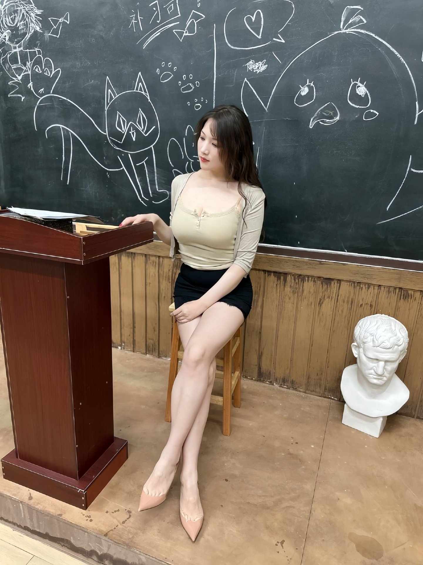 This captivating image features Keke Xiyyy, a charming private teacher, in a classic classroom setting. She exudes confidence and elegance, dressed in a modern ensemble: a soft beige top paired with a stylish black lace-trimmed mini skirt. Holding a ruler, with a blackboard adorned with playful chalk drawings behind her, she creates a unique educational atmosphere. Her feminine and alluring presence perfectly blends professional demeanor with a striking personal style. More than just a static moment, this picture symbolizes the confidence and appeal of a contemporary woman, especially in her role as a private instructor, making it an ideal depiction of modern teaching aesthetics.Innocent Female Student in School Uniform, Youthful Beauty on Tree-Lined Path