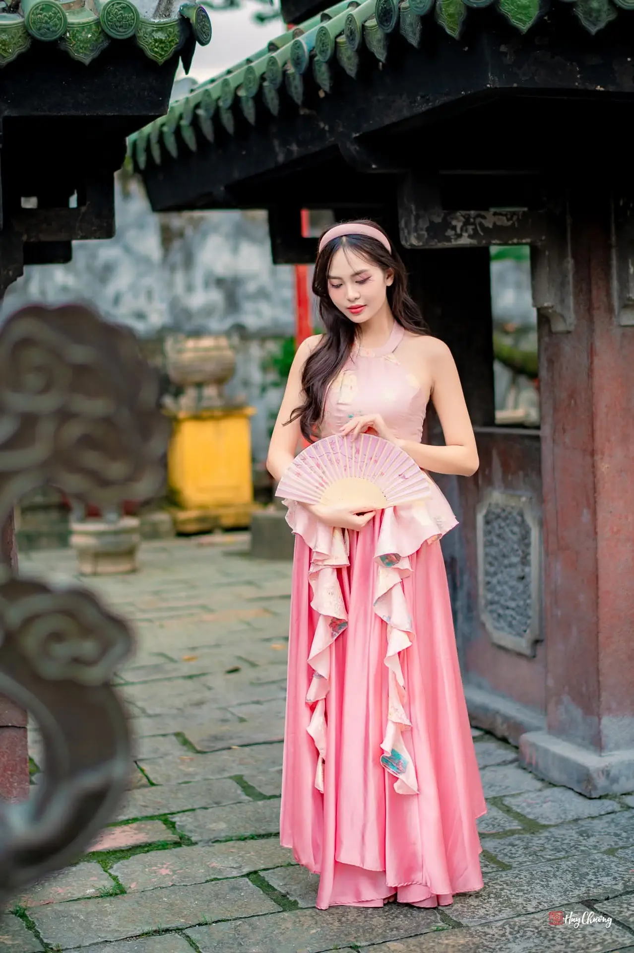 This captivating photograph features a graceful young woman adorned in a delicate pastel pink dress exuding an air of gentle beauty and elegance. Her attire with its intricate ruffles and flowing lines not only accentuates her slender figure but also adds a touch of fluidity to her pose. The backdrop showcases stunning ancient architecture characterized by vibrant red doors and traditional motifs evoking the rich cultural essence of an East Asian setting perhaps Hoi An Ancient Town or a historic temple. The harmonious blend of the womans contemporary elegance and the timeless beauty of the surroundings creates a vibrant and enchanting visual narrative. Holding a delicate fan her gaze is thoughtful as if sharing a story that bridges the past and the present. This image perfectly encapsulates sophistication charm and a deep appreciation for cultural heritage.#VietnameseBeauty #PinkDress #AncientArchitecture #CulturalHeritage #ElegantStyle
