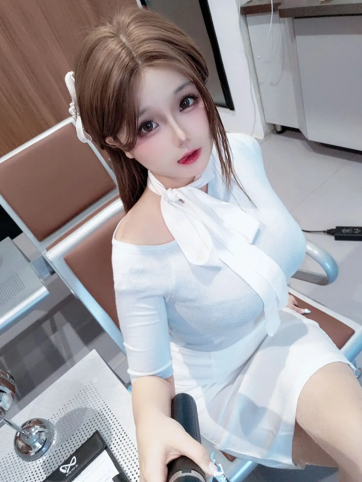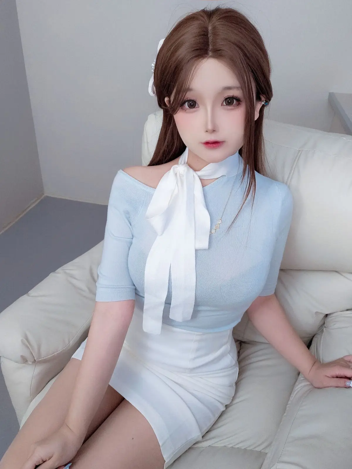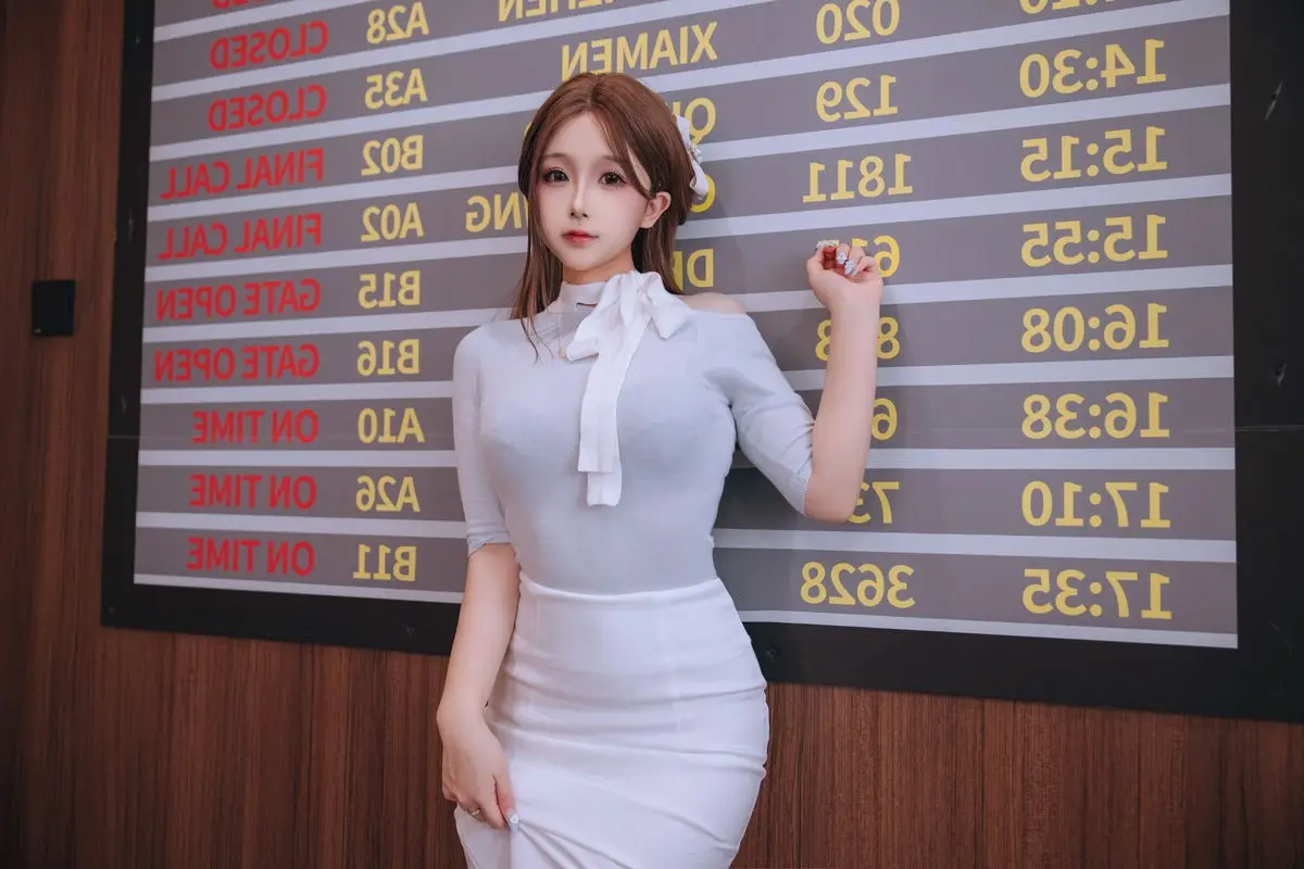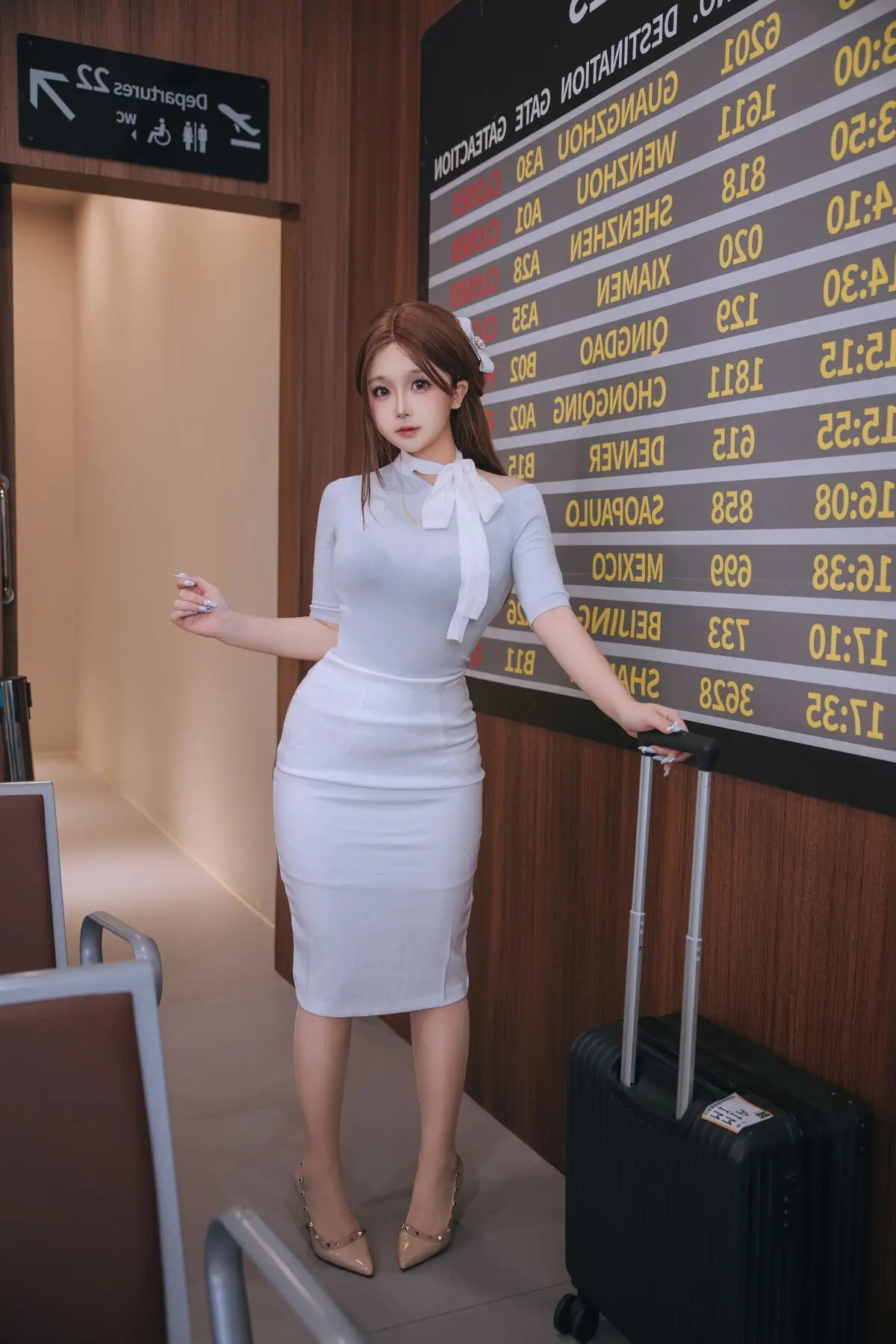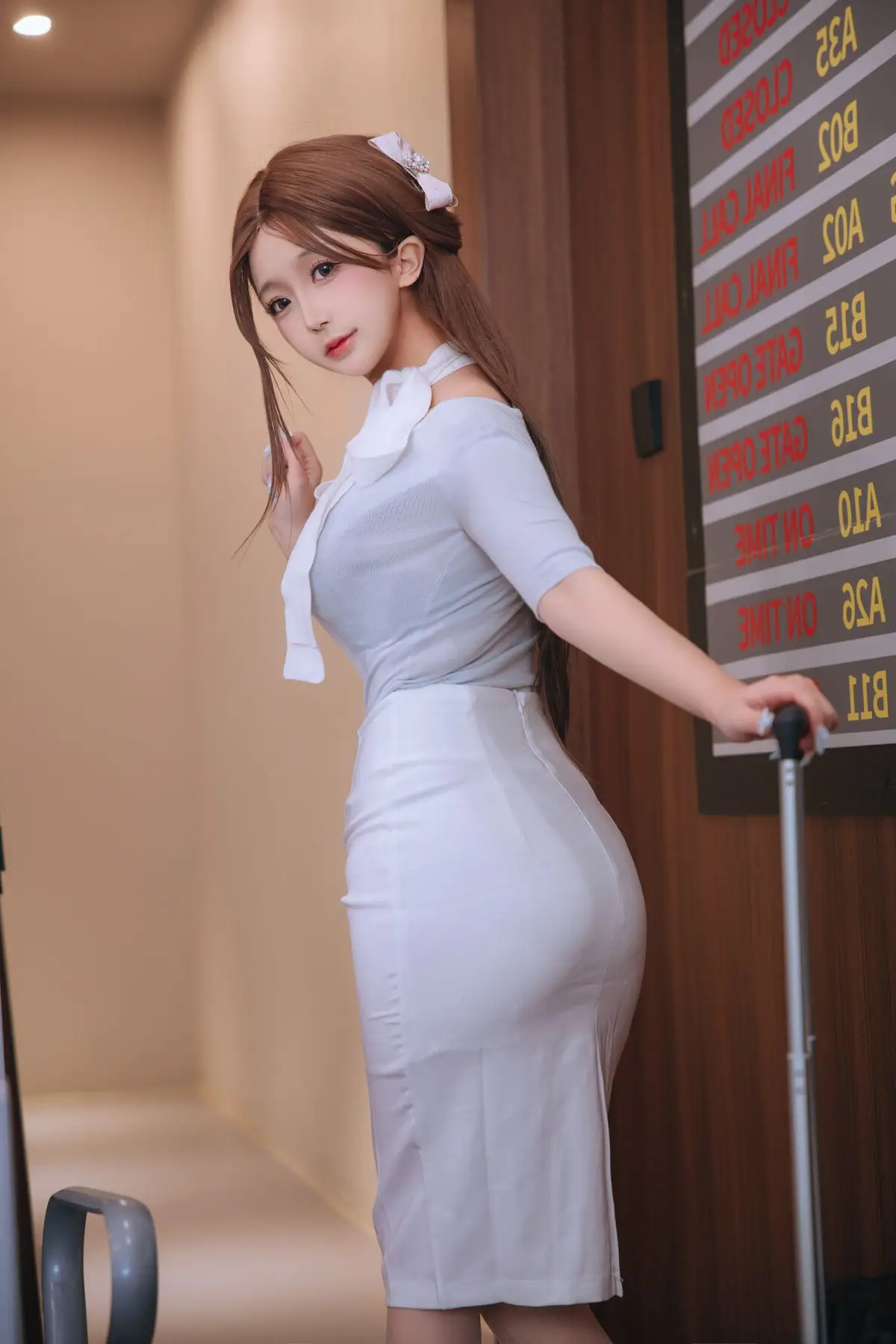 In the 'International Flight' Part02 collection, coser Ri Nai Jiao shines with elegant and alluring beauty. She poses gracefully in a light, sophisticated outfit consisting of a bright top and a short white skirt, paired with high heels that accentuate her long, slender legs. Her charming pose, leaning slightly over a white sofa, with her gaze directly at the camera, is utterly captivating. The image evokes the luxurious, modern essence of a flight attendant or a stylish traveler in a cozy resting space. This photo set not only displays exquisite aesthetics but also captures Ri Nai Jiao's alluring and confident demeanor, inviting viewers to explore more memorable moments.#CoserRiNaiJiao #InternationalFlight #TravelFashion #AsianBeauty #ElegantStyle #OL #OfficeLady #Secretary