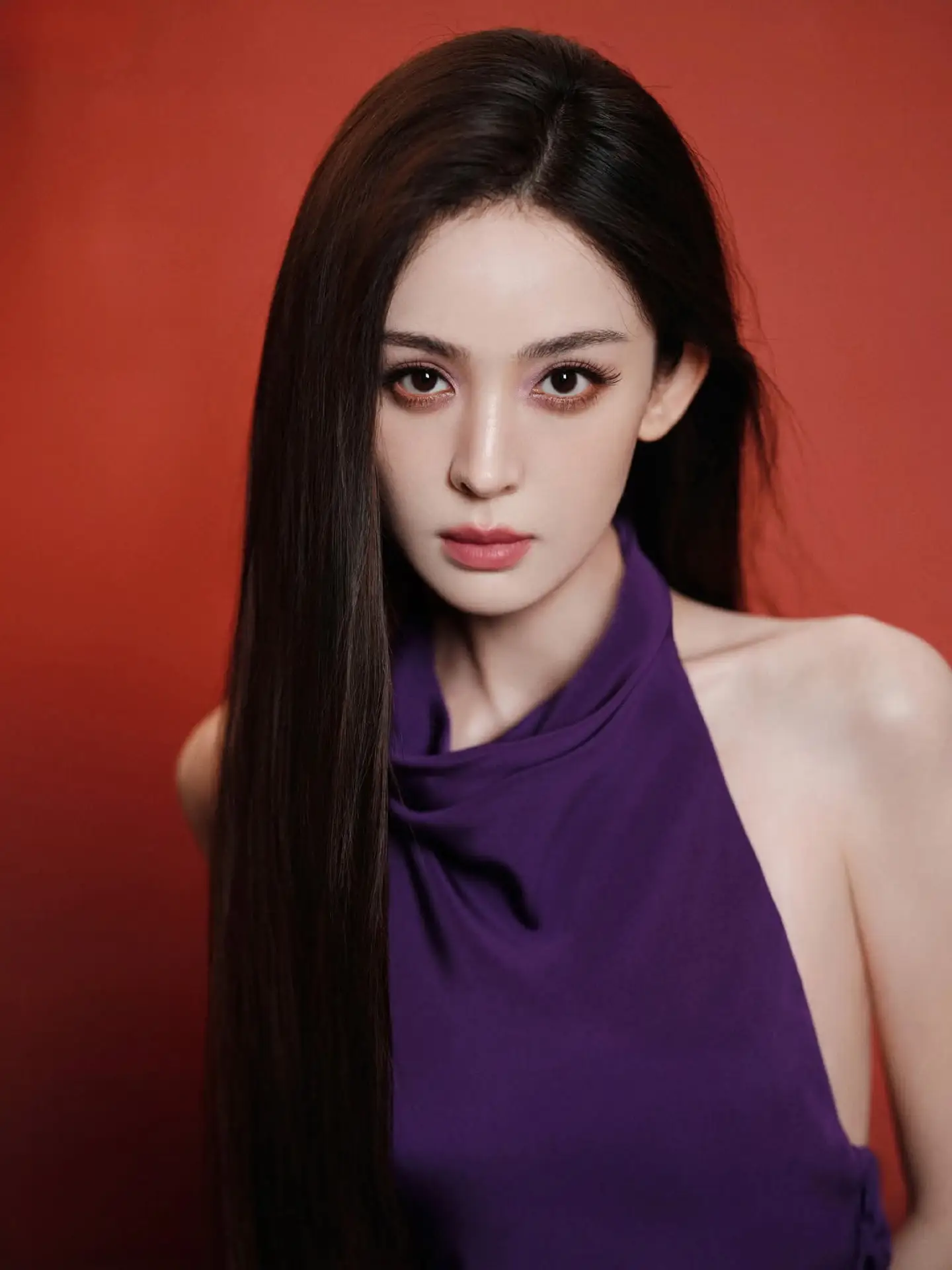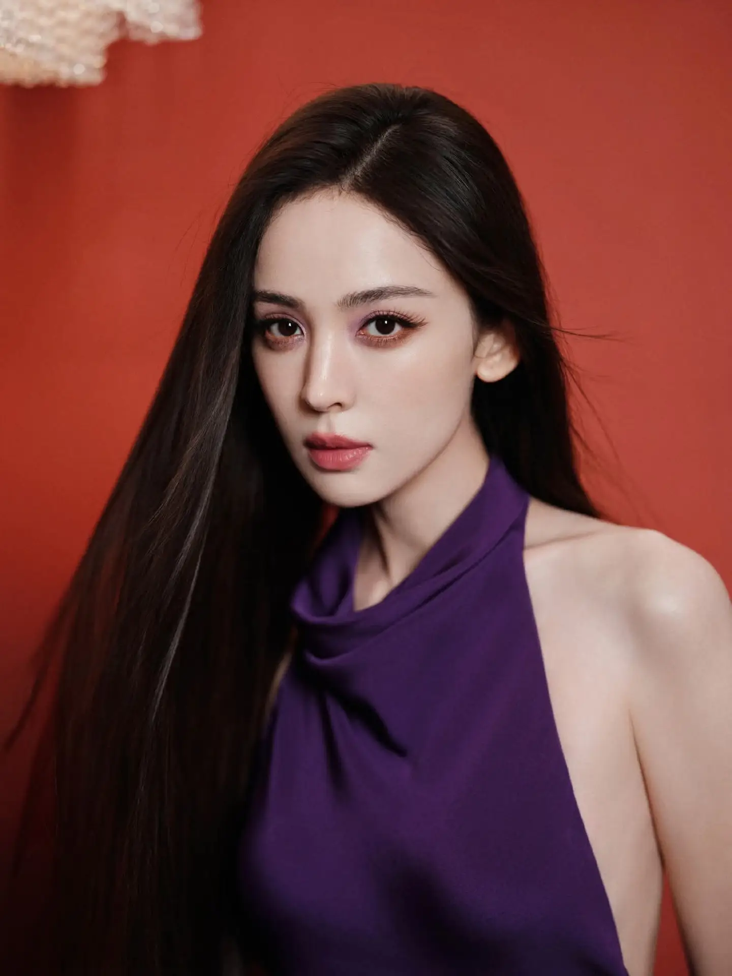 This image beautifully captures the elegant and alluring charm of a woman adorned in a sophisticated purple halter-neck dress. The form-fitting gown gracefully accentuates her slender figure and delicate curves creating a captivating fashion statement. The regal purple hue of the dress not only signifies luxury but also imbues a touch of mystery and unique allure. Its clever halter-neck and open-back design subtly reveal her graceful shoulders and bare back embodying confidence and a strong sense of individuality. Simple yet refined gold high-heeled sandals complete the ensemble adding to her graceful and refined appearance. The contrasting red background further highlights the vibrant color of the dress resulting in a striking and mesmerizing visual. This picture perfectly represents modern chic and distinctive fashion.#PurpleDress #WomensFashion #EveningGown #ElegantStyle #ModernBeauty