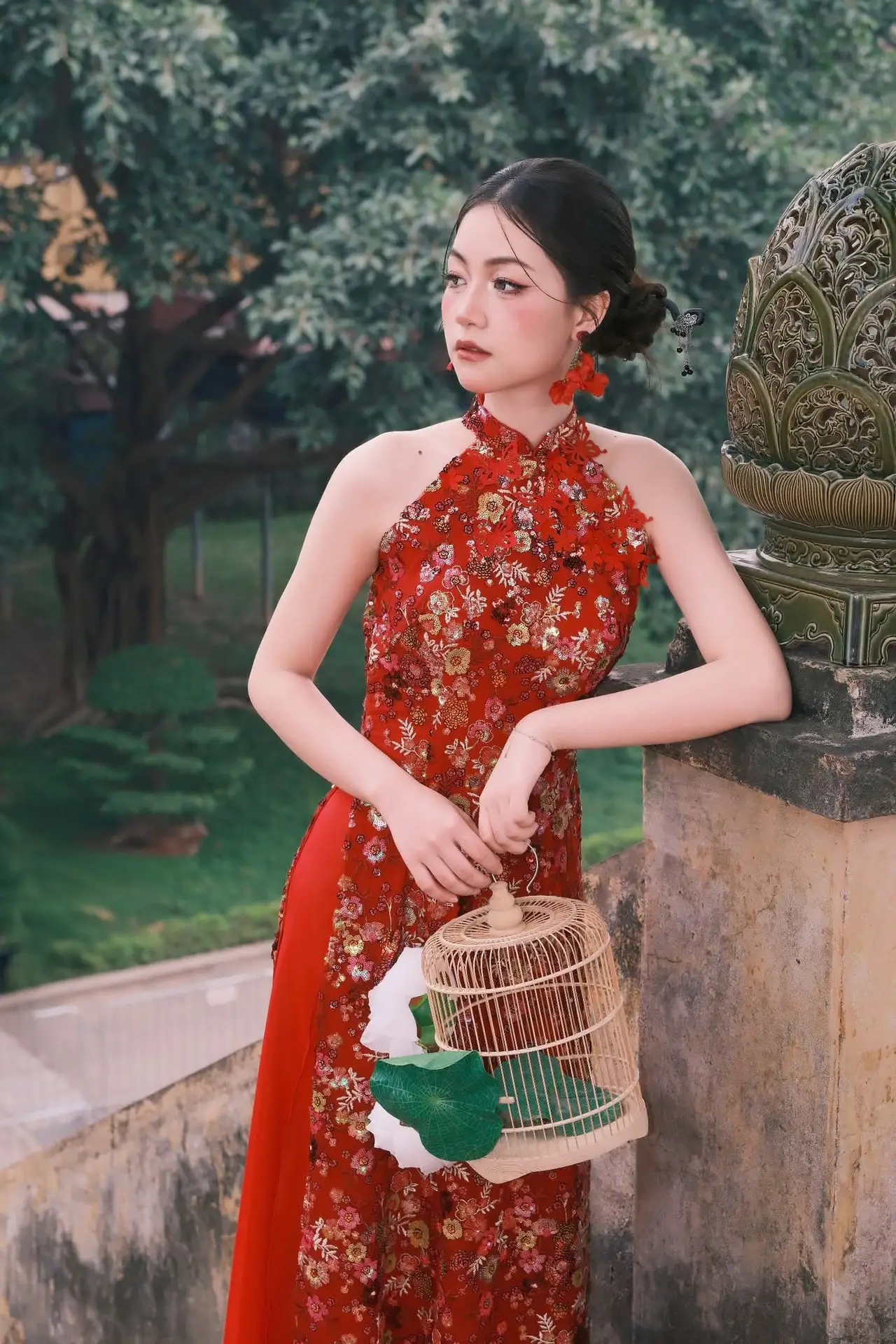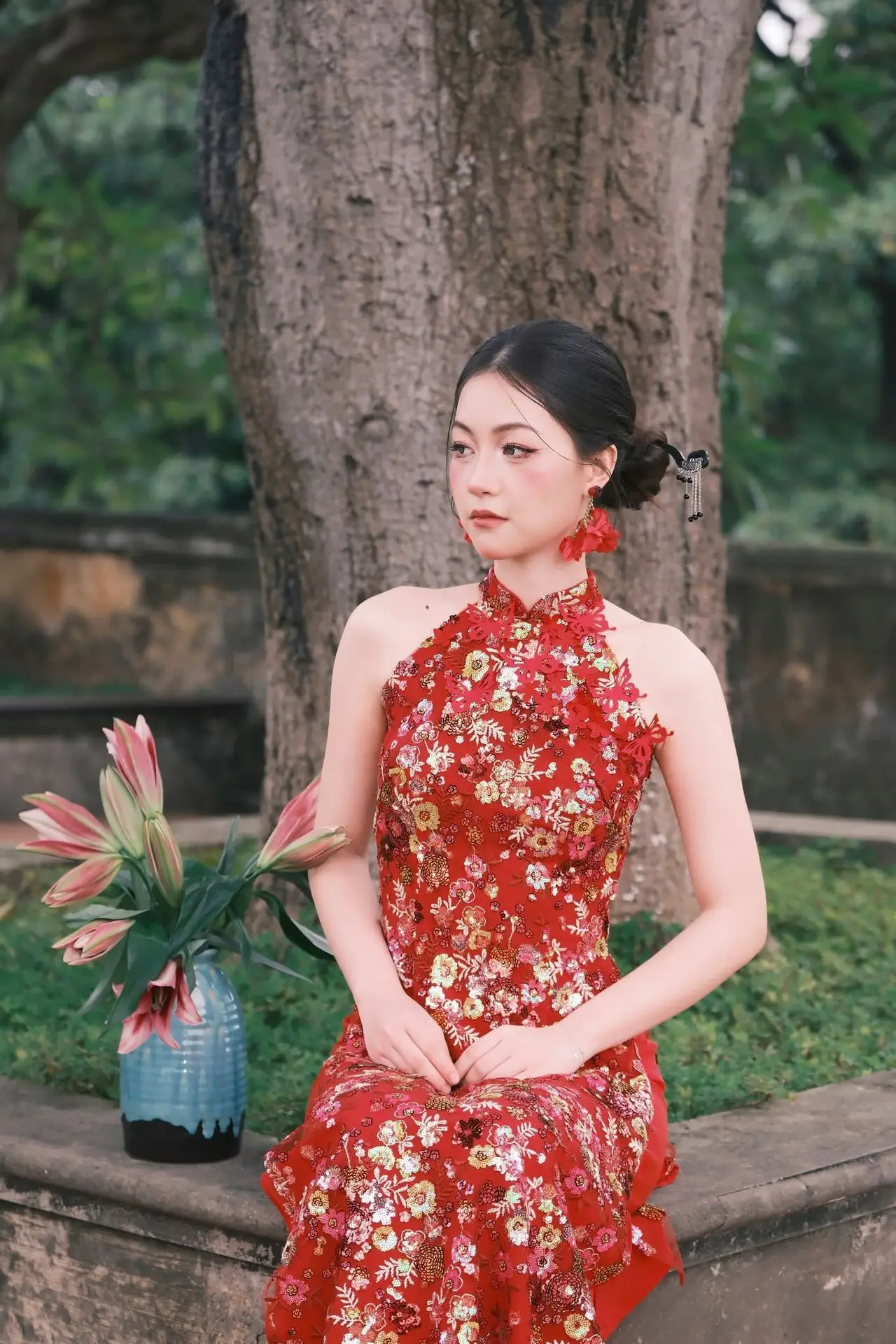 This captivating image beautifully portrays an Asian woman exuding elegant and gentle beauty. She wears a vibrant red floral dress with a refined halter-neck design, which not only accentuates her slender figure but also highlights her unique grace. The passionate red hue of her attire, combined with fresh floral patterns, creates a captivating ensemble that is both classic and modern. Seated serenely by a majestic ancient tree amidst lush green surroundings, she emanates a tranquil and noble aura. Her contemplative gaze and gentle demeanor further emphasize a timeless beauty, a perfect harmony between human elegance and natural scenery, evoking feelings of serenity and subtle charm.#RedFloralDress #AsianBeauty #VietnameseFashion #ElegantStyle #OutdoorPortrait