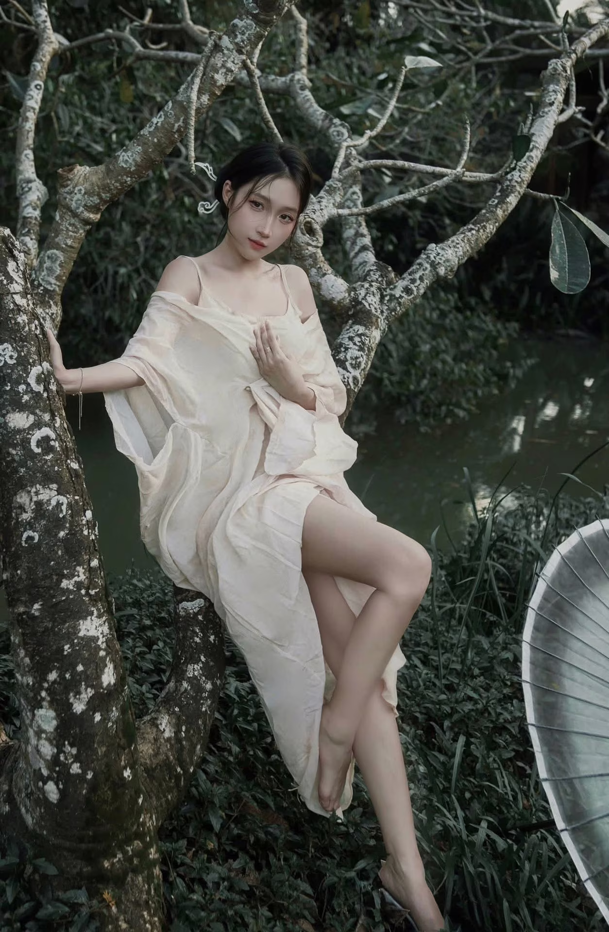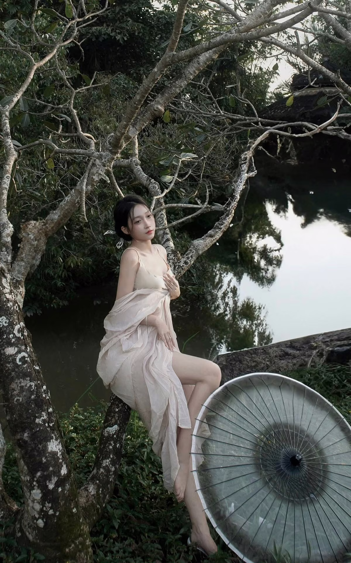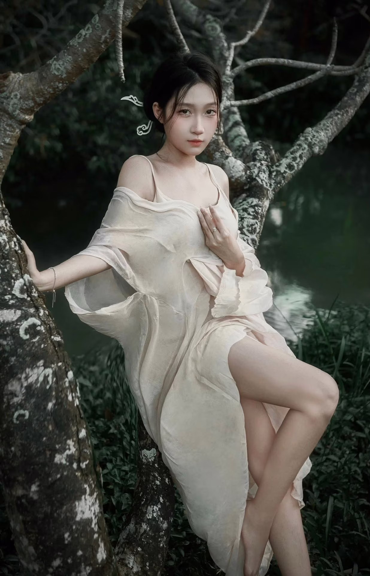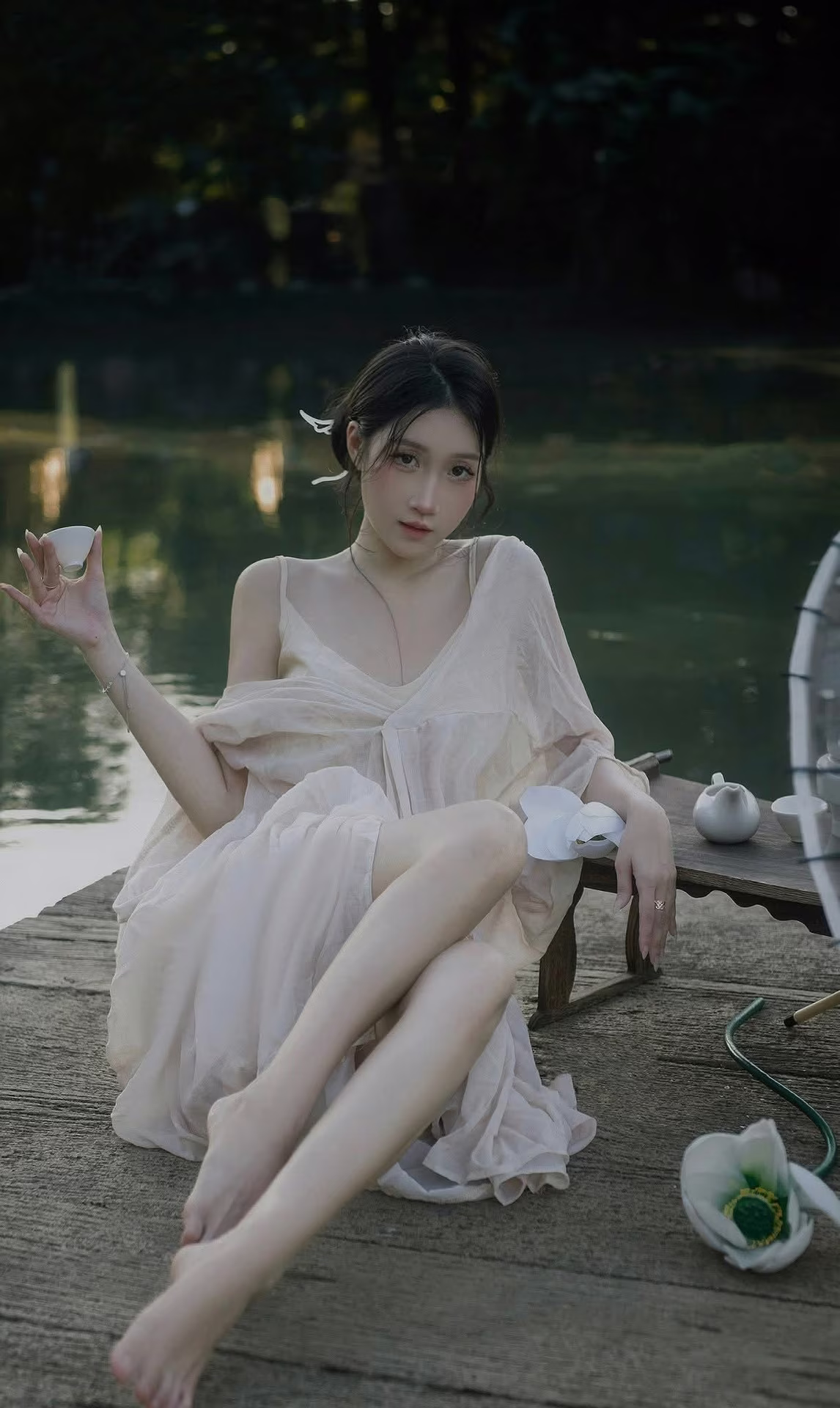 The XVG No.35 image captures an enchanting East Asian muse, embodying delicate beauty and grace, akin to a living work of art. She sits thoughtfully by tranquil waters, adorned in a flowing, ethereal gown that highlights her elegance. Her gentle, downward gaze conveys a sense of introspection and quiet emotion, creating a moment of profound serenity. A delicate white and yellow lotus flower rests beside her, enhancing the pure aesthetic and harmonizing with the peaceful natural setting. This photograph transcends mere imagery; it is an artistic masterpiece, evoking timeless tranquility and exquisite beauty.XVG No.31: The Grace of White Ao Dai: Captivating Traditional Vietnamese Beauty