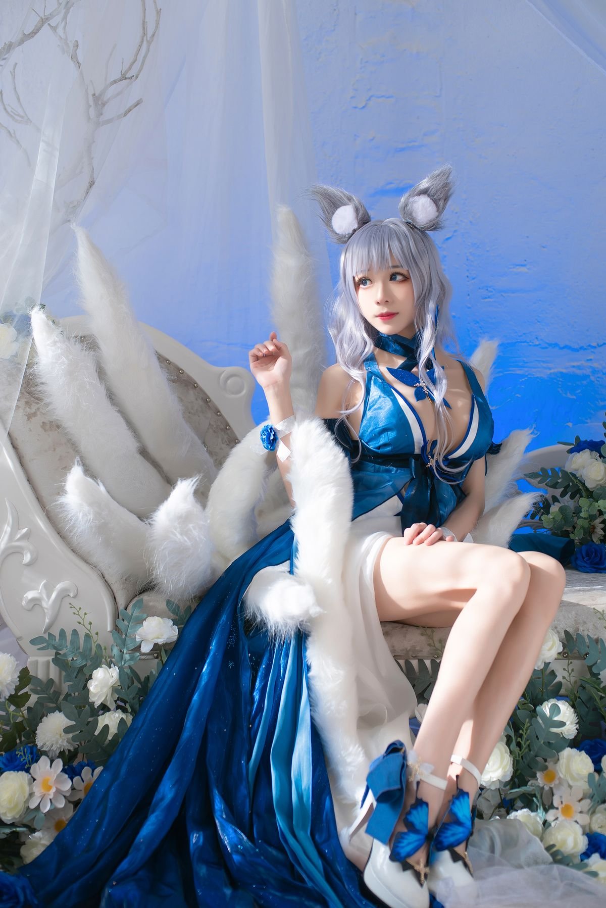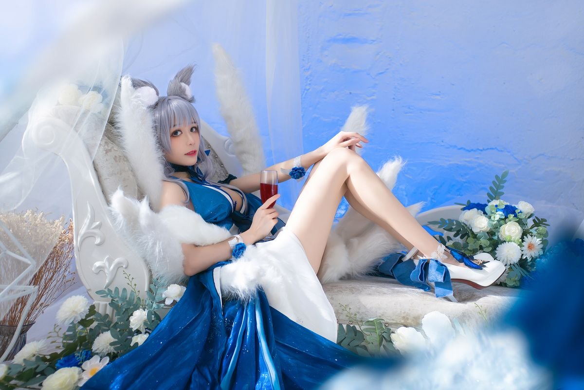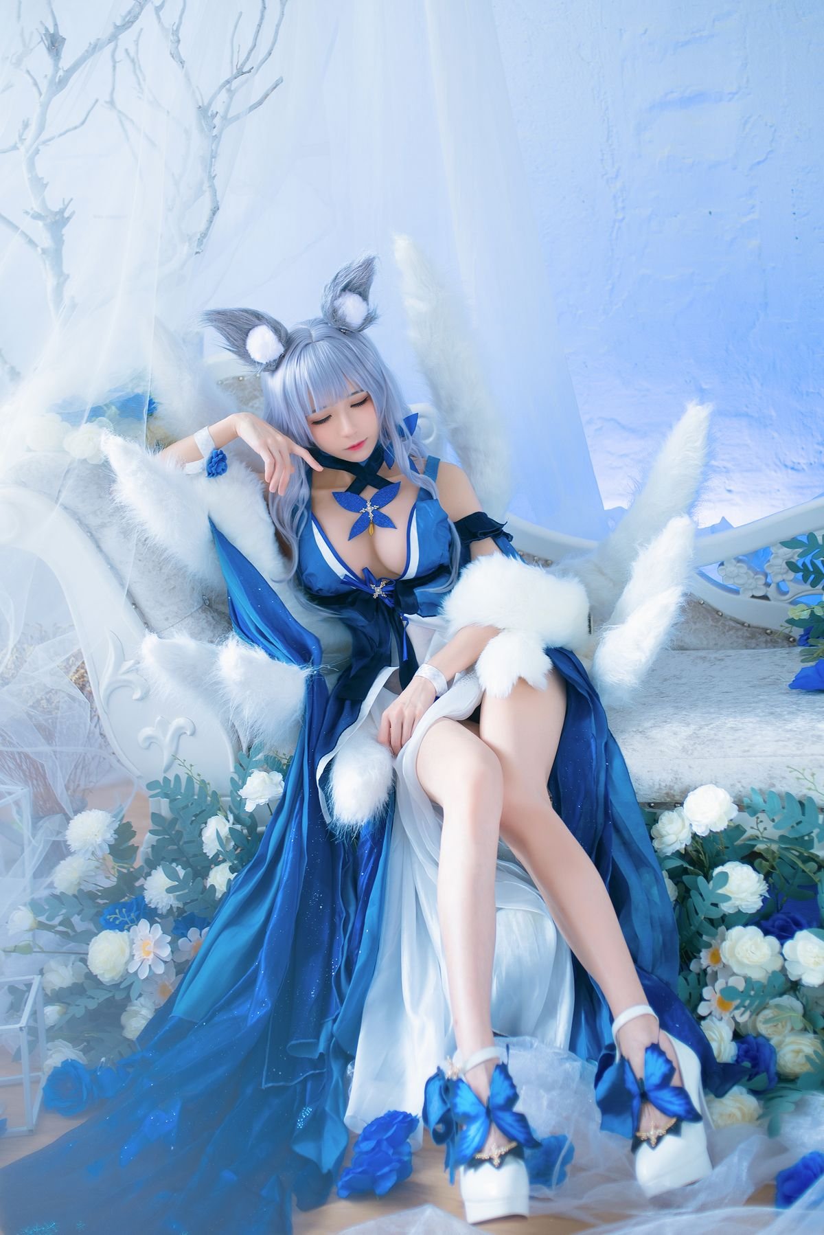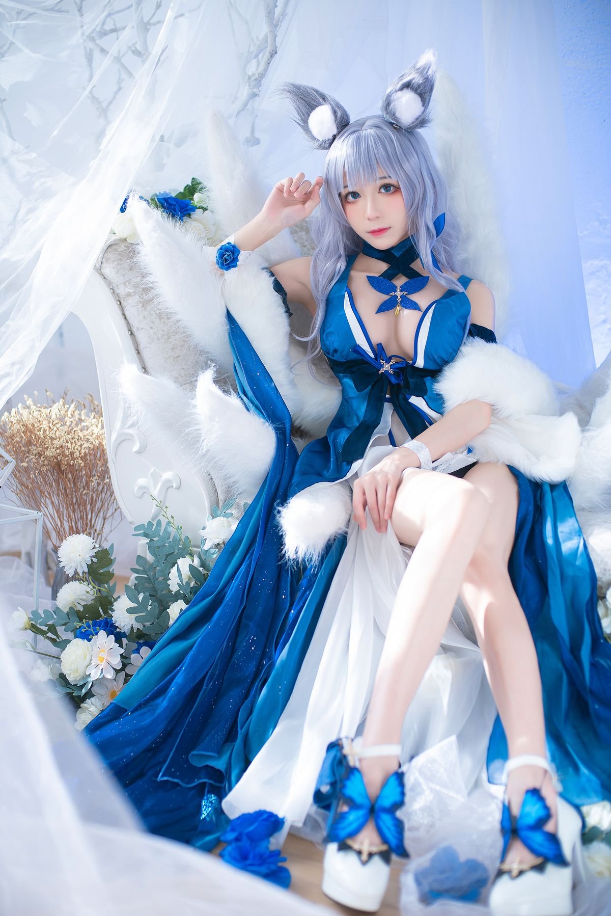 Immerse yourself in the enchanting world of Azur Lane with Coser Tomoyo mesmerizing Shinano dress cosplay This image celebrates the exquisite beauty and allure of Shinano showcasing her in a magnificent blue gown with soft fur details Tomoyo masterfully embodies the serene and graceful essence of the shipgirl delivering an authentic and vibrant cosplay experience From her shimmering silver hair to the adorable fox ears and the delicate butterfly wings on her shoes every detail is meticulously crafted creating a harmonious and striking overall look The dreamy setting with its cool blue and white tones further enhances Shinano ethereal charm This is undoubtedly an artistic cosplay masterpiece captivating all eyes and hearts of fans