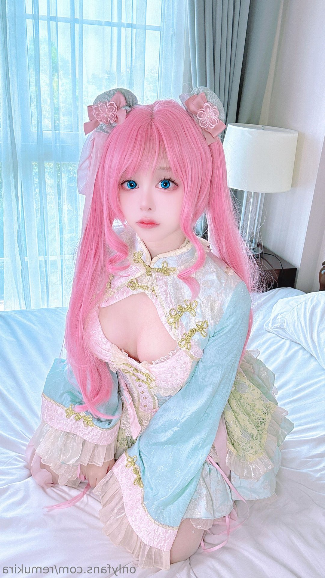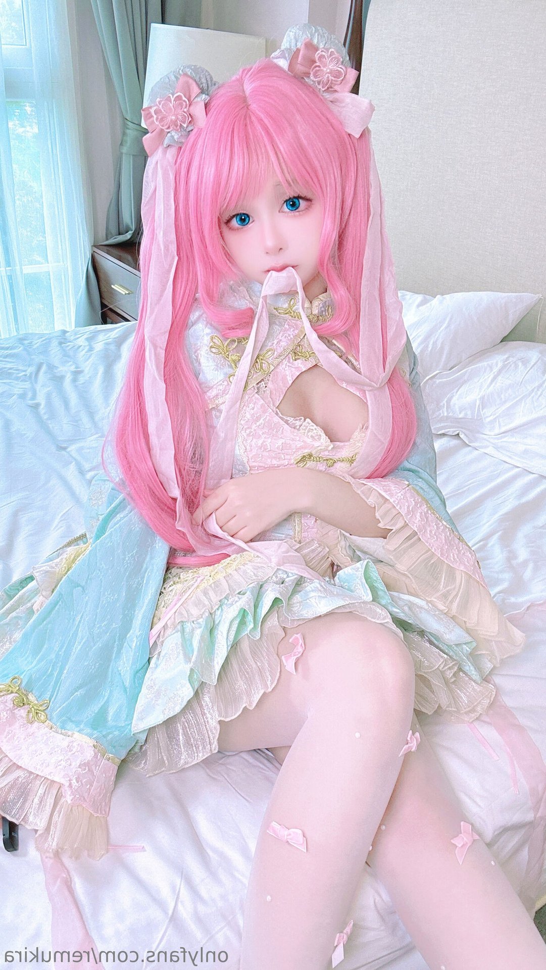 This stunning image features Coser Remukira in a captivating cosplay transformation. With her flowing pink hair and large, expressive blue eyes, Remukira exudes a charming and adorable allure. She is adorned in an exquisite pastel-colored outfit, a blend of classic elegance and modern fantasy, where every lace and ruffle detail is meticulously crafted, creating an impressive and cohesive look. Her graceful pose on the bed, bathed in soft, ambient light, further enhances her ethereal beauty. This cosplay masterpiece showcases Remukira's artistic talent and creativity as an OnlyFans creator, promising fans unique and unforgettable visual experiences that highlight her dedication to the art of cosplay.