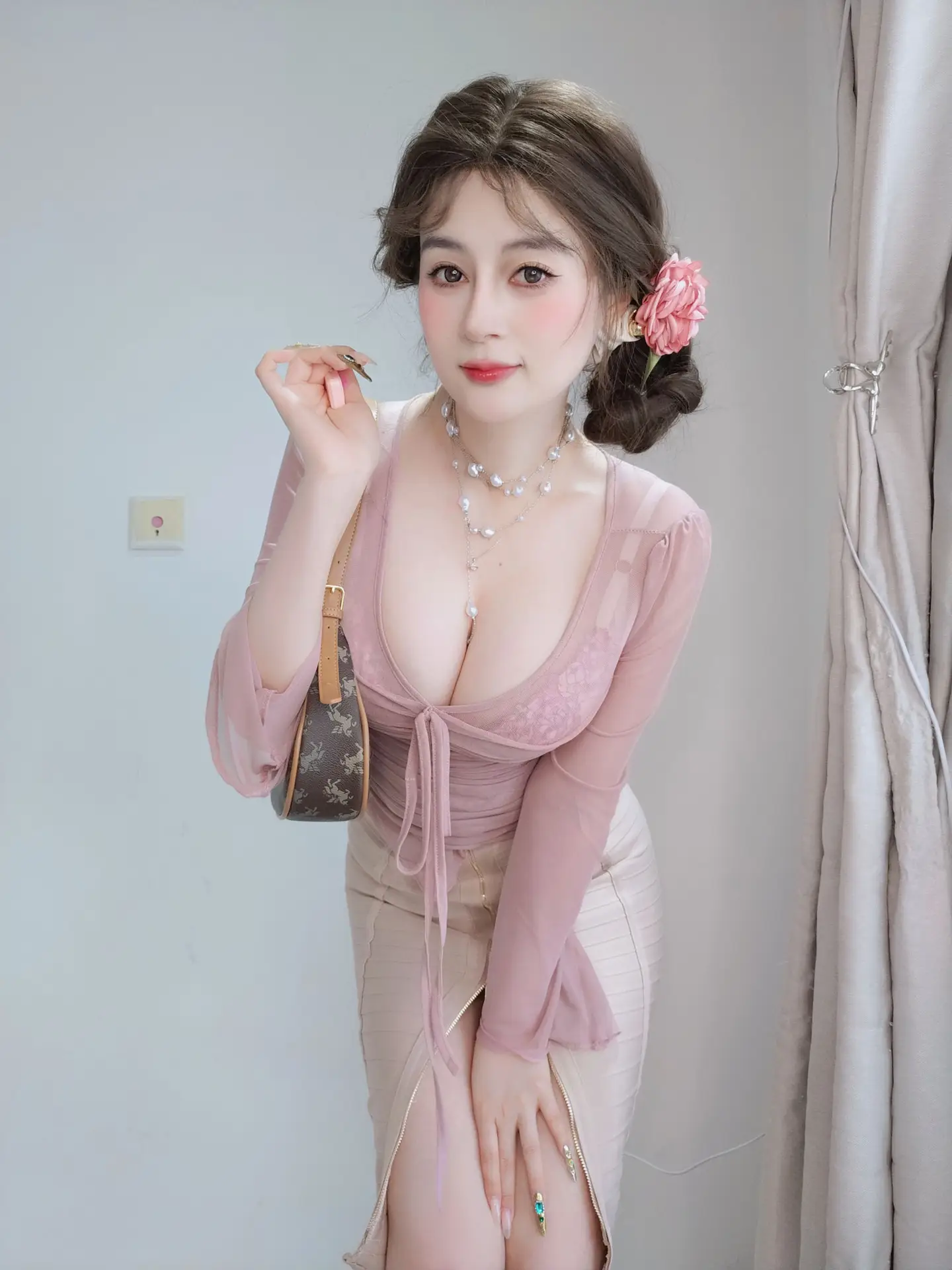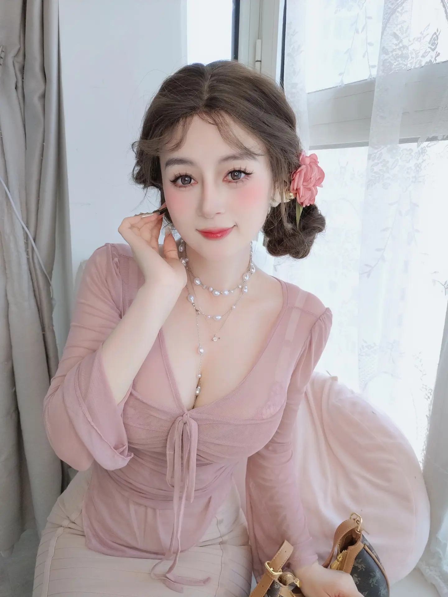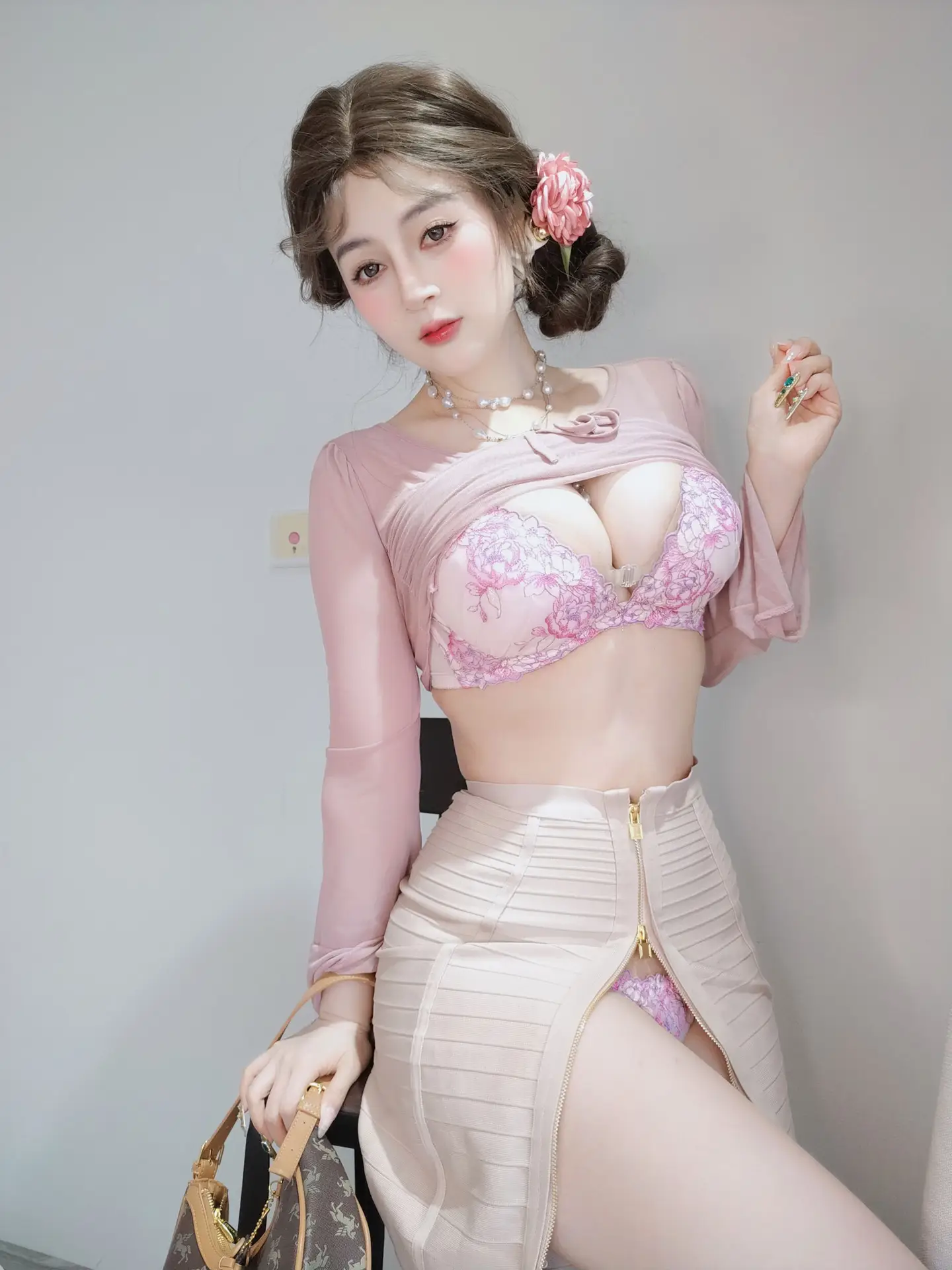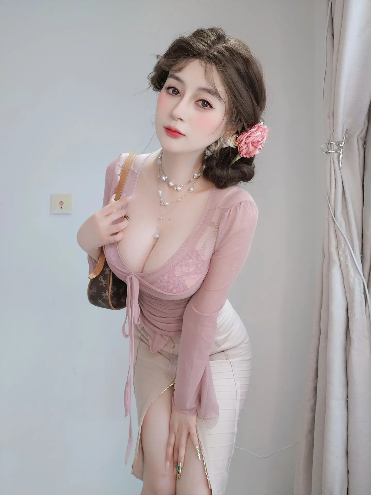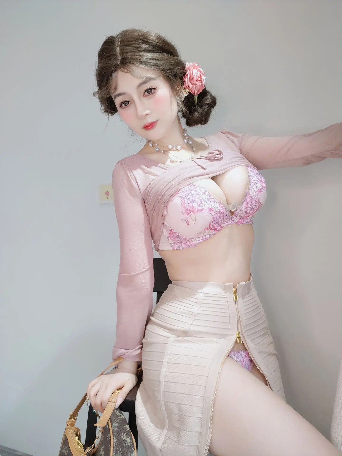 This stunning image captures a feminine coser exuding irresistible charm and gentle grace. She wears a soft, sheer pink top that beautifully accentuates her balanced figure and delicate curves. The pastel pink hue, combined with the lightweight fabric, creates an elegant and ethereal style. Her hair is neatly styled, adorned with a small pink flower, further enhancing her graceful appearance. With a confident and captivating aura, holding a designer handbag, the girl creates an incredibly attractive overall look that draws every eye. This is truly a sight to behold, showcasing a perfect blend of natural beauty and refined fashion sense.#Coser #FeminineBeauty #PinkStyle #ElegantFashion #CharmingLook