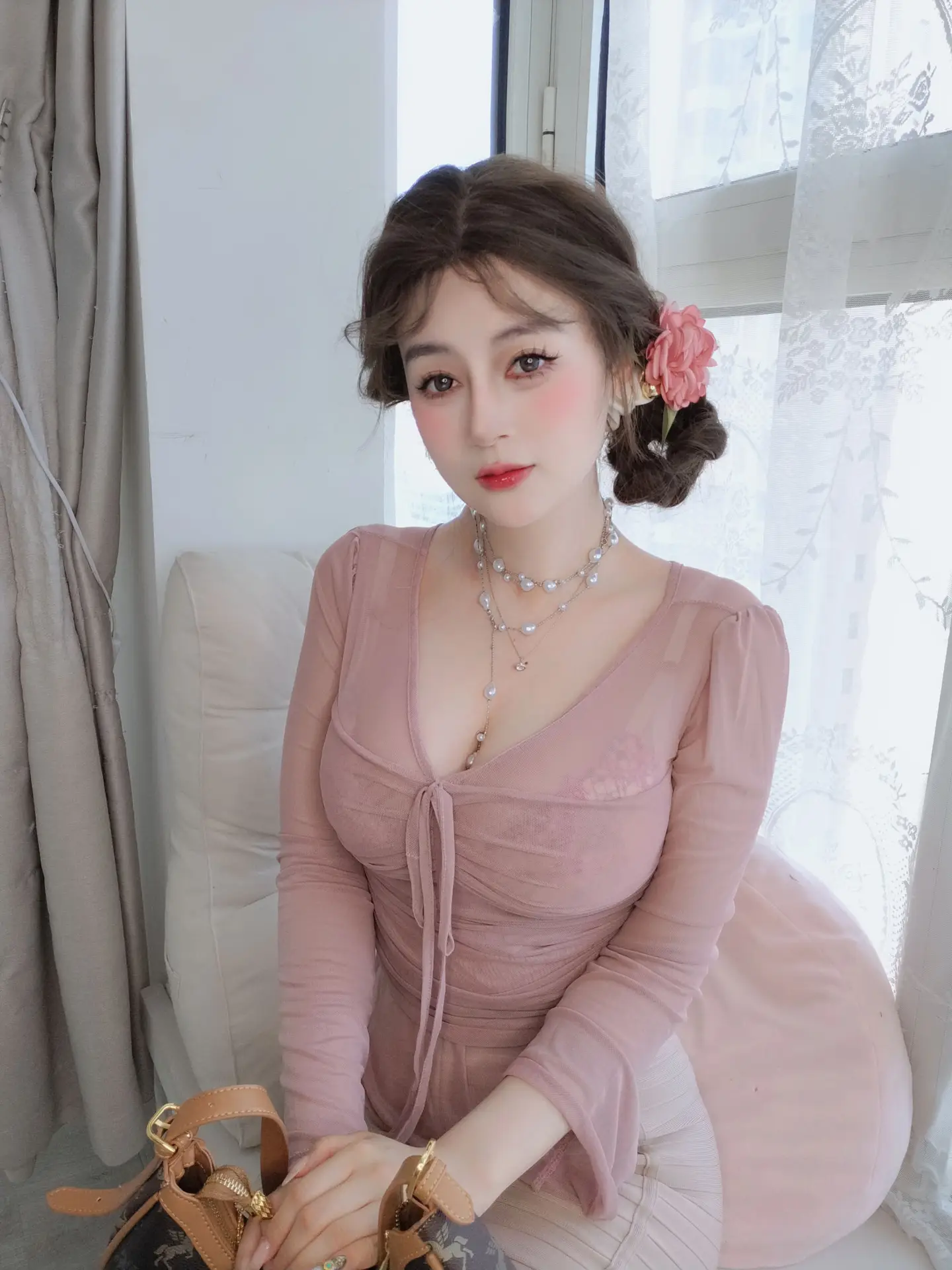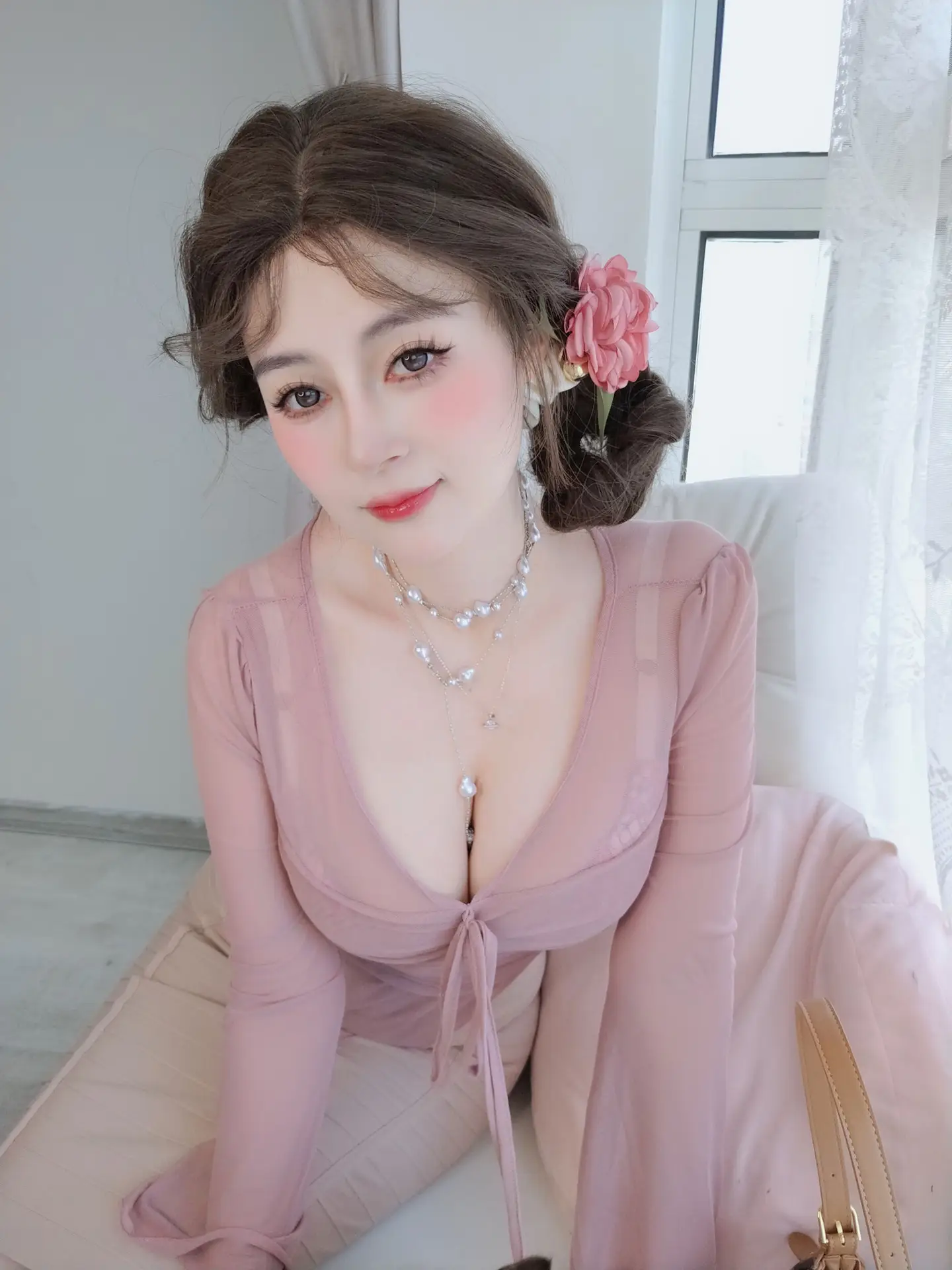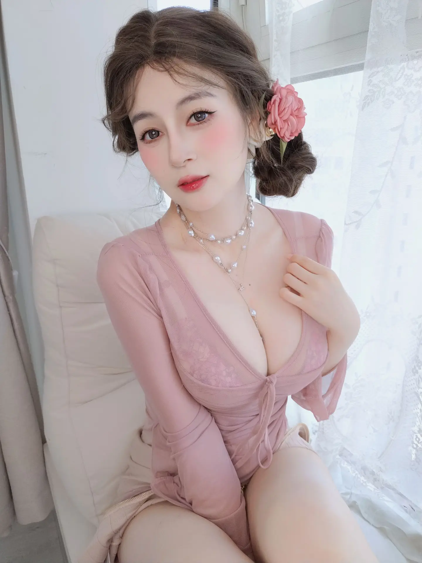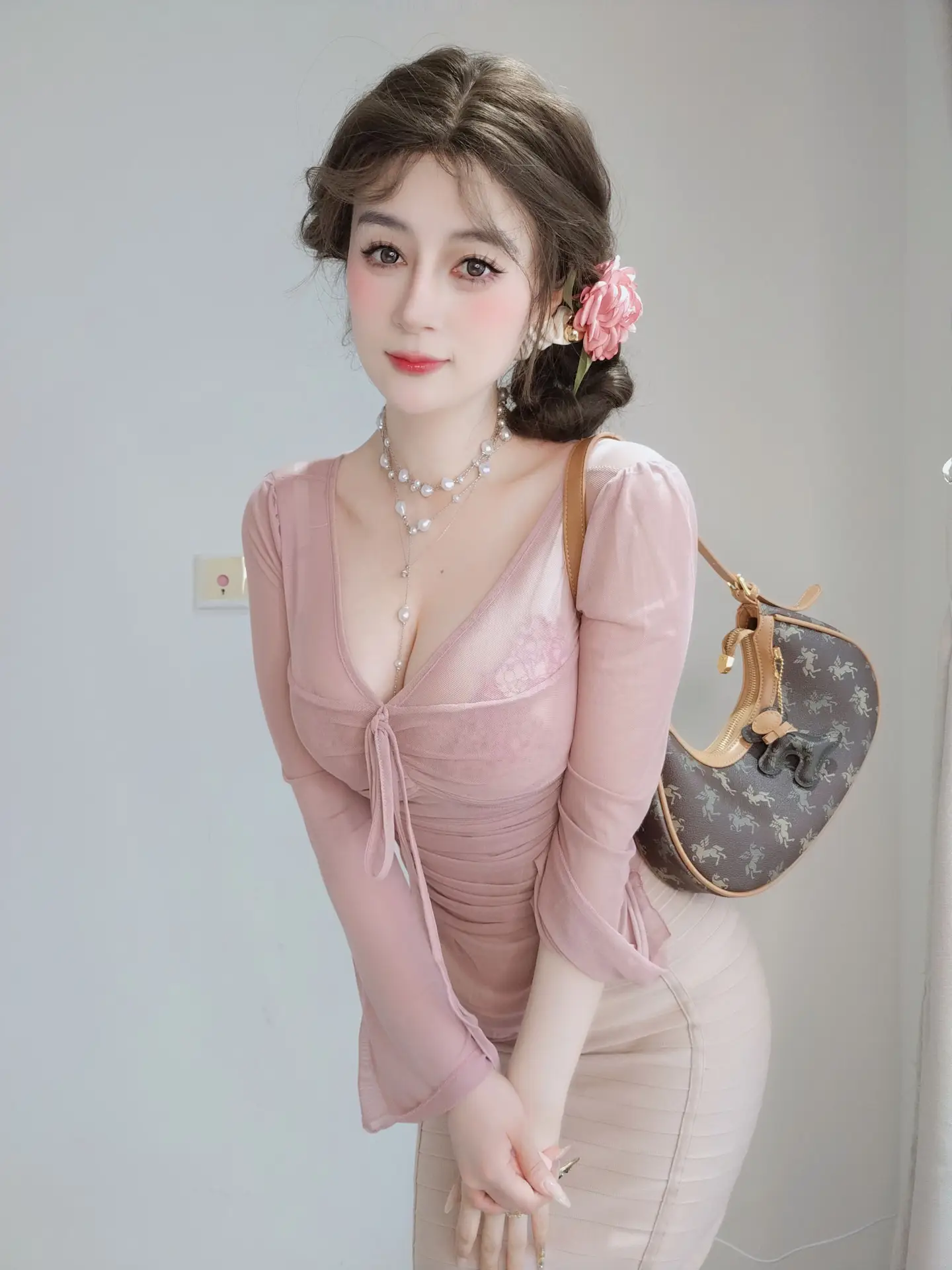 This stunning image captures a feminine coser exuding irresistible charm and gentle grace. She wears a soft, sheer pink top that beautifully accentuates her balanced figure and delicate curves. The pastel pink hue, combined with the lightweight fabric, creates an elegant and ethereal style. Her hair is neatly styled, adorned with a small pink flower, further enhancing her graceful appearance. With a confident and captivating aura, holding a designer handbag, the girl creates an incredibly attractive overall look that draws every eye. This is truly a sight to behold, showcasing a perfect blend of natural beauty and refined fashion sense.#Coser #FeminineBeauty #PinkStyle #ElegantFashion #CharmingLook