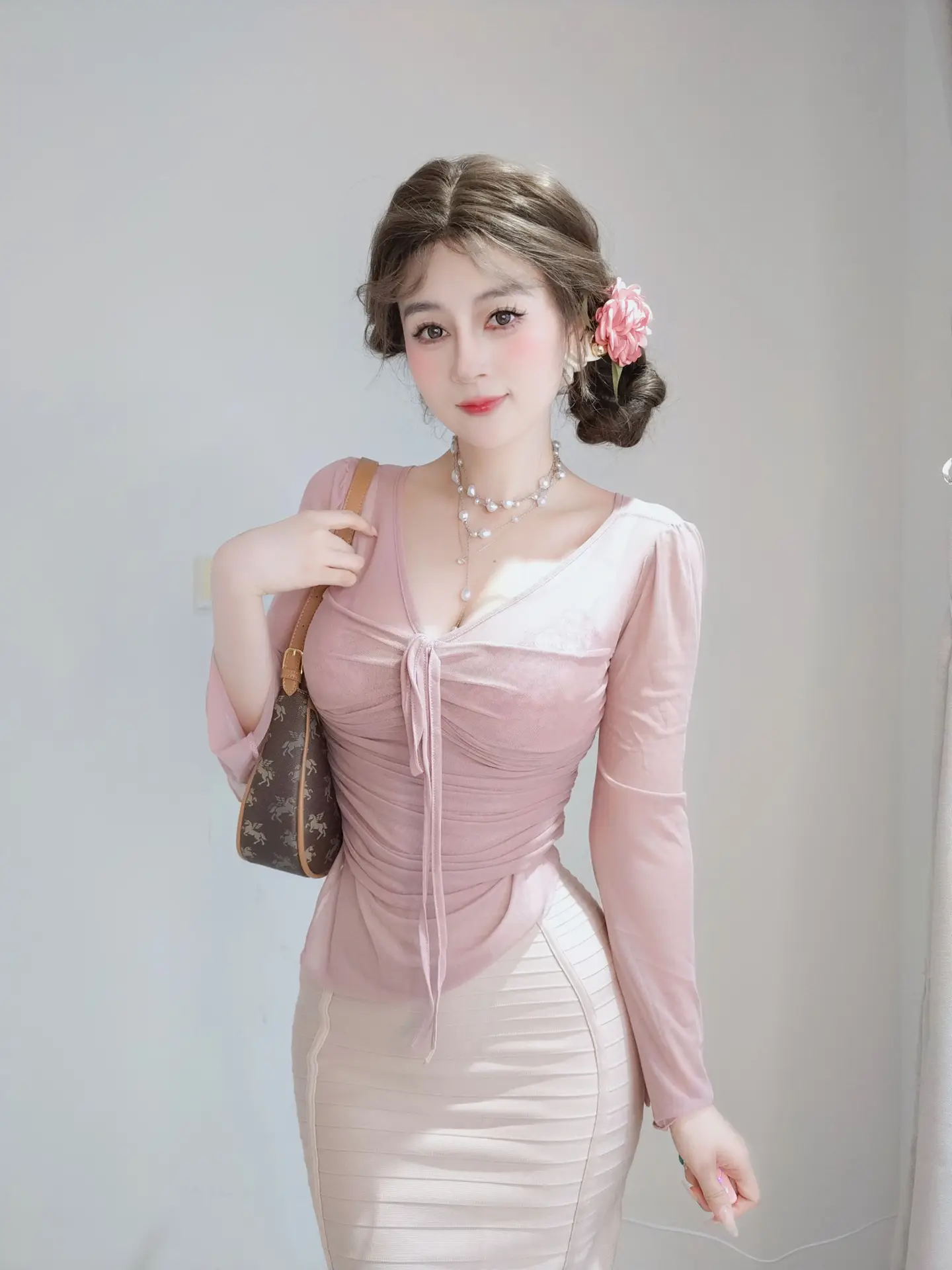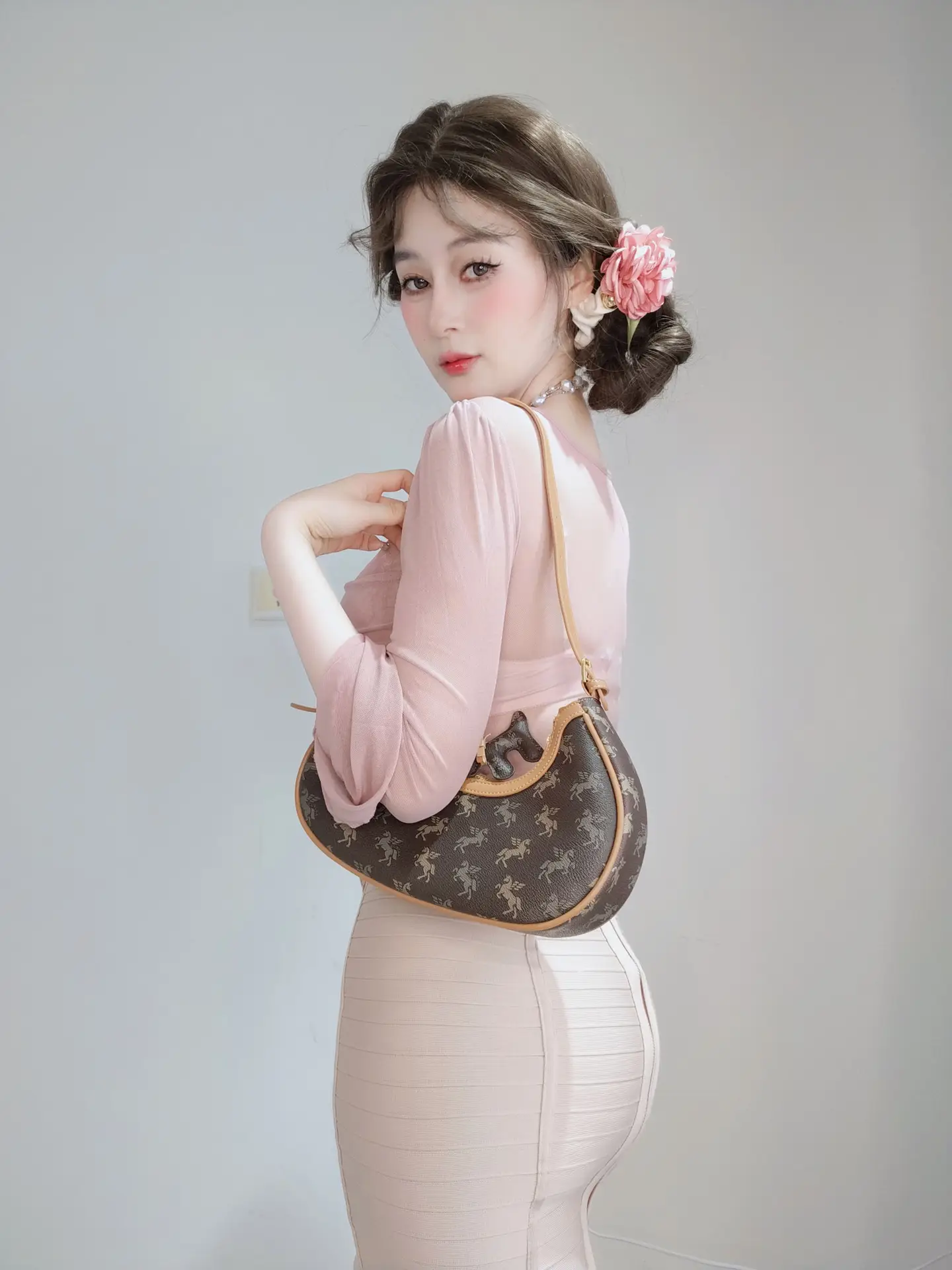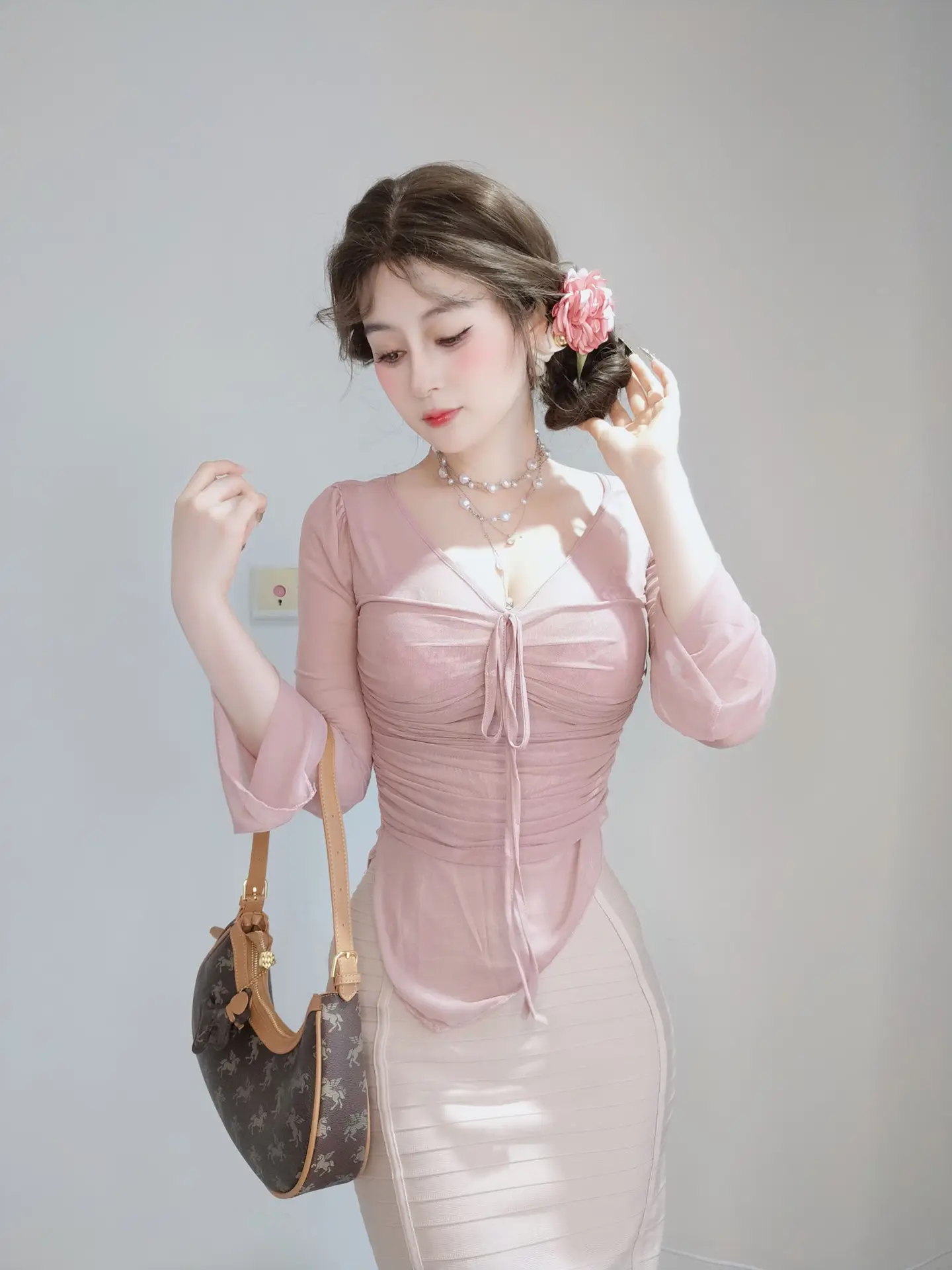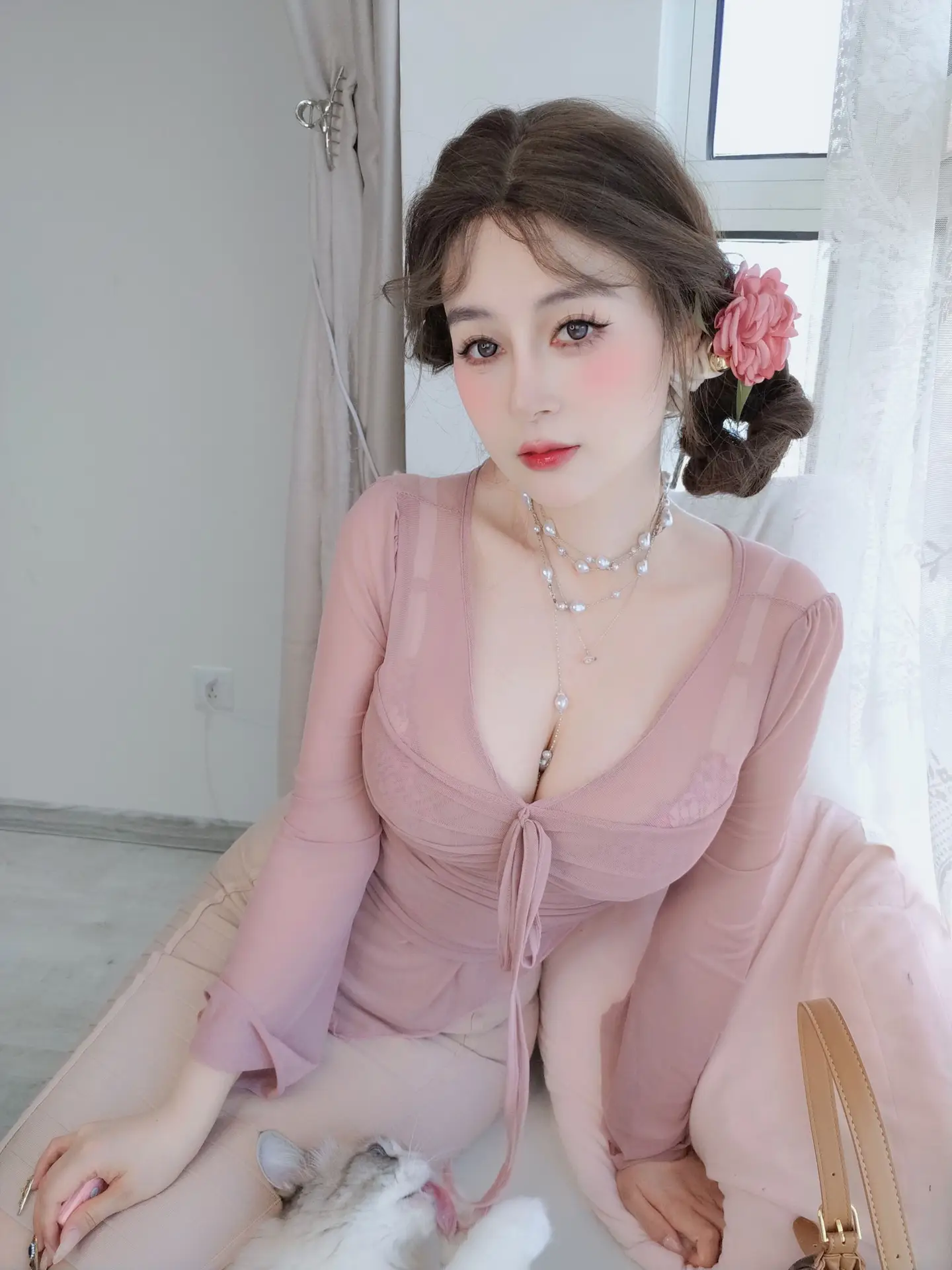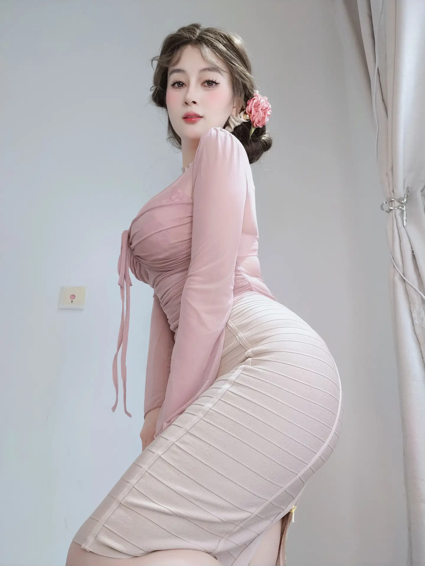 This stunning image captures a feminine coser exuding irresistible charm and gentle grace. She wears a soft, sheer pink top that beautifully accentuates her balanced figure and delicate curves. The pastel pink hue, combined with the lightweight fabric, creates an elegant and ethereal style. Her hair is neatly styled, adorned with a small pink flower, further enhancing her graceful appearance. With a confident and captivating aura, holding a designer handbag, the girl creates an incredibly attractive overall look that draws every eye. This is truly a sight to behold, showcasing a perfect blend of natural beauty and refined fashion sense.#Coser #FeminineBeauty #PinkStyle #ElegantFashion #CharmingLook