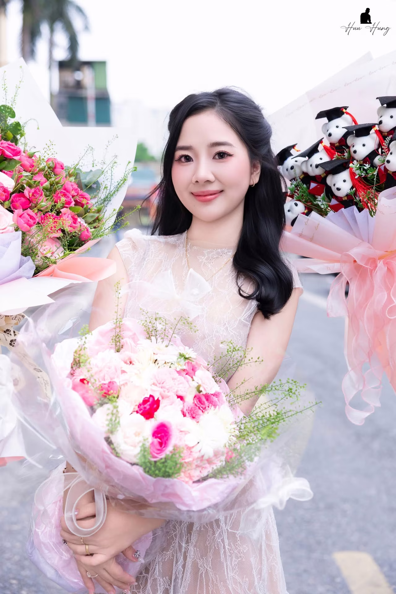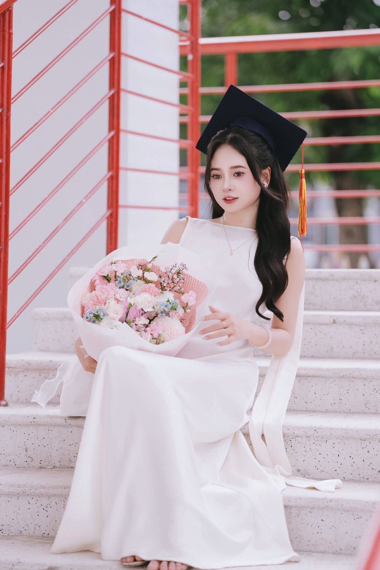 This photo captures a proud moment of a female student on her graduation day. Dressed in a dignified graduation gown and a cap symbolizing knowledge the young woman radiates beauty and immense joy. Her bright smile along with the vibrant pink rose bouquet beside her further highlights the happiness of completing her academic journey at Can Tho University. This is not only a significant milestone marking the end of one chapter but also the beginning of a wide-open future promising many new successes. This moment stands as a testament to the continuous effort and thirst for knowledge of the young generation.