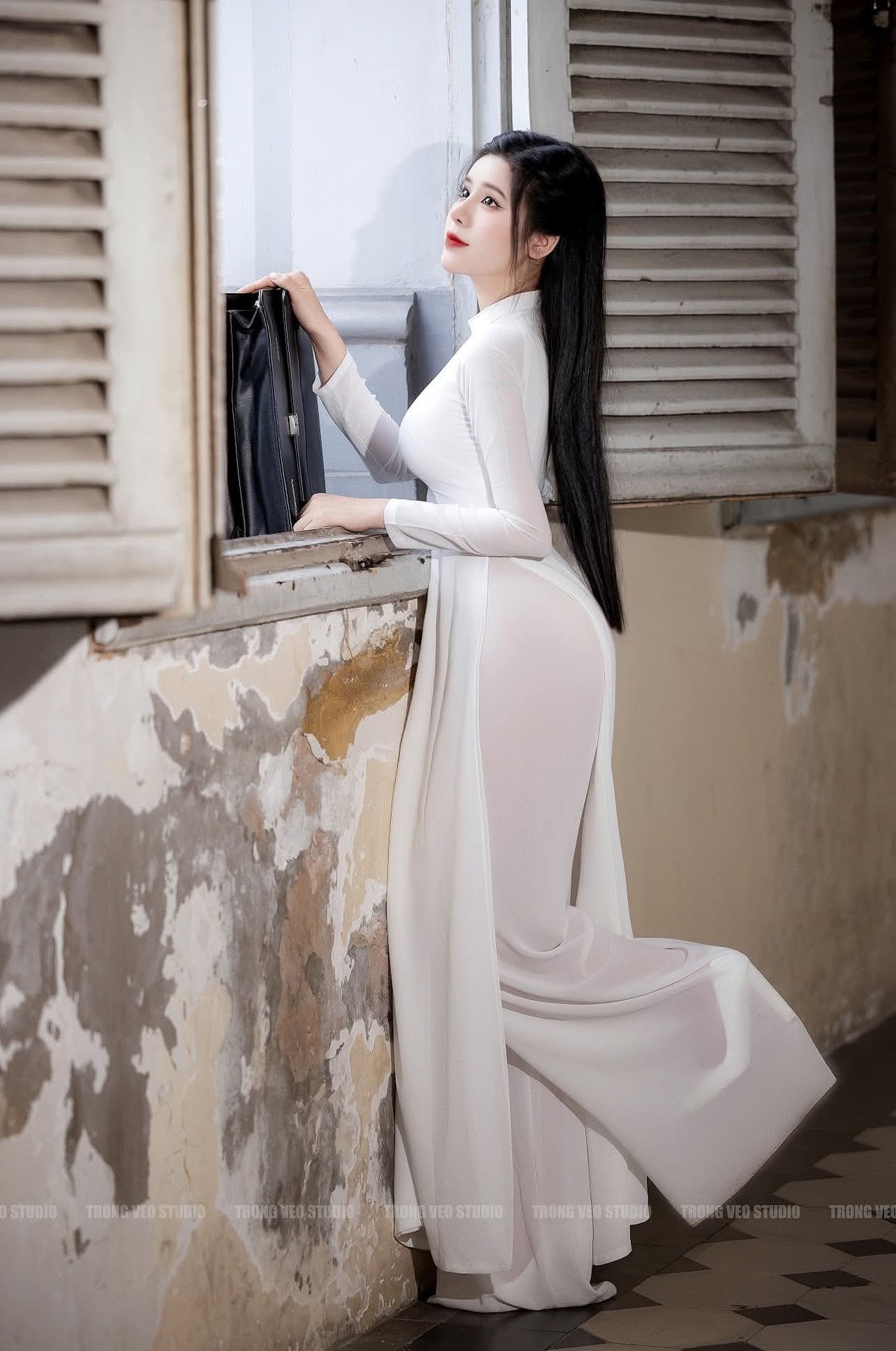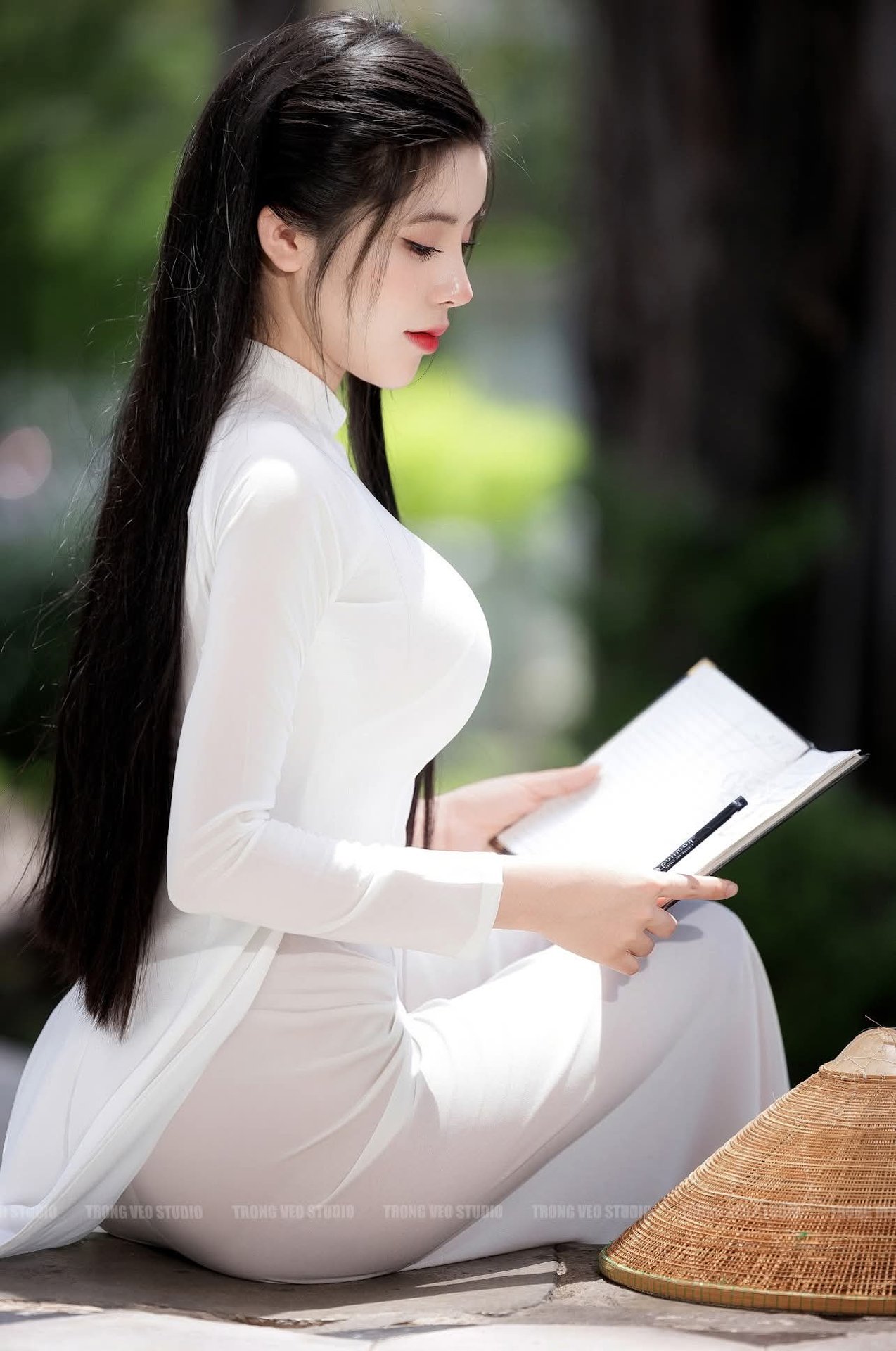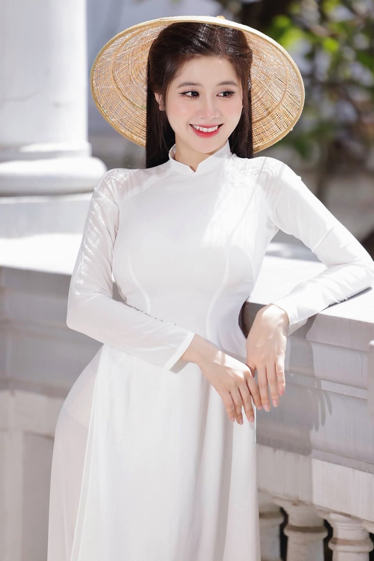 This stunning image captures the graceful moment of a beautiful Vietnamese woman in a pristine white Ao Dai. The traditional Ao Dai dress, a cultural symbol of Vietnam, accentuates her slender figure and gentle beauty. Holding a characteristic conical hat (nón lá) with delicate grace, she exudes elegance and poetic charm. This picture represents the traditional beauty and grace of Vietnamese women, deeply imbued with Vietnamese cultural identity. The photograph is not only an artwork but also an ode to the sophistication of the Ao Dai and the Vietnamese girl. Keywords: Ao Dai Vietnam, beautiful Ao Dai woman, traditional culture, conical hat, Vietnamese female beauty.Innocent Female Student in School Uniform, Youthful Beauty on Tree-Lined Path