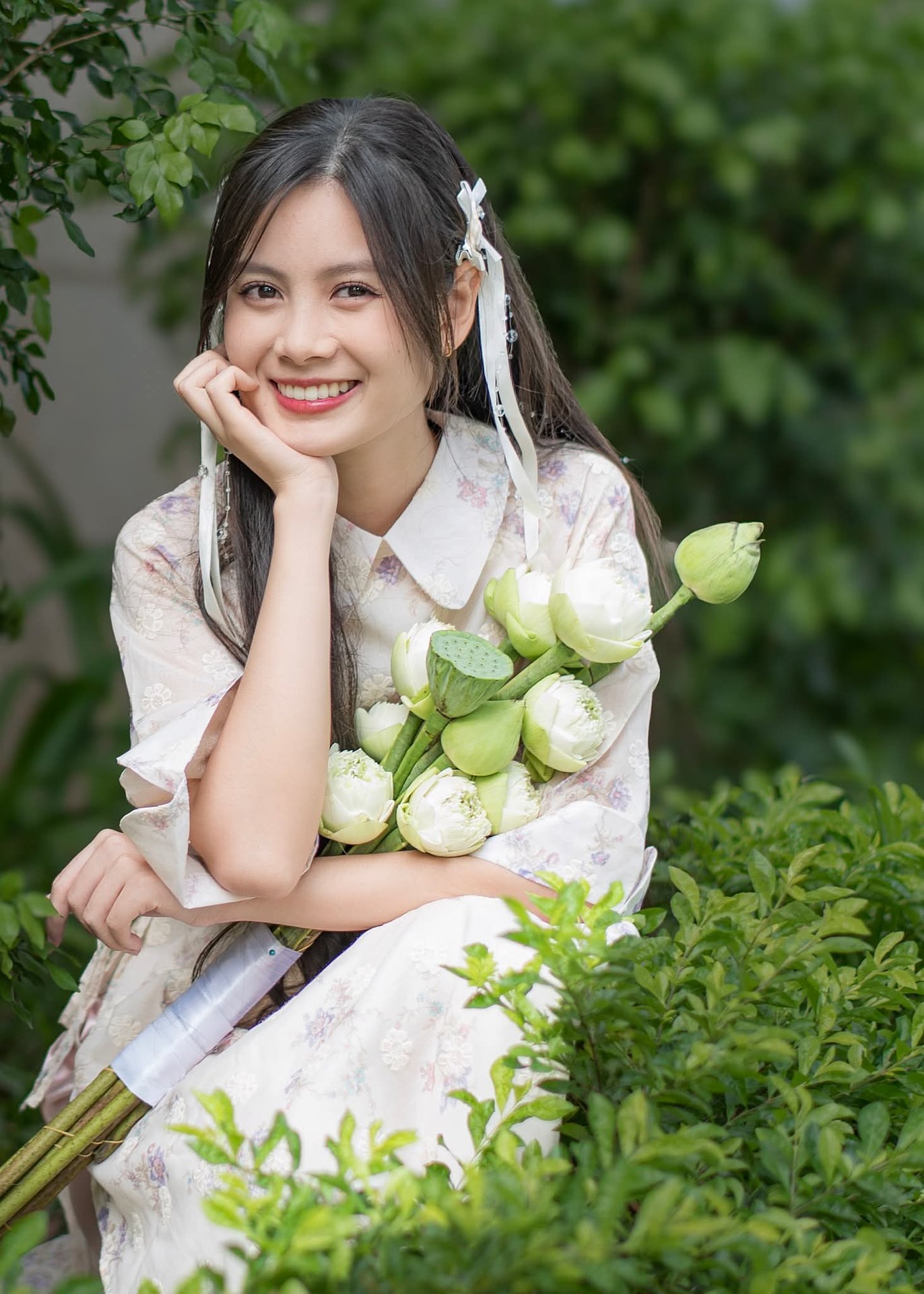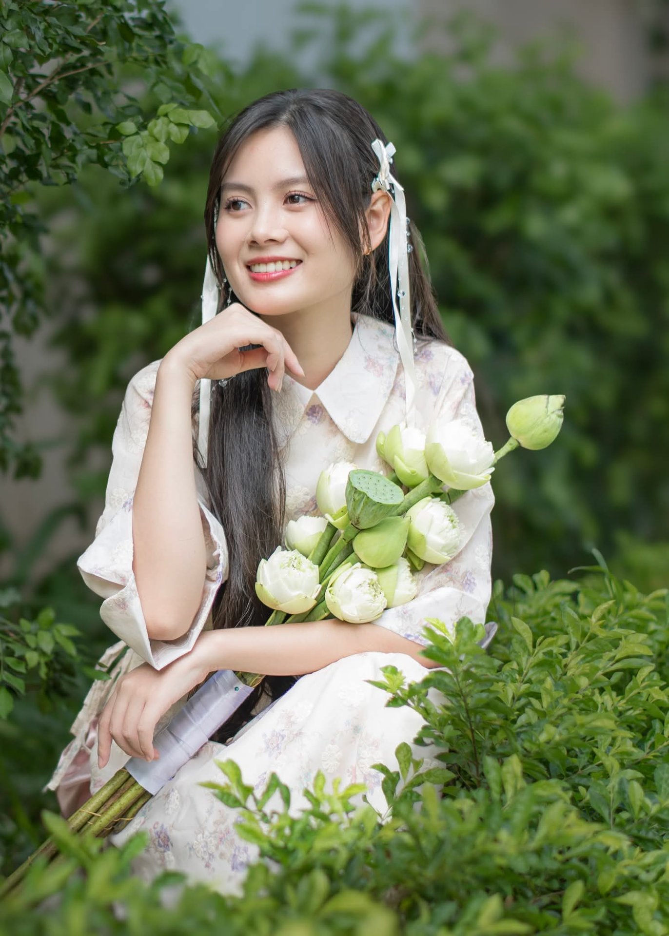 This image captures the gentle ethereal beauty of a young woman in a modern traditional dress sitting amidst lush greenery. Her radiant smile and dreamy gaze exude peace and grace. She holds a bouquet of pristine white lotus flowers a timeless symbol of purity and Vietnamese beauty. The harmonious blend of the girl's charm her elegant attire reminiscent of an ao dai and the national flower creates a truly poetic scene. This is more than just a portrait it is a heartfelt celebration of Vietnamese culture and the traditional beauty gracefully preserved through generations. The photograph evokes feelings of sophistication nobility and fresh vitality showcasing the serene charm of Asian beauty.