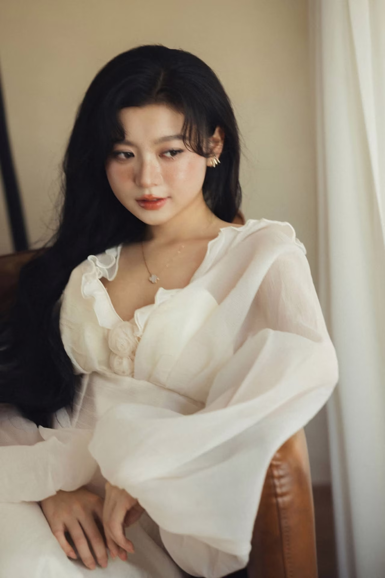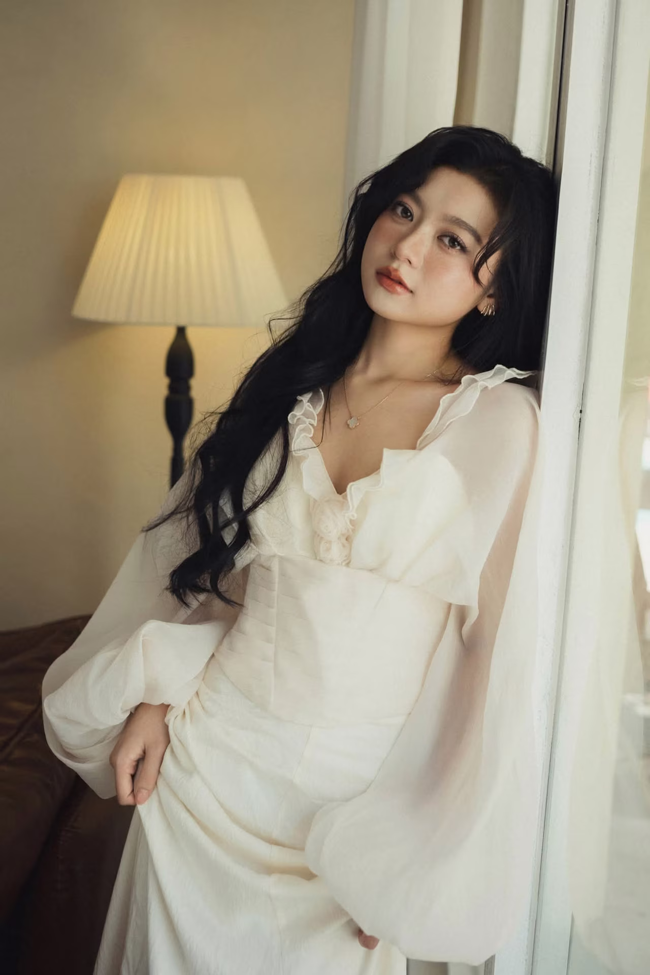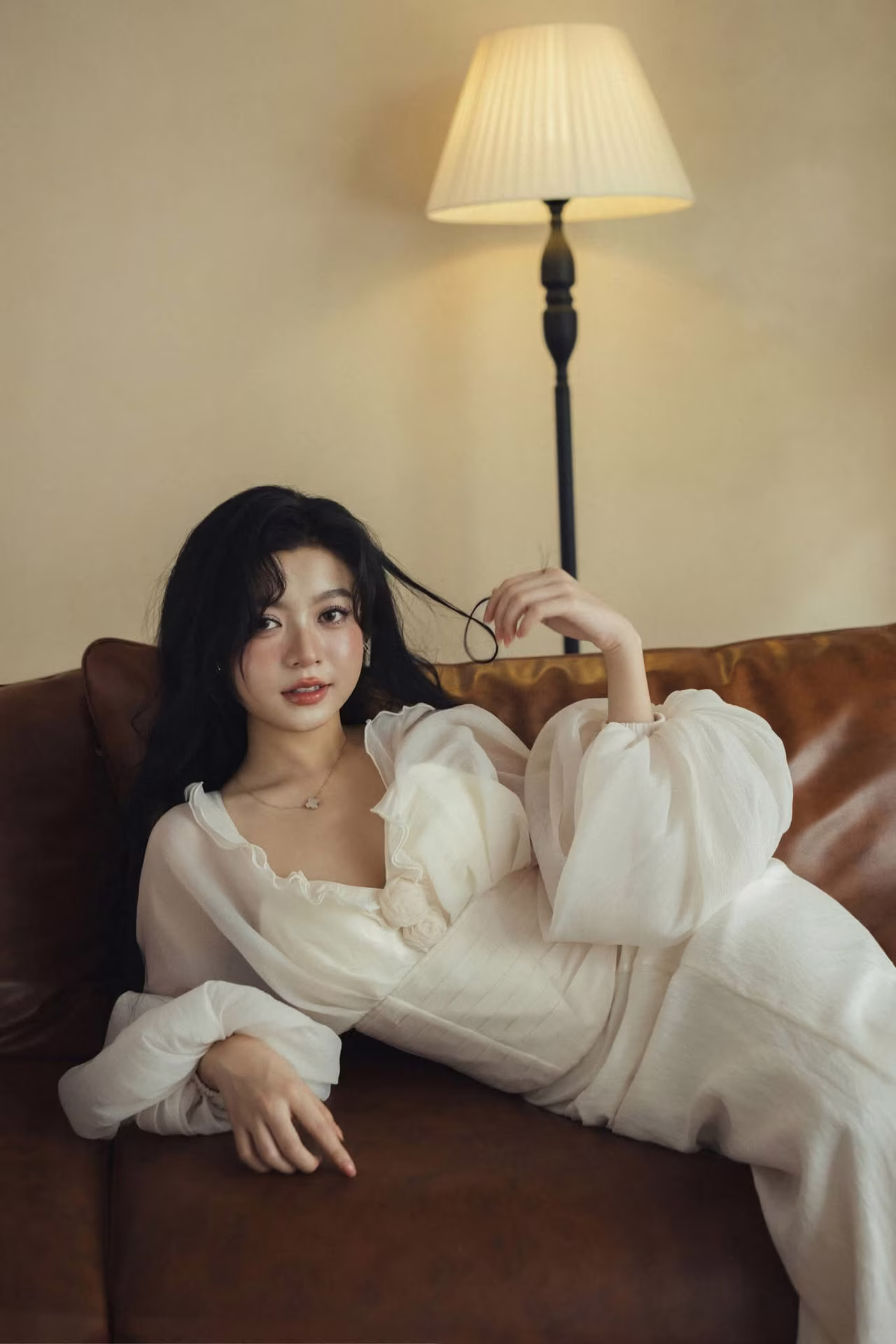 In this VGU No.26 photograph we encounter a captivating serene moment featuring a young Vietnamese woman. She wears a pristine white outfit with voluminous flowing sleeves creating an elegant and ethereal beauty. Her long dark hair cascades naturally highlighting her inherent gentle and graceful charm. The girl reclines comfortably on a soft sofa bathed in warm golden lamplight establishing a romantic and nostalgic ambiance. Her gaze meets the camera exuding confidence while maintaining an innocent purity. This is more than just a portrait it is a narrative of style and inner beauty. The image evokes a sense of peace and tranquility inviting viewers to admire the inherent grace of the modern Vietnamese woman. #Vietnamese #pretty #charmVGU No.20: Graceful Pink Ao Dai Muse Capturing Elegant Vietnamese Beauty Amidst Romantic Autumn Hues