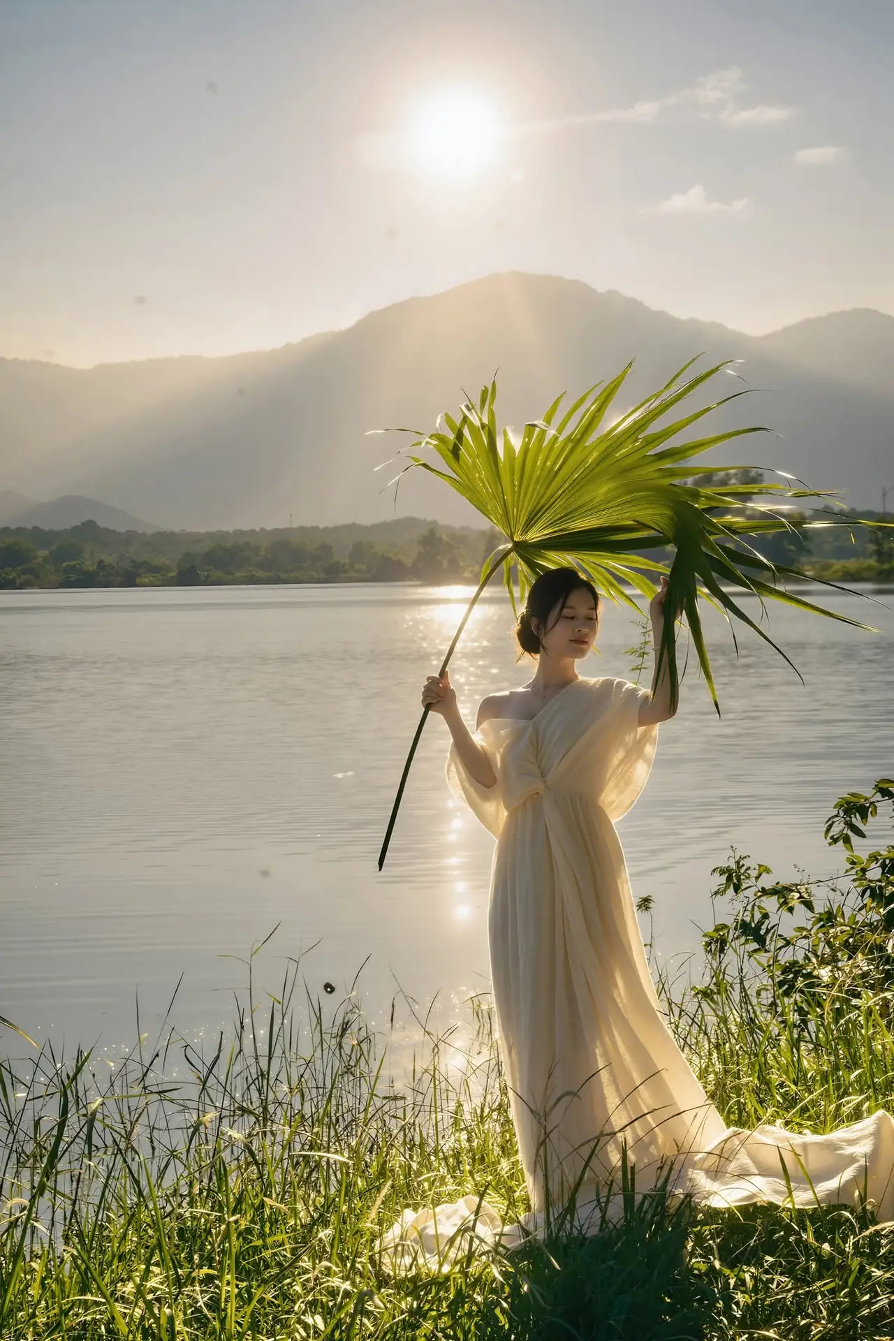 This stunning photograph captures a serene moment of a graceful woman in a pristine white dress lost in thought by the tranquil lakeside. The golden sunset brilliantly casting its light from behind the mountains creates a mesmerizing and ethereal glow upon the shimmering water. She tilts her head back embracing the day's last rays as if merging with the boundless beauty of nature itself. The harmonious blend of her gentle silhouette against the majestic and romantic backdrop of mountains and water evokes a profound sense of peace. It symbolizes freedom pure beauty and a soulful connection with the vast universe.#SunsetPhotography #NatureBeauty #GoldenHour #WhiteDress #LakesideSerenity